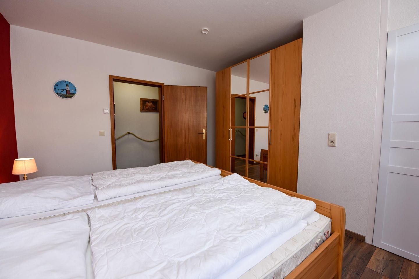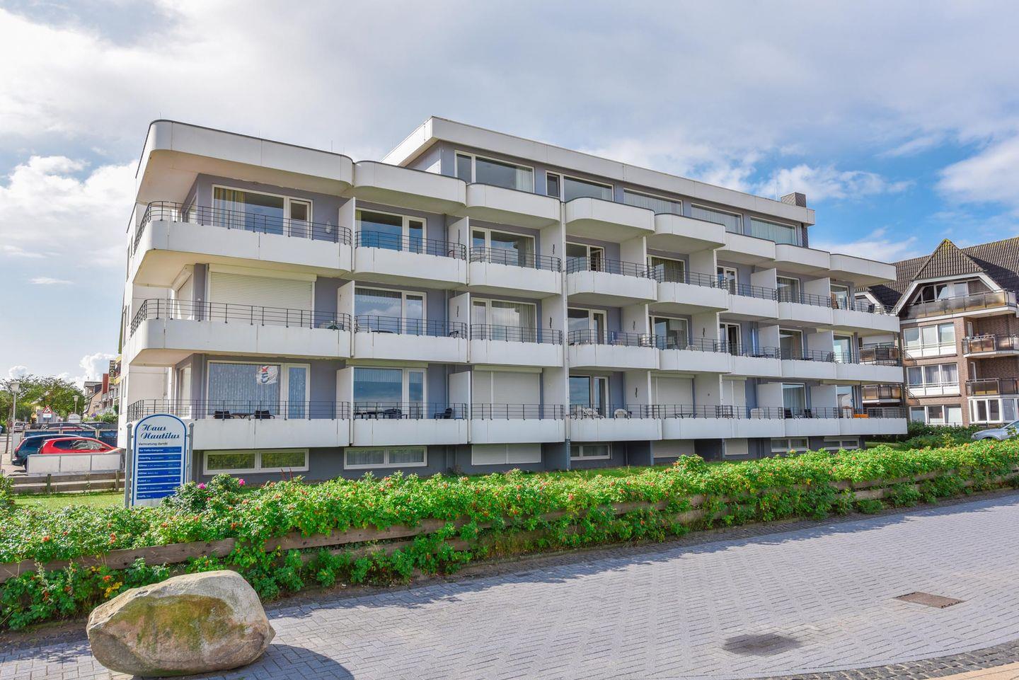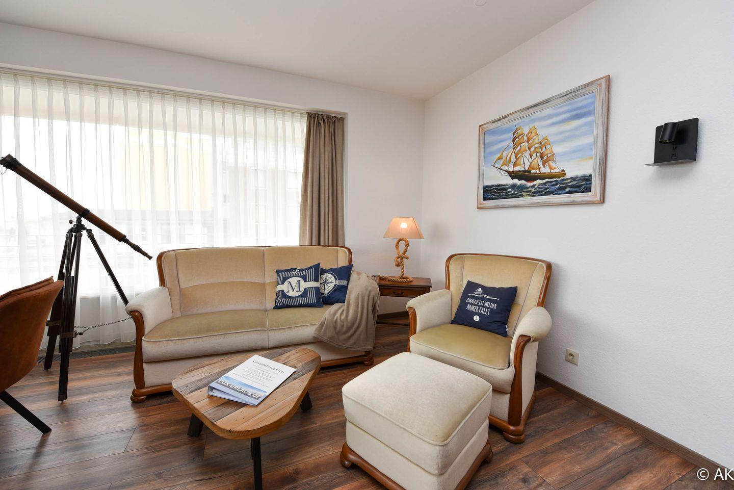 Die 3 Zimmer Eckwohnung Nr. 8 mit separater Küche und Balkon im Haus "Nautilus" liegt im Hochparterre und hat eine direkte Seesicht auf das UNSECO Weltnaturerbe Wattenmeer sowie den Weltschifffahrtweg. Die Wohnung ist aufgeteilt in ein Wohnzimmer, Küche, Schlafzimmer mit Doppelbett und ein Schlafzimmer mit einem Boxspringbett sowie einem Bad mit Dusche und WC.