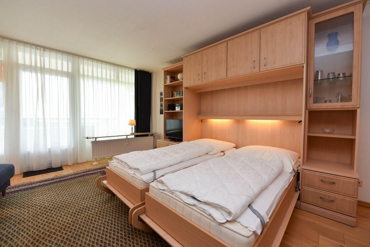 Die komfortable gestaltete Ferienwohnung umfasst einen kombinierten Wohn- und Schlafbereich, ausgestattet mit praktischen Schrankklappbetten für eine maximale Raumausnutzung. Die integrierte Küchenzeile ist mit allem ausgestattet, was Sie für Ihren Aufenthalt benötigen: ein Kühlschrank, eine Kaffeemaschine, ein Wasserkocher, ein Toaster sowie ein E-Herd mit Cerankochfeld stehen Ihnen zur Verfügung. Genießen Sie Ihre Lieblingssendungen auf unserem Flachbildfernseher und profitieren Sie von dem Komfort eines neu renovierten Bades mit einer bodentiefen Dusche und WC.