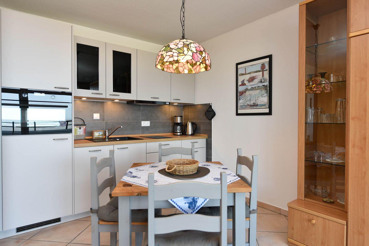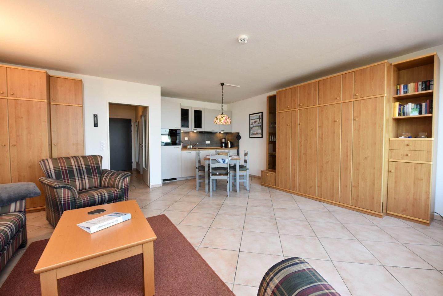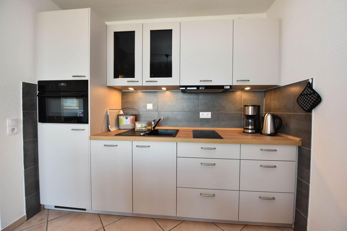 Der kombinierte Wohn- und Schlafraum ist mit einem praktischen Schrankklappbett ausgestattet. Die neue Küchenzeile verfügt über einen Kühlschrank, eine Filterkaffeemaschine, einen Toaster, einen Wasserkocher, eine Spülmaschine sowie ein Backofen-Mikrowellen-Kombigerät. Ein Flachbildfernseher steht für Ihre Unterhaltung bereit.