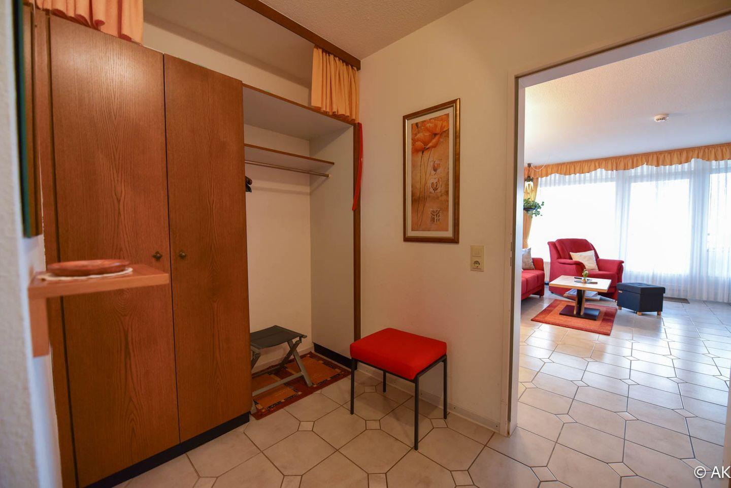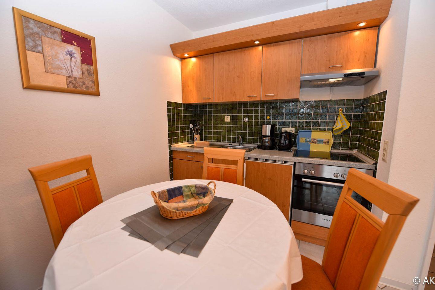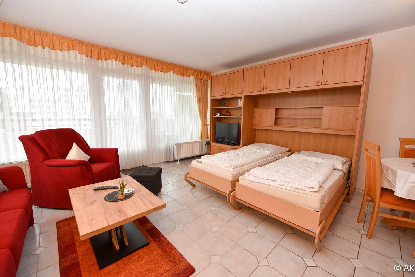 1 Wohn-/Schlafraum mit Schrankklappbetten; Küchenzeile mit Kühlschrank, Kaffeemaschine, E-Herd; Flachbildfernseher vorhanden; Bad mit Dusche und WC; Pkw-Tiefgaragenstellplatz; Lage: 3. Etage mit Balkon, Seesicht