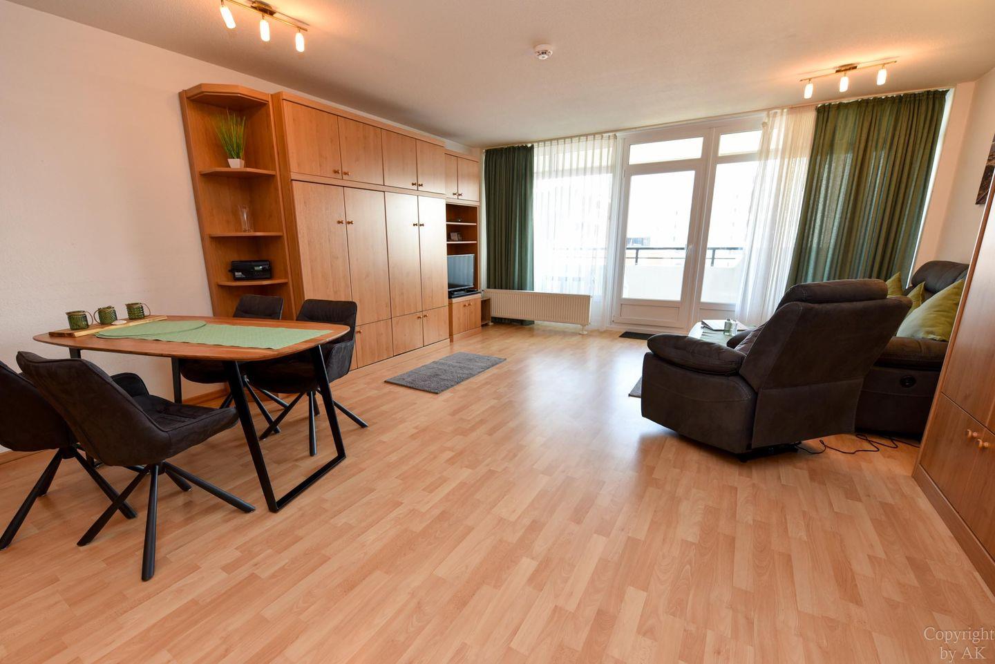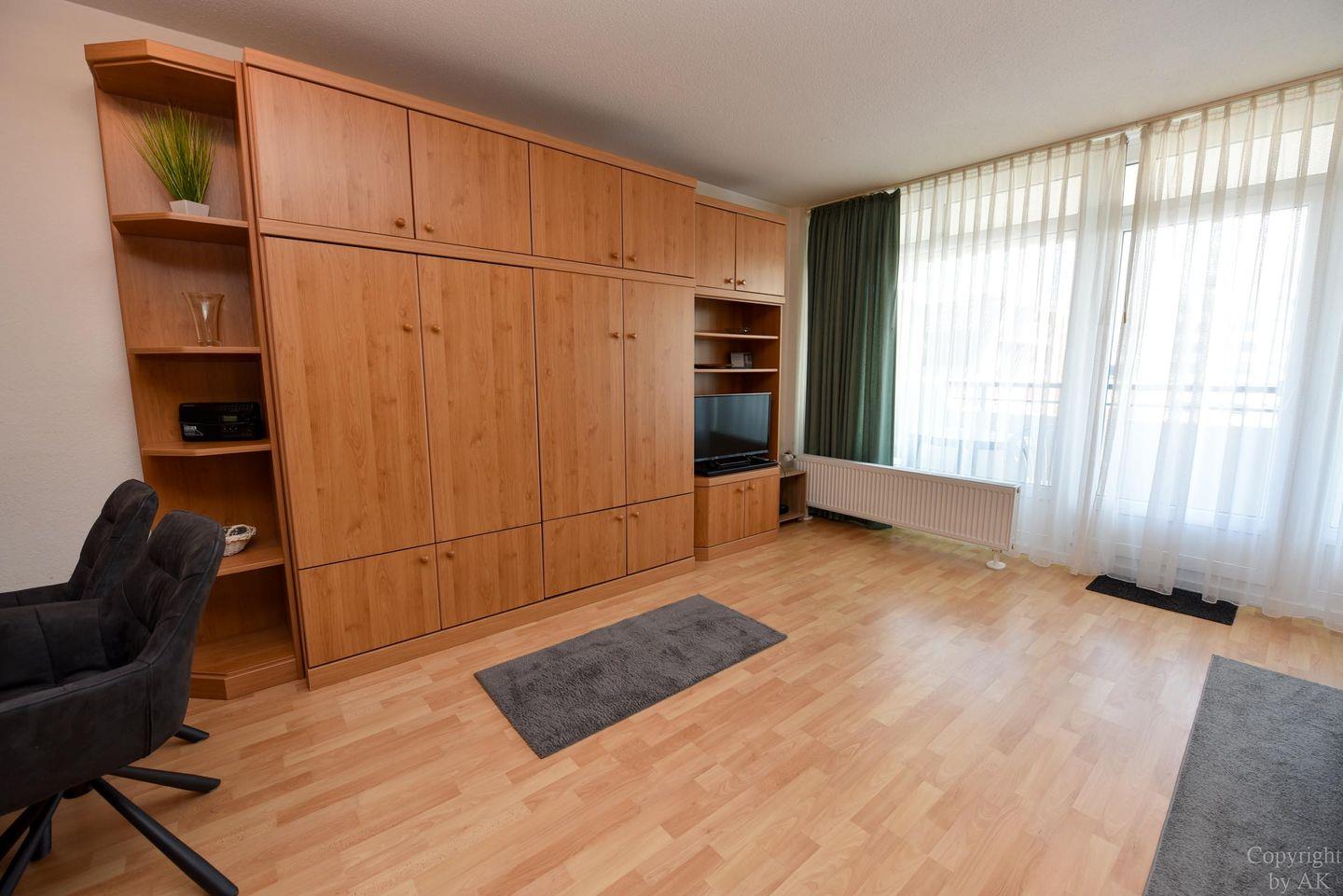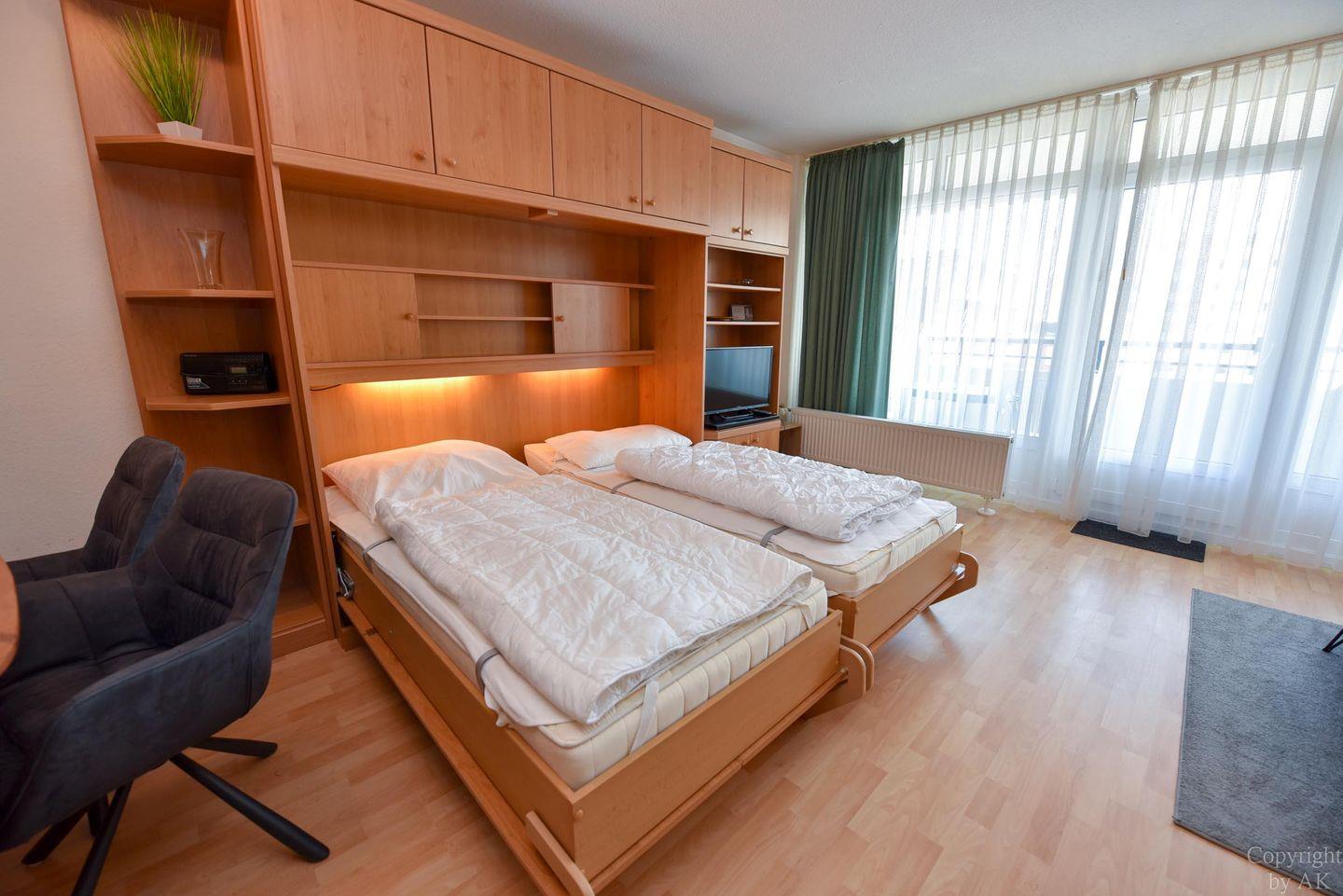 1 Wohn-/Schlafzimmer mit Schrankklappbetten; Küchenzeile mit Kühlschrank, Kaffeemaschine, E-Herd; Flachbildfernseher vorhanden; Bad mit Dusche und WC; Pkw-Tiefgaragenstellplatz. Lage: 3. Etage, Seesicht vom Balkon