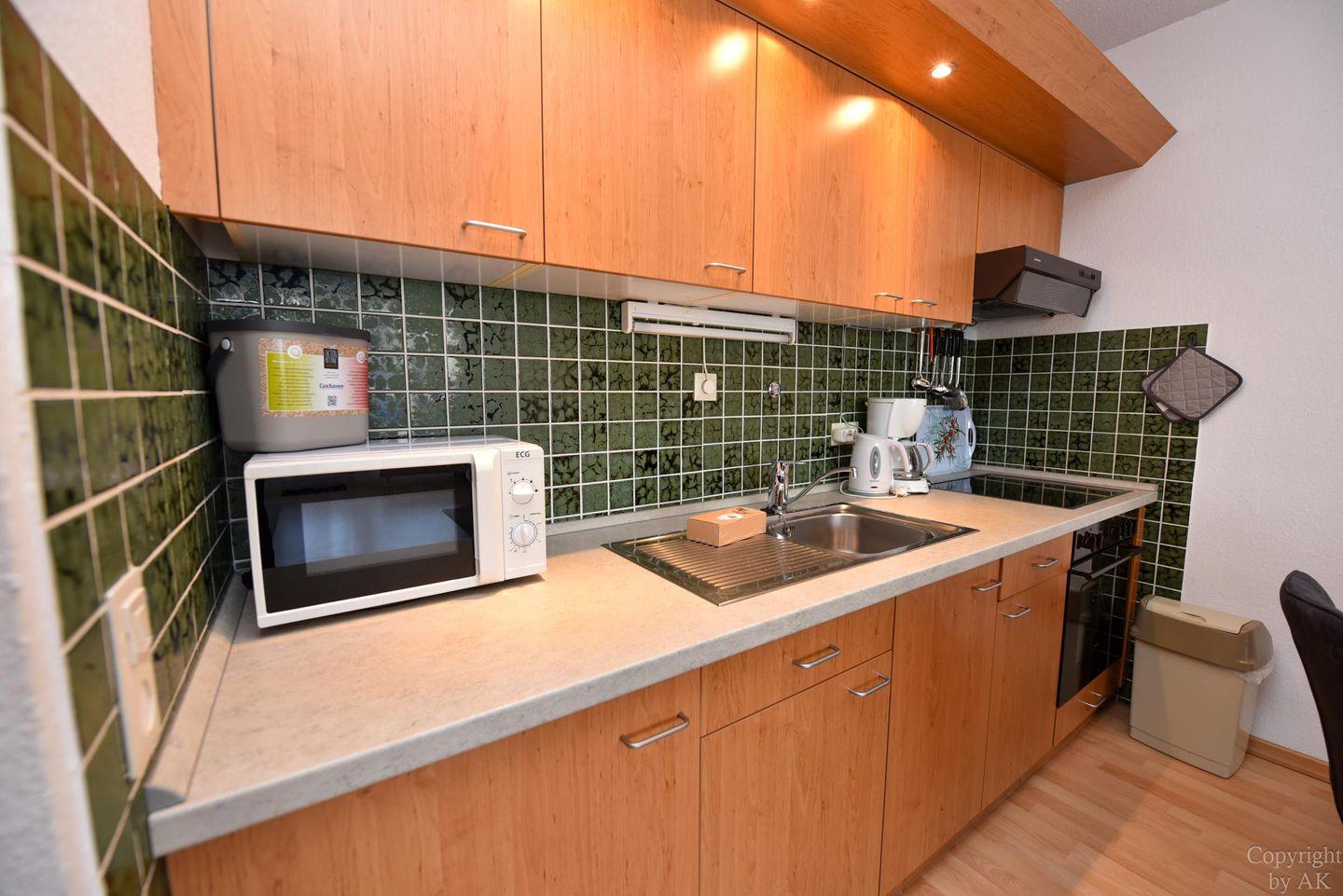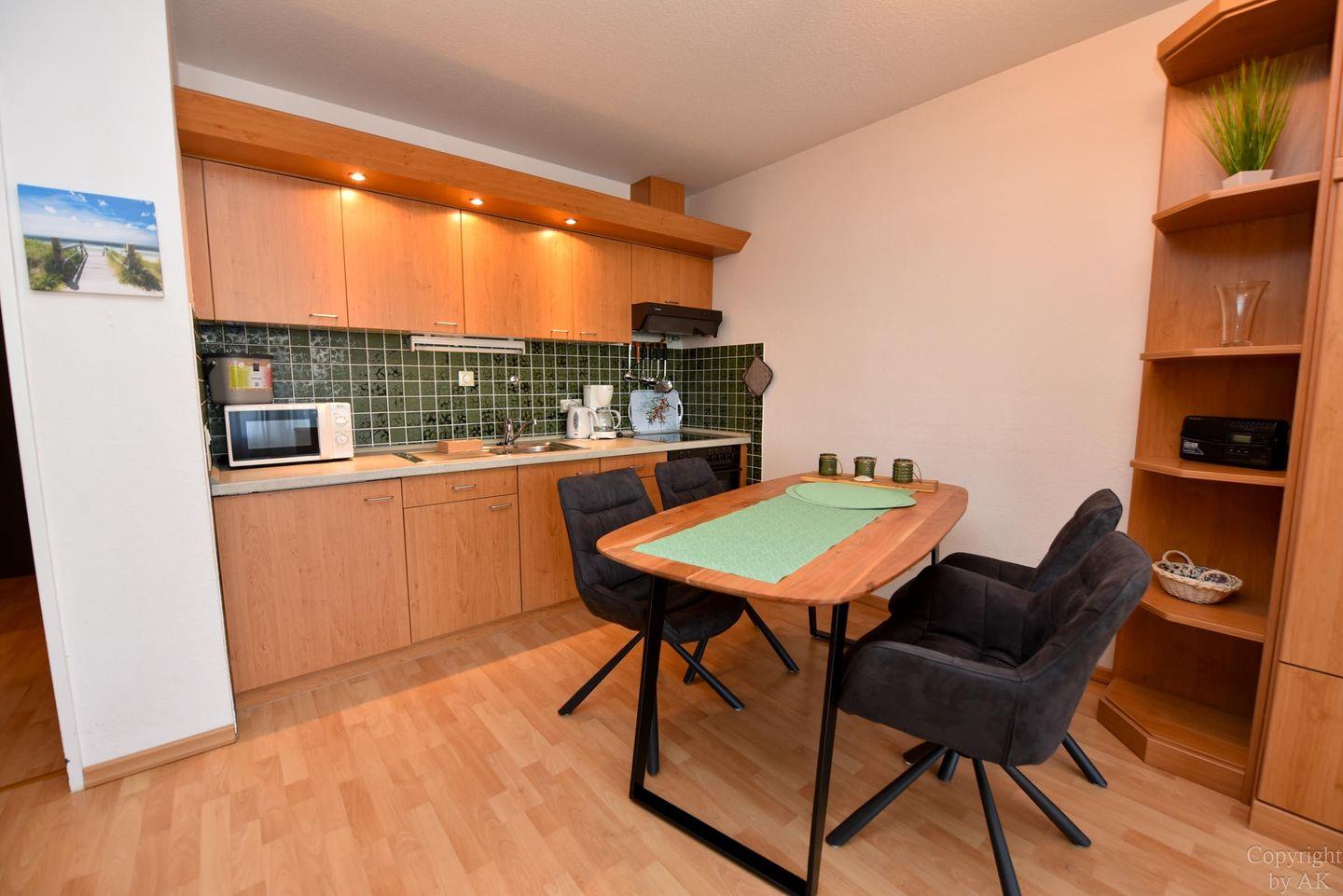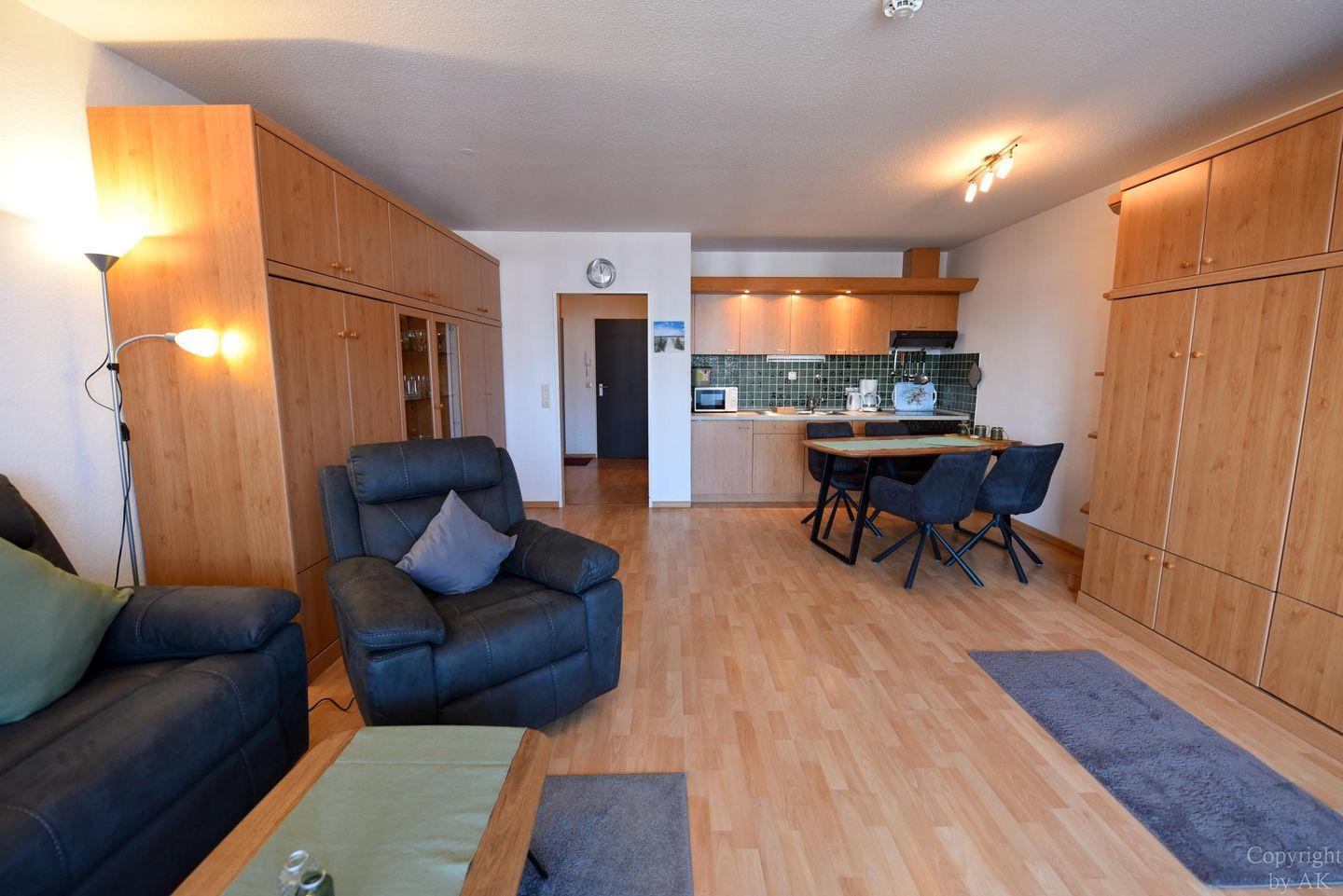 1 Wohn-/Schlafzimmer mit Schrankklappbetten; Küchenzeile mit Kühlschrank, Kaffeemaschine, E-Herd; Flachbildfernseher vorhanden; Bad mit Dusche und WC; Pkw-Tiefgaragenstellplatz. Lage: 3. Etage, Seesicht vom Balkon