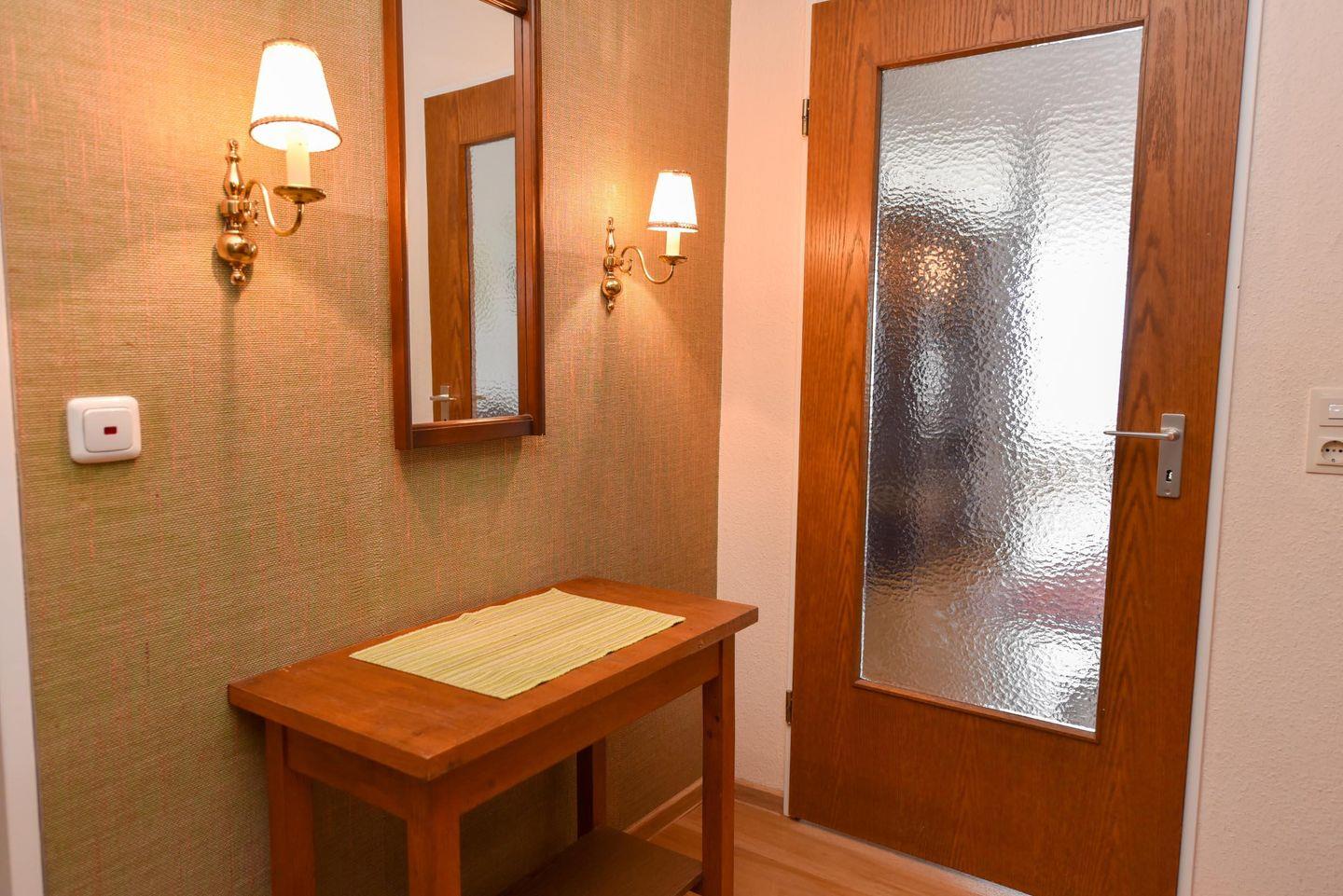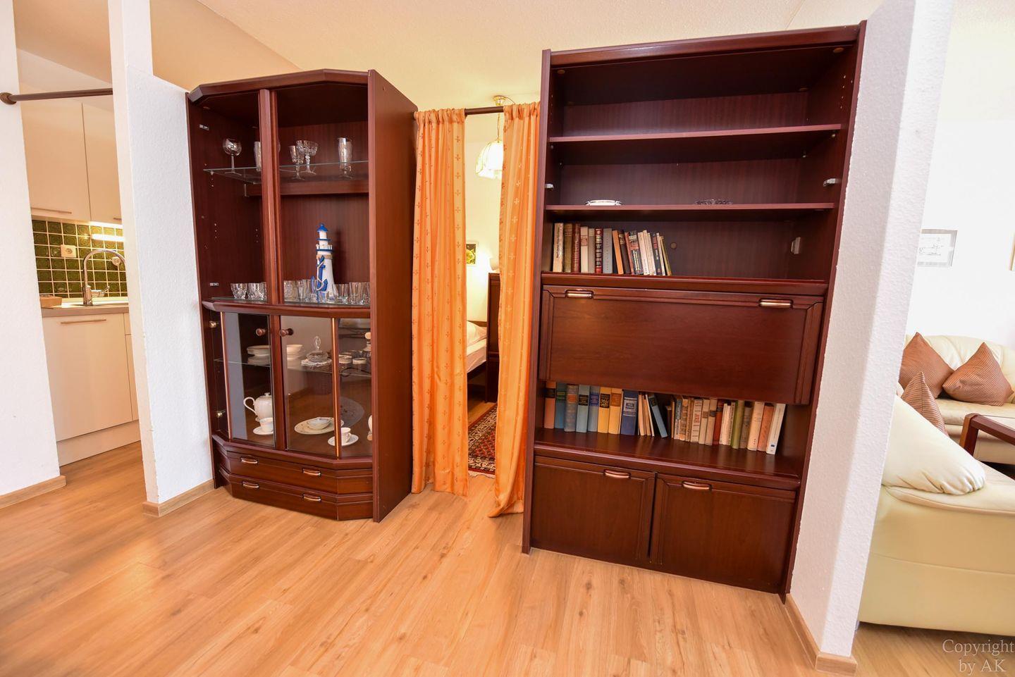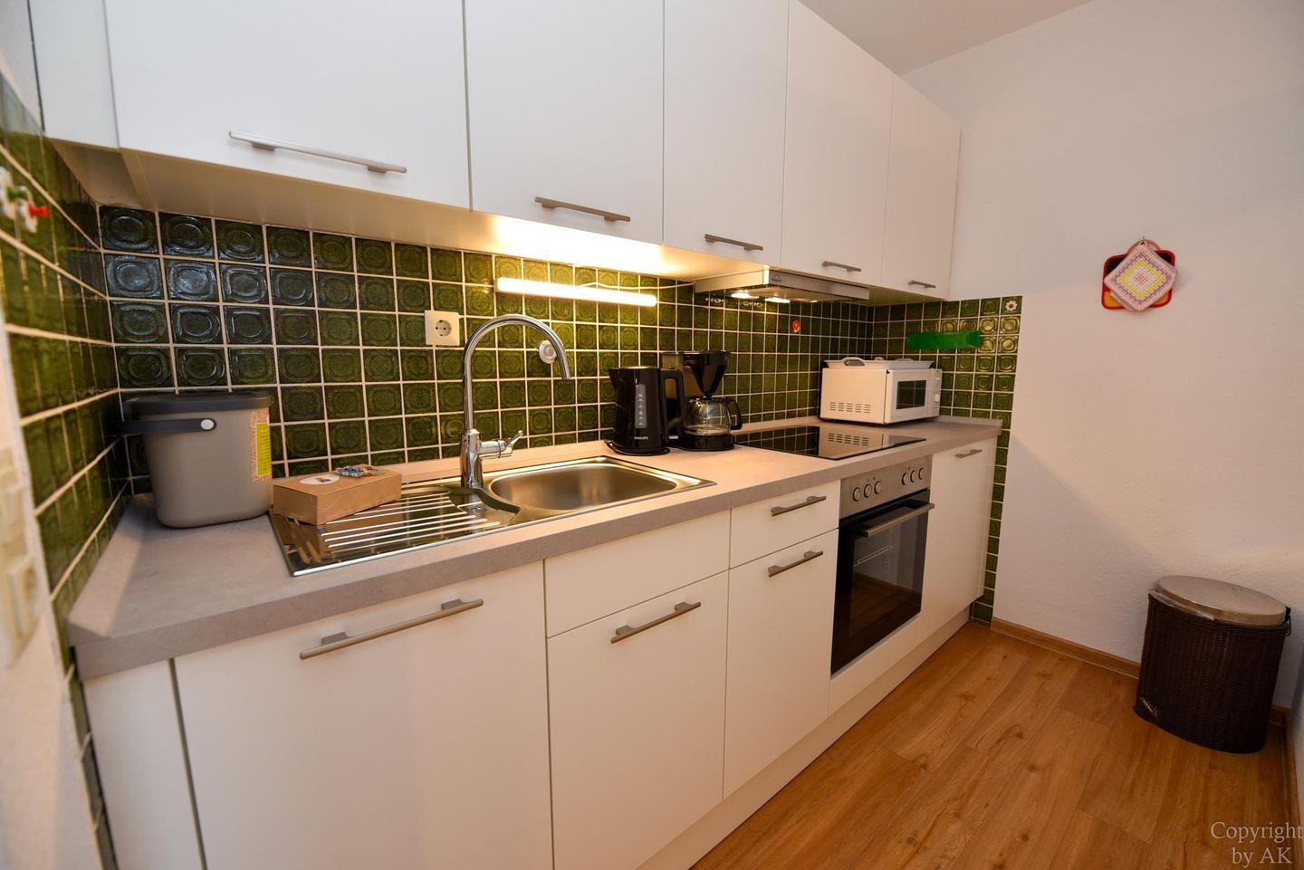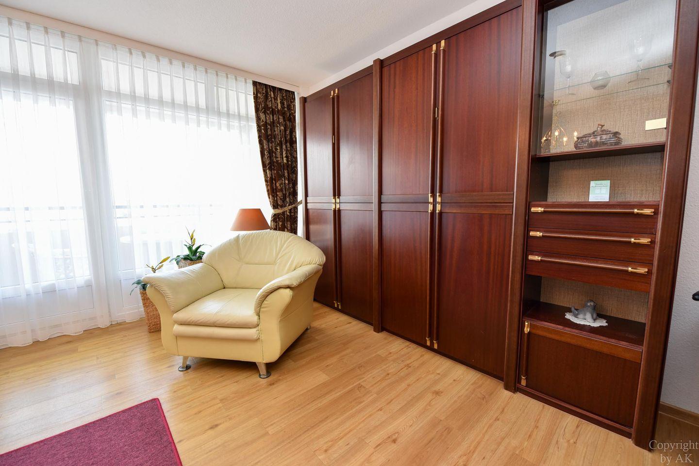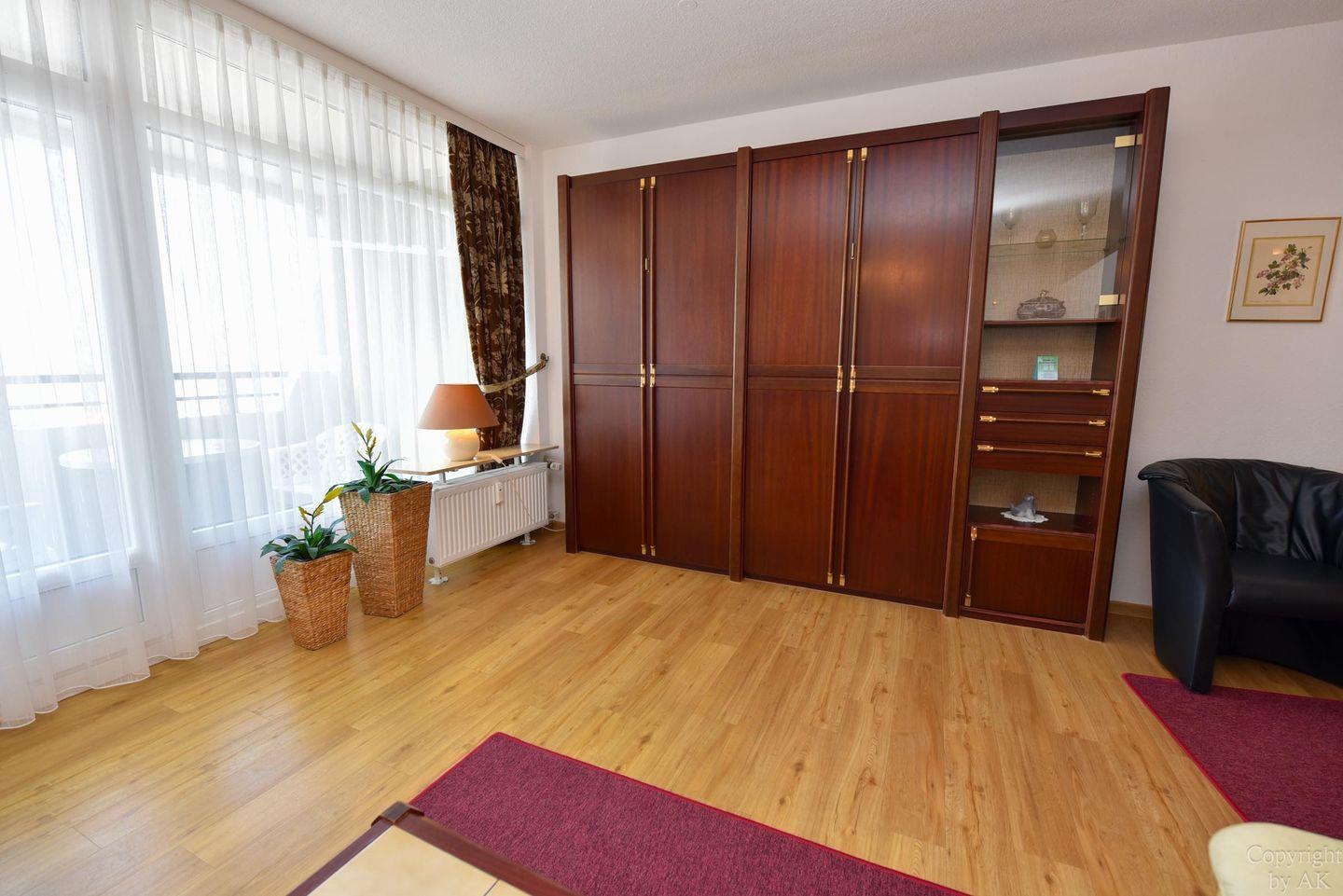 1 Wohnzimmer, 1 Schlafnische mit 2 Einzelbetten; Küchenzeile mit Kühlschrank, Kaffeemaschine, E-Herd; Flachbildfernseher vorhanden; Bad mit Dusche und WC; Pkw-Tiefgaragenstellplatz. Lage: 4. Etage mit Balkon, Seesicht