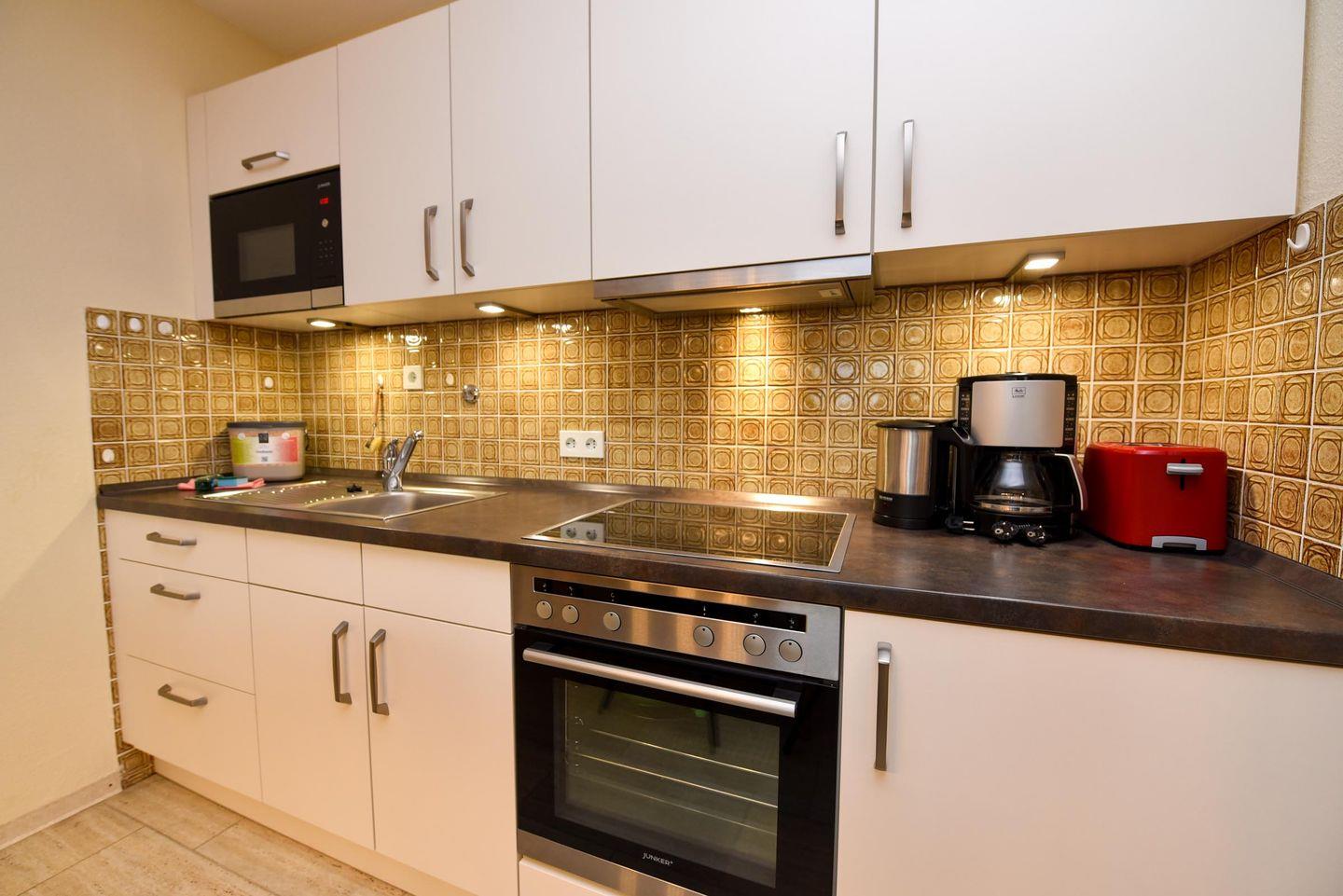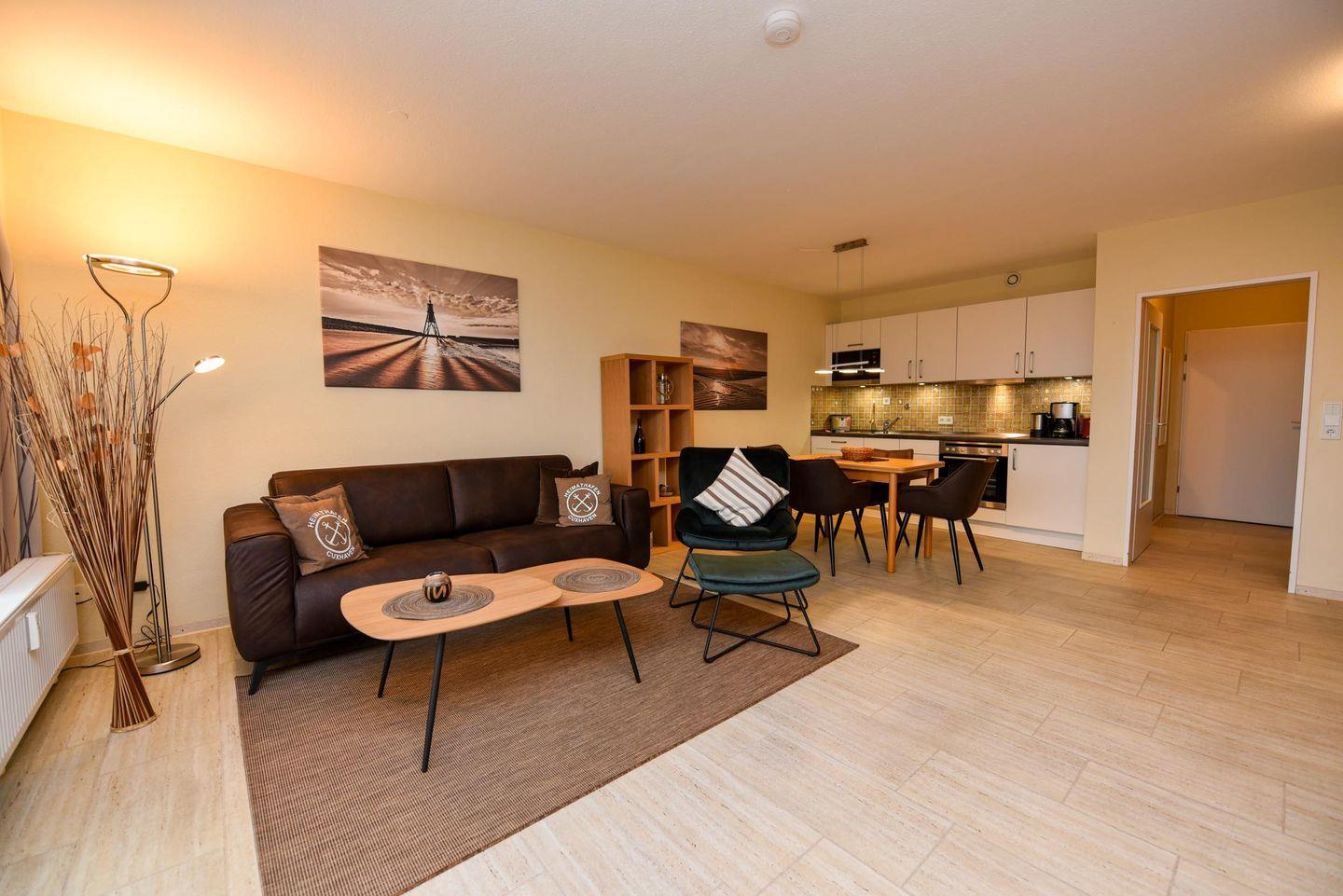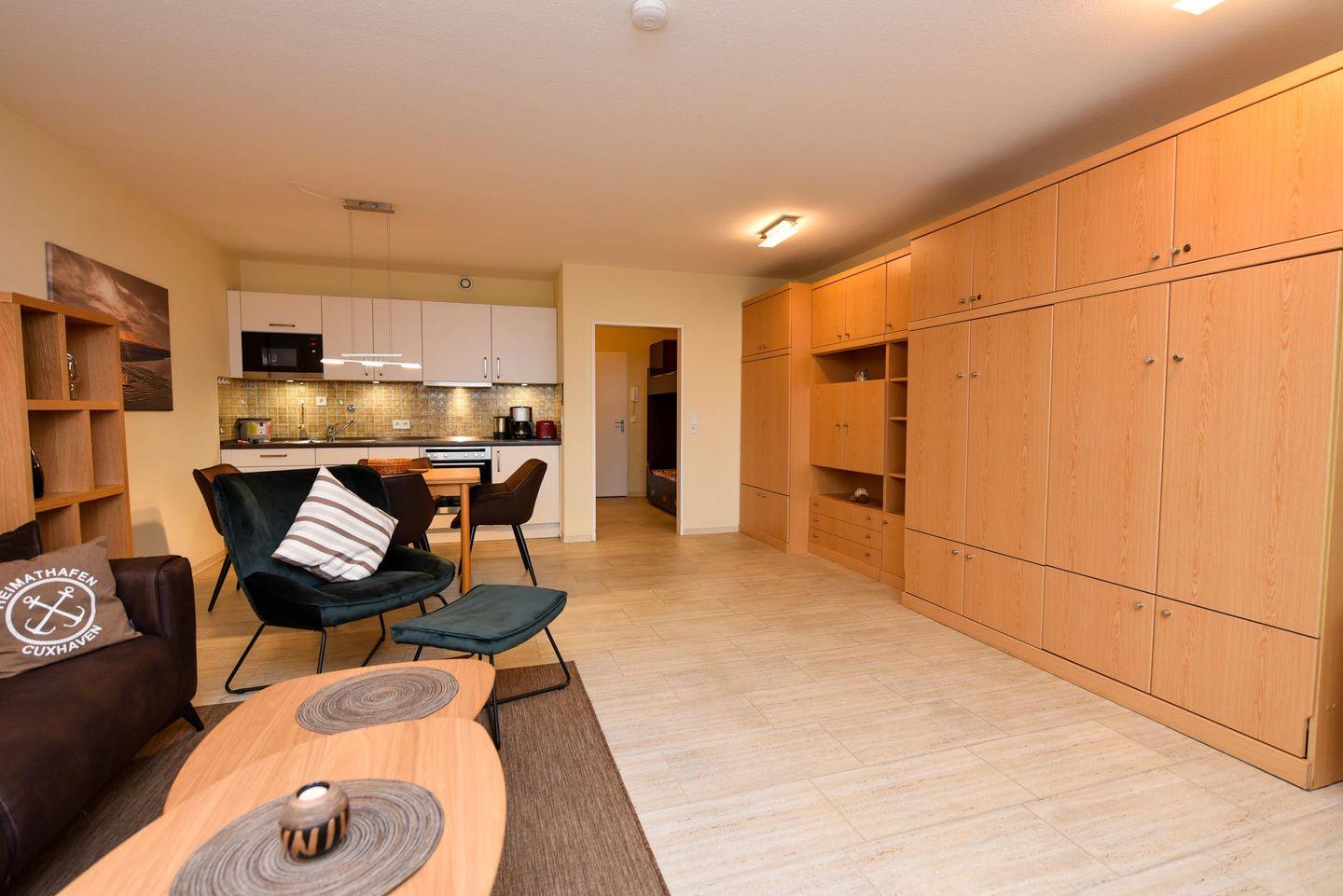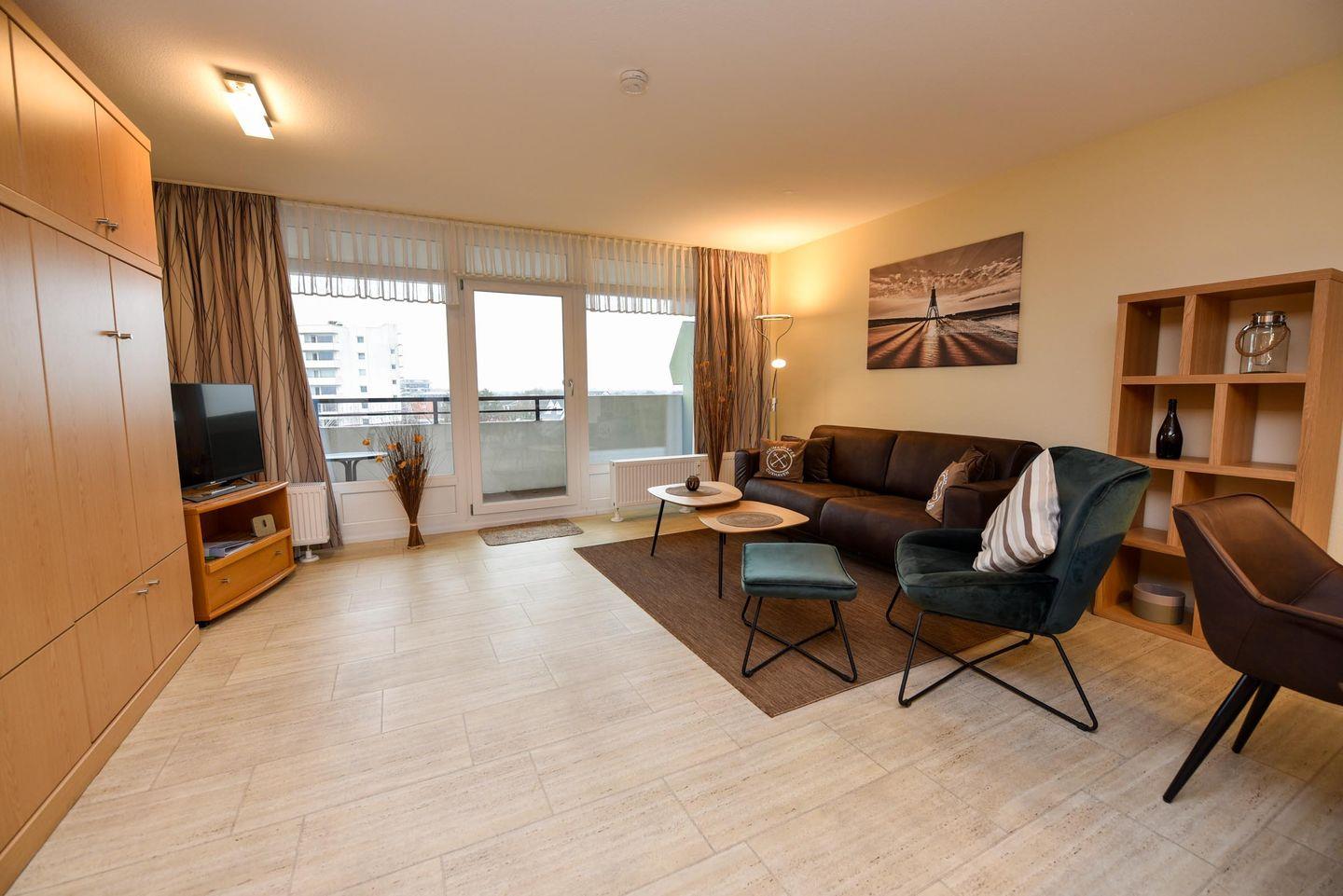 Die in der 4. Etage gelegene Wohnung mit Balkon und Seesicht ist aufgeteilt in einen Wohn-/Schlafraum mit Schrankklappbetten und Küchenzeile mit Kühlschrank, Kaffeemaschine, Wasserkocher, Mikrowelle, Toaster, E-Herd; Flachbildfernseher ist vorhanden; Bad mit Dusche und WC; Balkon. Pkw-Tiefgaragenstellplatz.