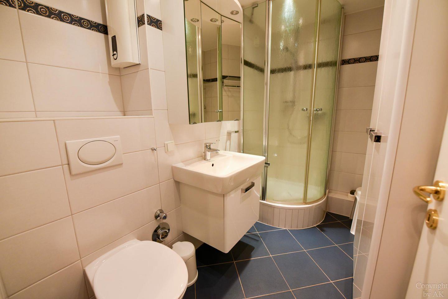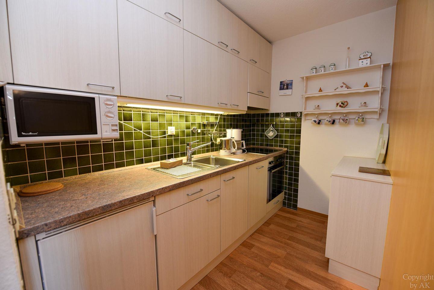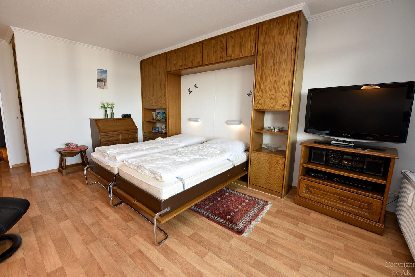 Unser schönes Apartment bietet Ihnen einen kombinierten Wohn-/Schlafraum, ausgestattet mit zwei komfortablen Schrankklappbetten für optimale Raumnutzung. Die integrierte Küchenzeile ist mit Annehmlichkeiten wie Kühlschrank, Kaffeemaschine, Wasserkocher, Toaster und einem E-Herd mit Cerankochfeld und Mikrowelle ausgestattet, damit Ihre kulinarischen Erlebnisse nicht zu kurz kommen.
