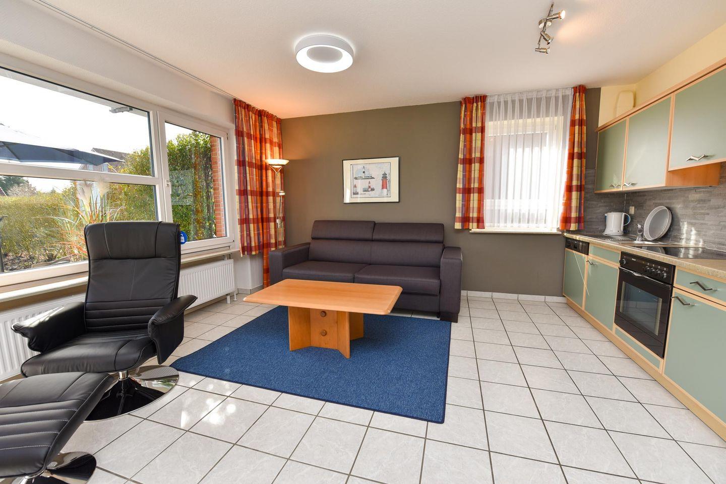 Die Wohnung Nr. 1 im Haus "Seeland 2" ist für bis zu 4 Personen ausgestattet und befindet sich ebenerdig mit einer schönen, sonnigen Südterrasse. In dem geräumigen Wohn-/Essraum befindet sich u.a. ein bequemes Sofa (140cm x 200cm) mit Schlaffunktion, welches sich im Handumdrehen in ein Gästebett umwandeln lässt. So bereiten Sie im Nu ein zusätzliches komfortables Nachtlager. Am nächsten Morgen bauen Sie das Bett ganz einfach wieder zum Sofa um und nehmen bequem Platz. Die voll ausgestattete Küchenzeile inkl. Geschirrspüler, E-Herd mit Cerankochfeld, Wasserkocher, Toaster und Kaffeemaschine bietet alles was Sie zum zaubern einer Mahlzeit benötigen. Im Schlafzimmer befindet sich ein 180cm breites Doppelbett, sowie ein geräumiger Kleiderschrank. Das große und helle Badezimmer verfügt über eine bodentiefe und barrierefreie Dusche.