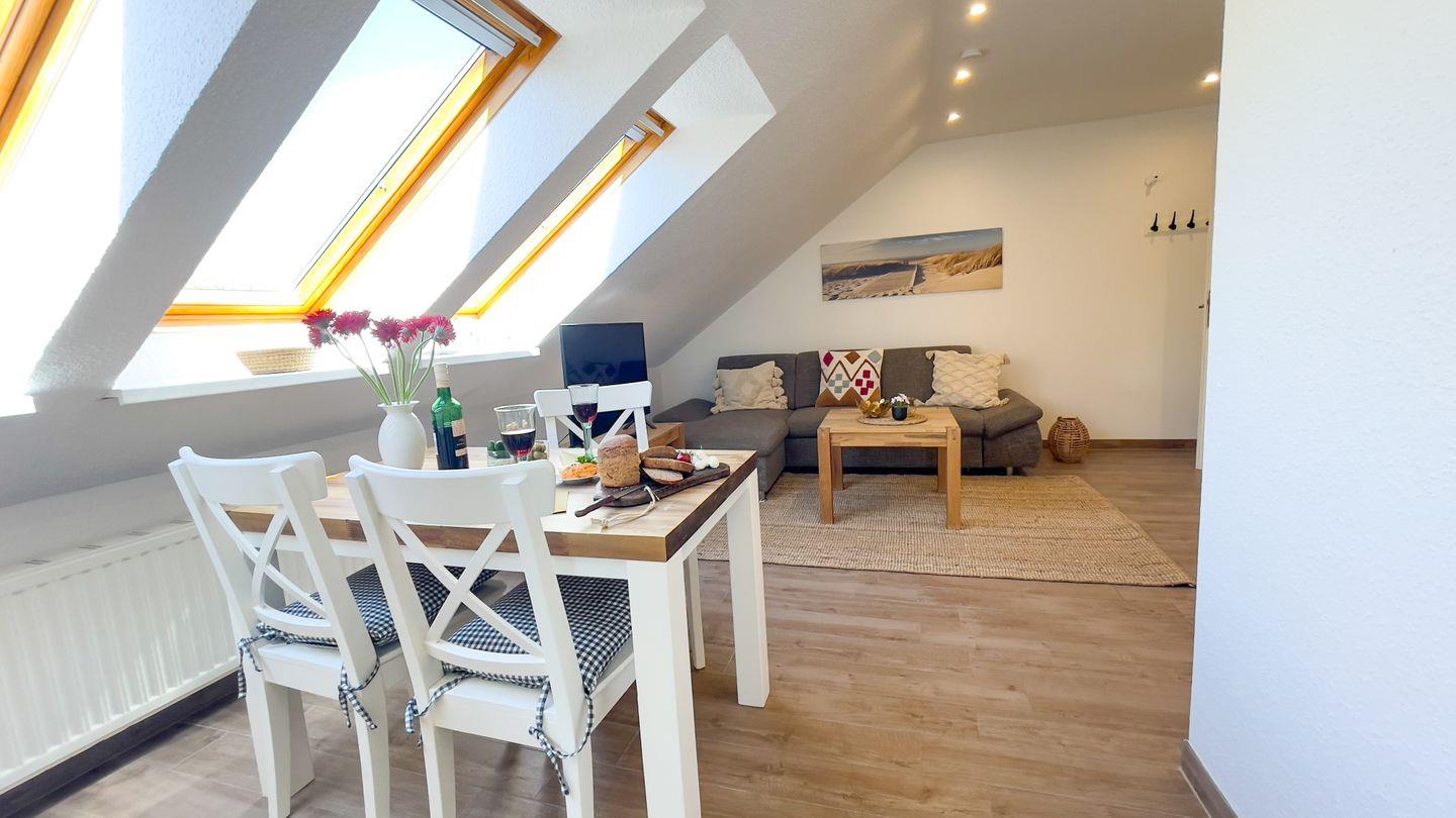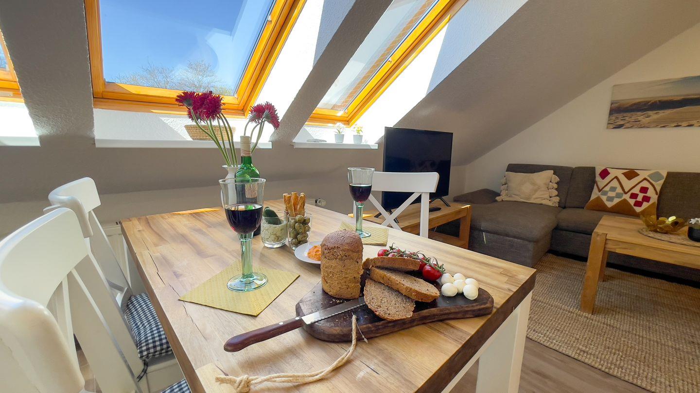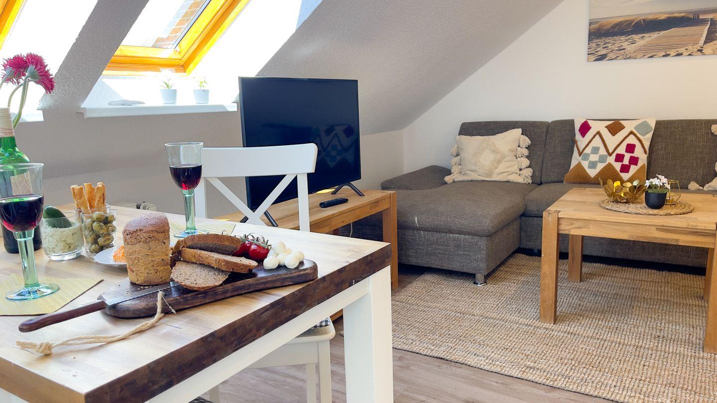 Mit einer Fläche von 40 m² bietet die Ferienwohnung Platz für bis zu vier Personen. Sie befindet sich im ersten Stock eines freistehenden Hauses und empfängt Sie mit einer einladenden Atmosphäre. Im Wohnbereich finden Sie ein komfortables Schlafsofa, das zum Verweilen einlädt, sowie einen Esstisch für gemeinsame Mahlzeiten.