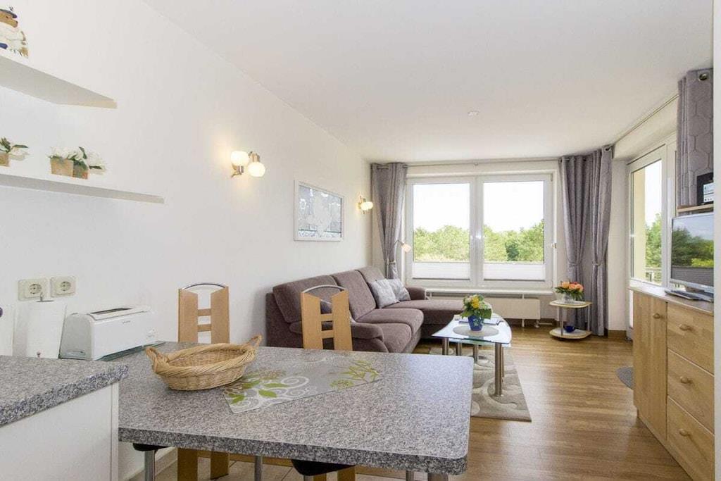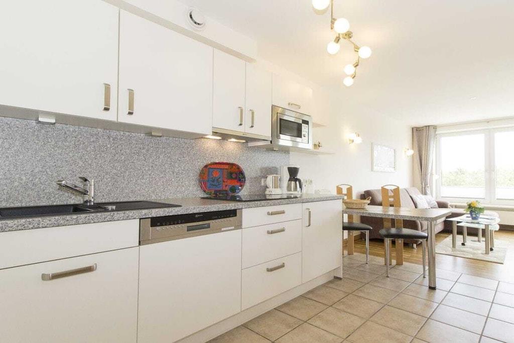 Haus Kurpark-Residenz, Lejlighed 204 med delvis søudsigt til 3-4 personer, 47 m², østvendt (mod "Kugelbake"), opholdsstue med sovesofa og fladskærms-tv med DVD, separat soveværelse med vindue til altan, dobbeltseng (180x200) og 2. TV med DVD, nyt køkkenhjørne med opvaskemaskine, opvaskemaskine, internetopvaskemaskine, WC, WC, ikke-ryger lejlighed, underjordisk parkeringsplads, privat strandstol fra midten af april til midten af oktober En rummelig indendørs pool med modstrømssystem og forskellige saunaer tilbyder motion og afslapning. Et bordtennisrum, en cykelkælder og en separat solterrasse fuldender tilbuddet. Møntstyrede vaskemaskiner og tørretumblere er også tilgængelige.