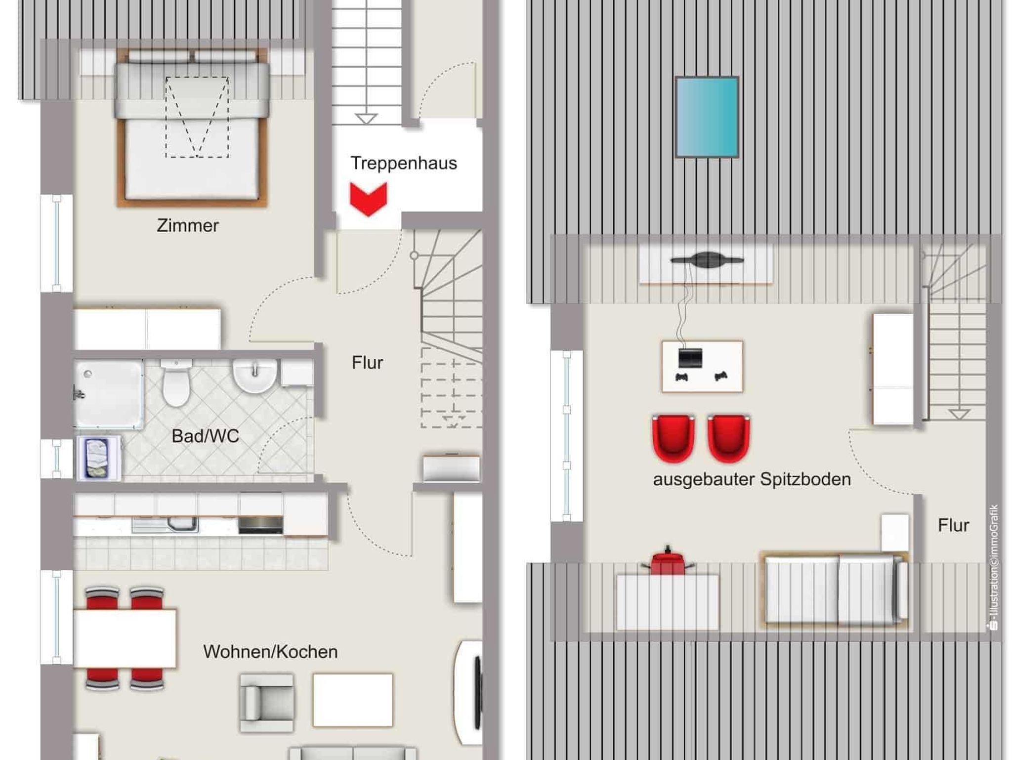 befindet sich Dachgeschoss. Die Wohnung verfügt über eine Fußbodenheizung.