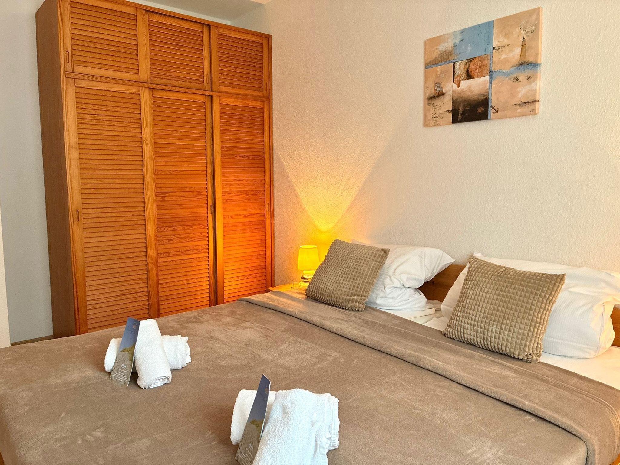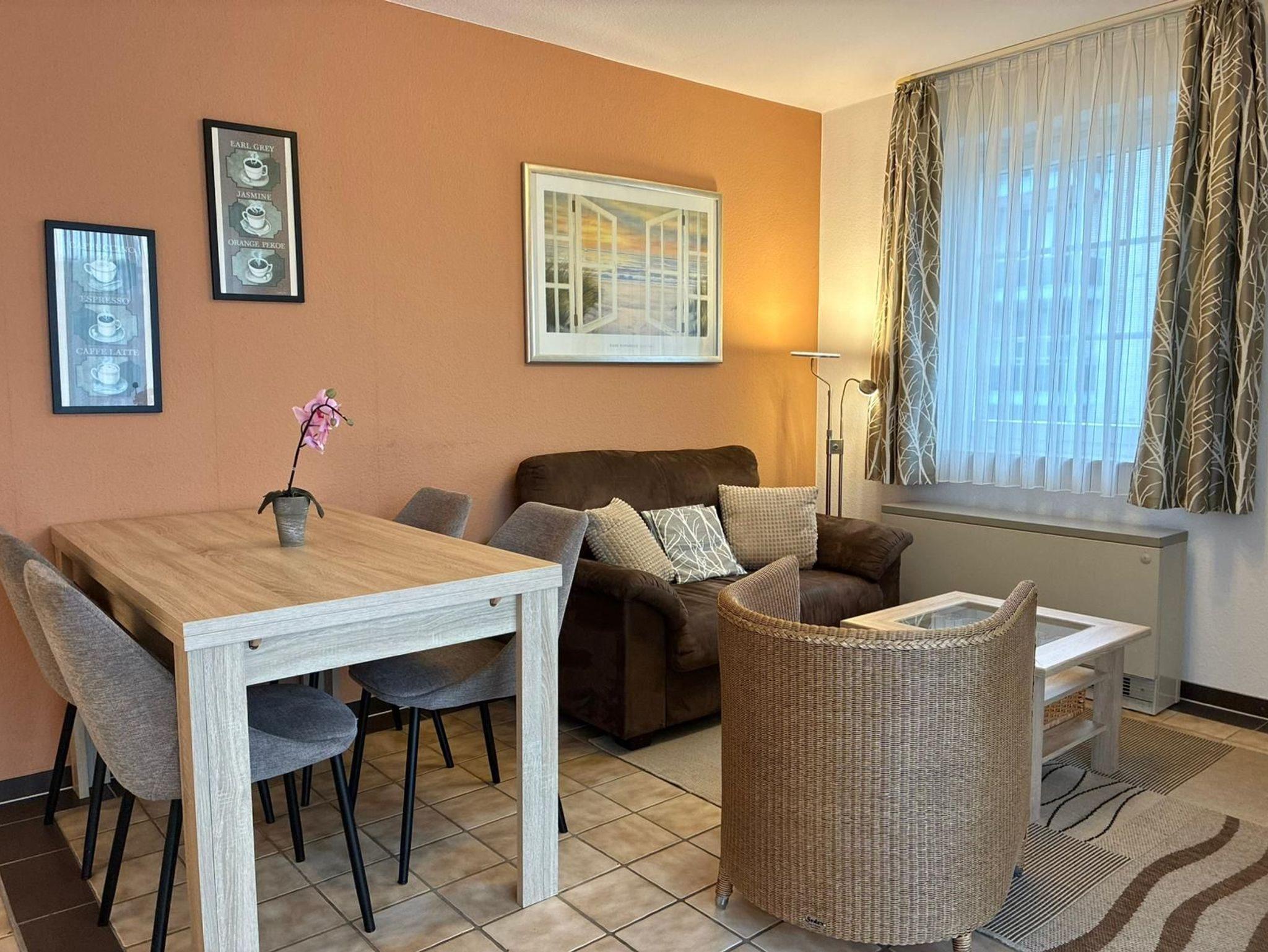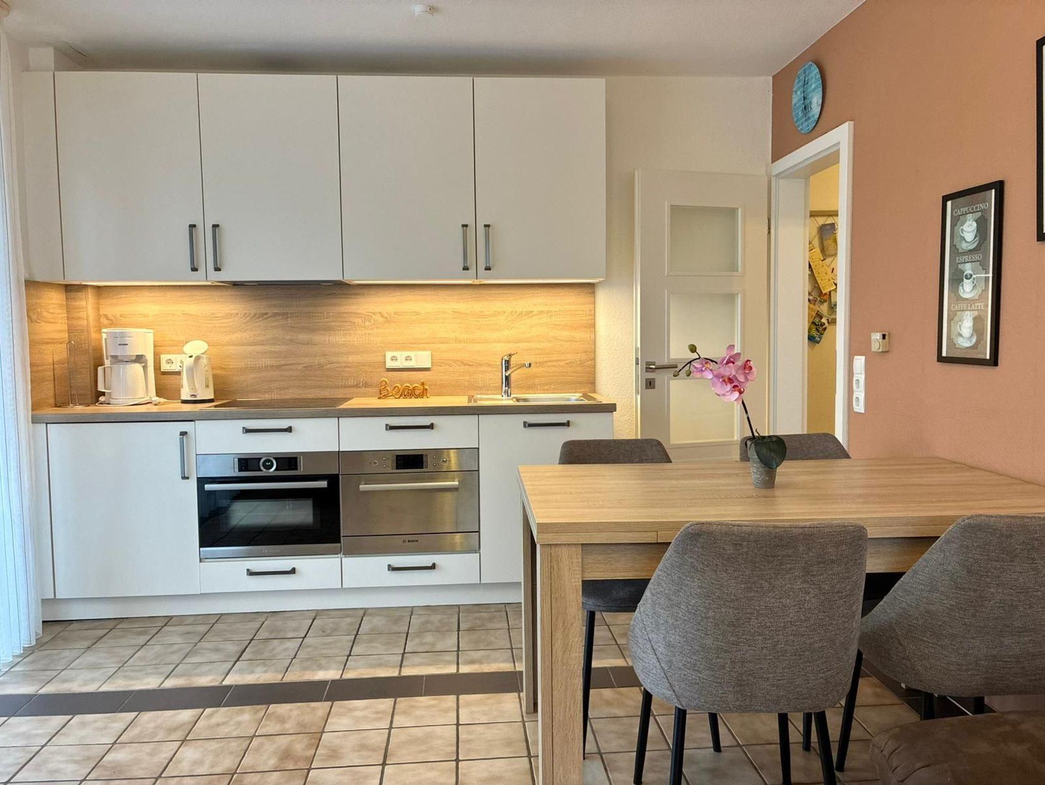 Sie wohnen in einem 3-Zimmer-Appartement in der ersten Etage auf ca. 47 m² Wohnfläche. Ein Schlafzimmer mit Doppelbett, ein Schlafzimmer mit einem Einzelbett, welches für die 4. Person ausgezogen werden kann, heller Wohnraum mit 2er-Couch und Sessel und mit SAT-LED-TV und Internetradio, separater Essplatz, voll ausgestattete Einbauküche mit Backofen incl. Mikrowelle und Spülmaschine, moderne Dusche/WC, Ost-Balkon.