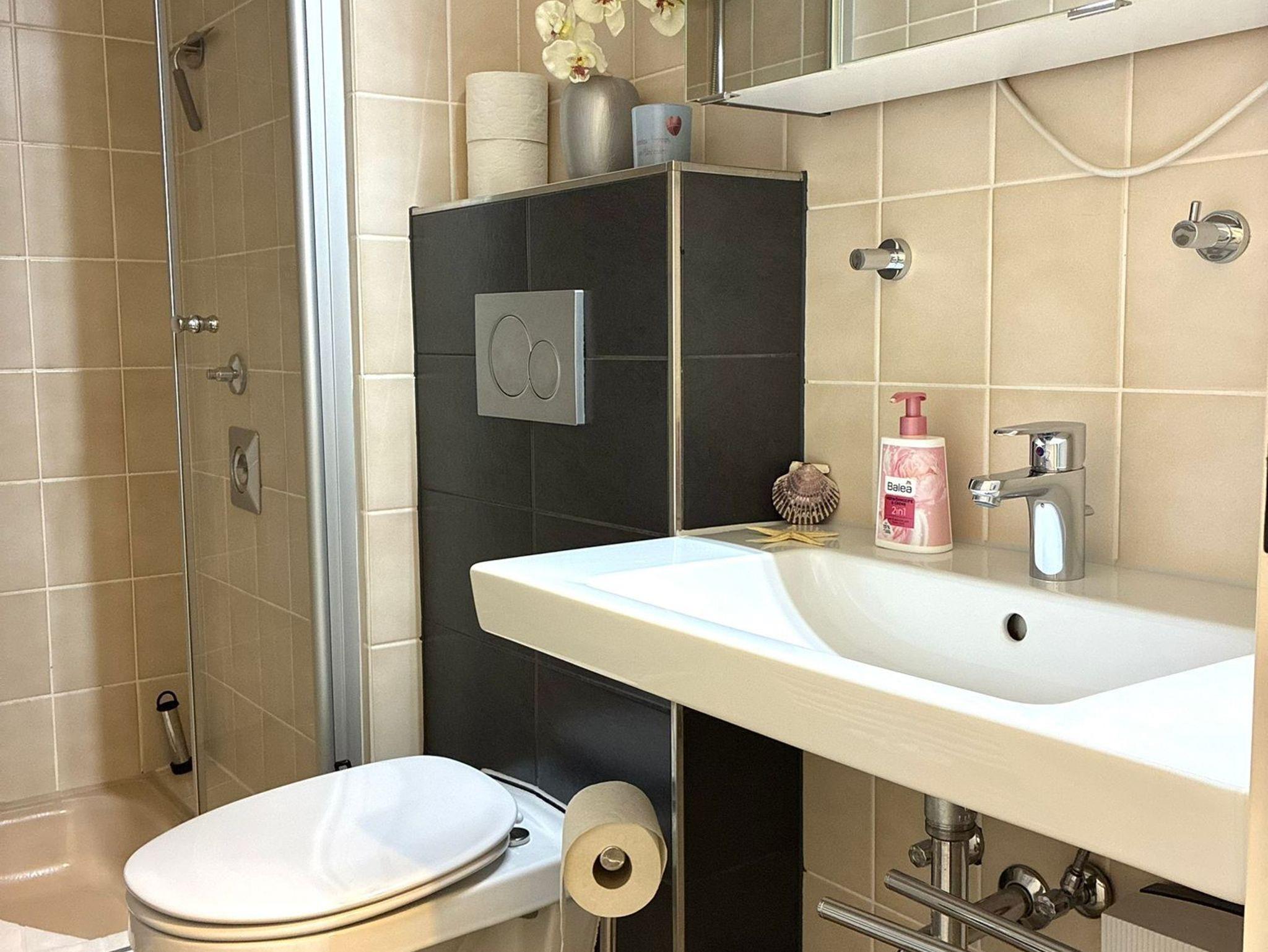 Badezimmer mit Dusche/WC, möblierter Balkon zur Westseite mit Seeblick in Richtung Insel Neuwerk,