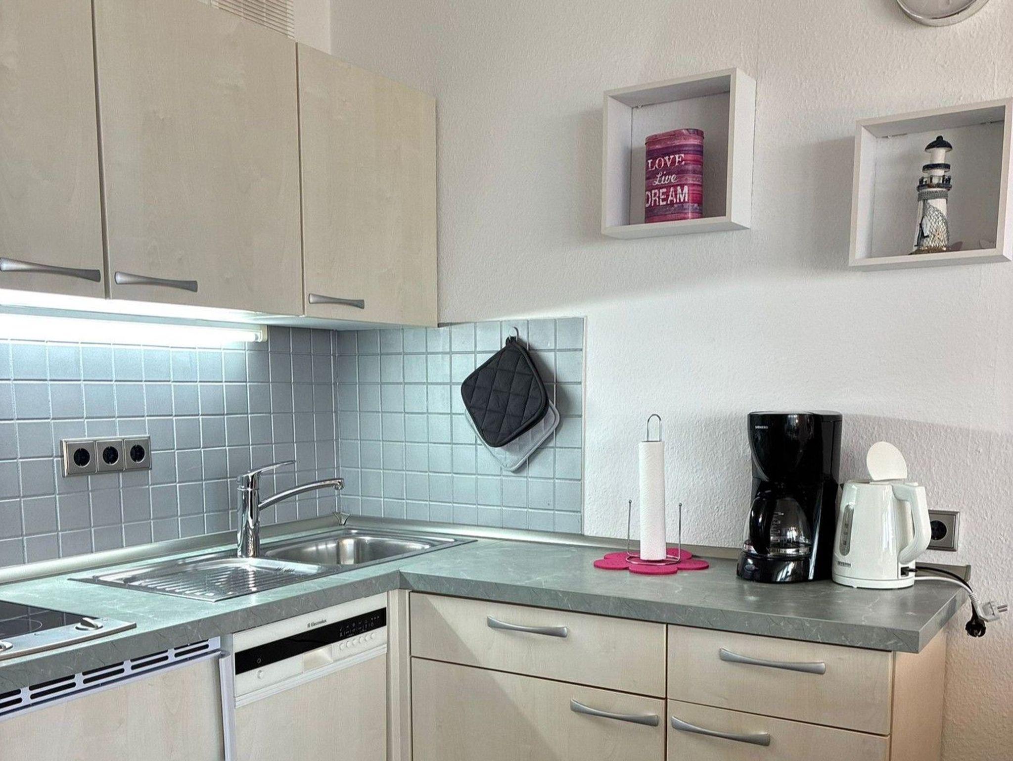 Küchenbereich mit Geschirrspüler, Mikrowelle und handlichem Back- u. Toastofen, hochwertiges