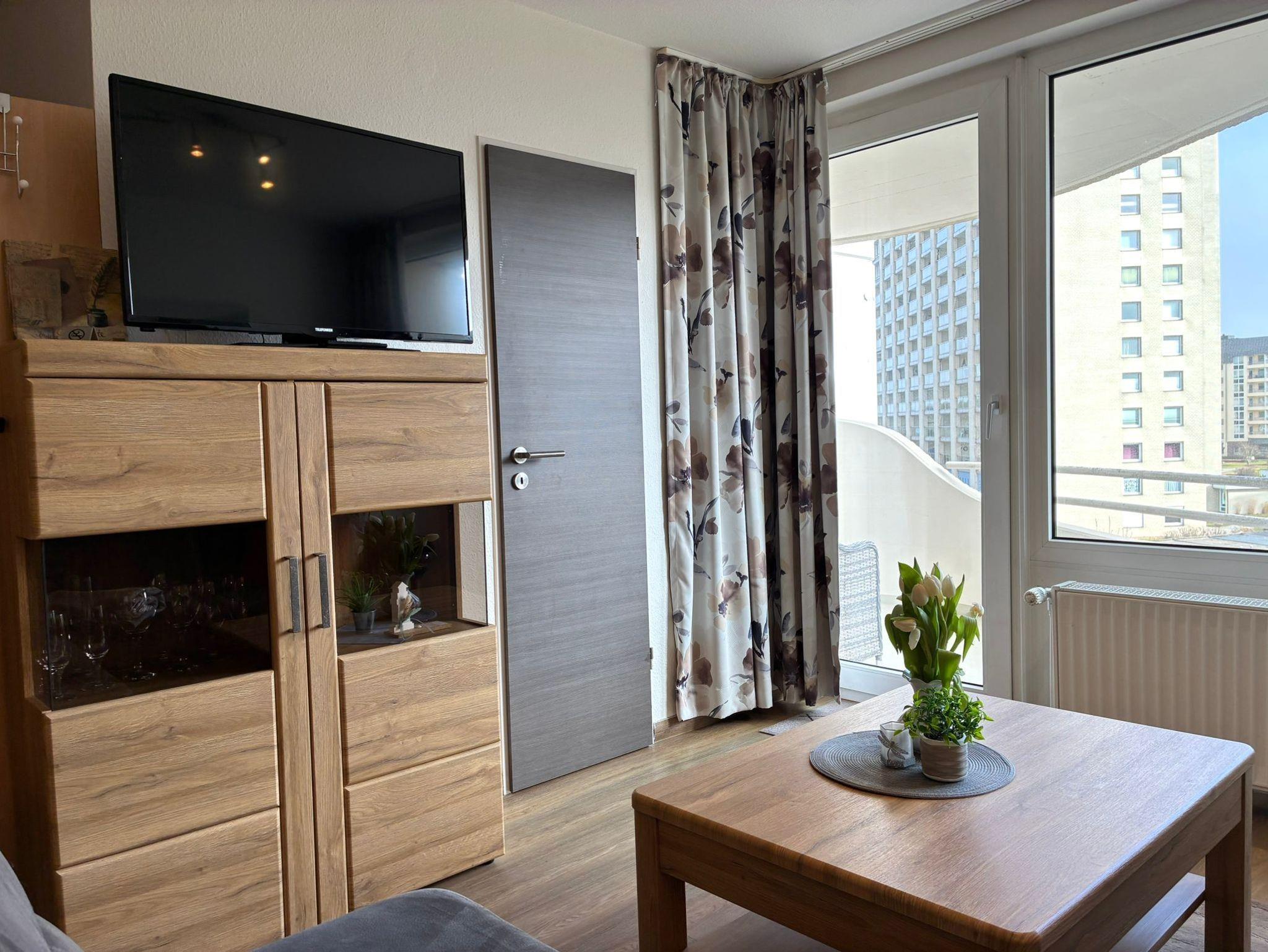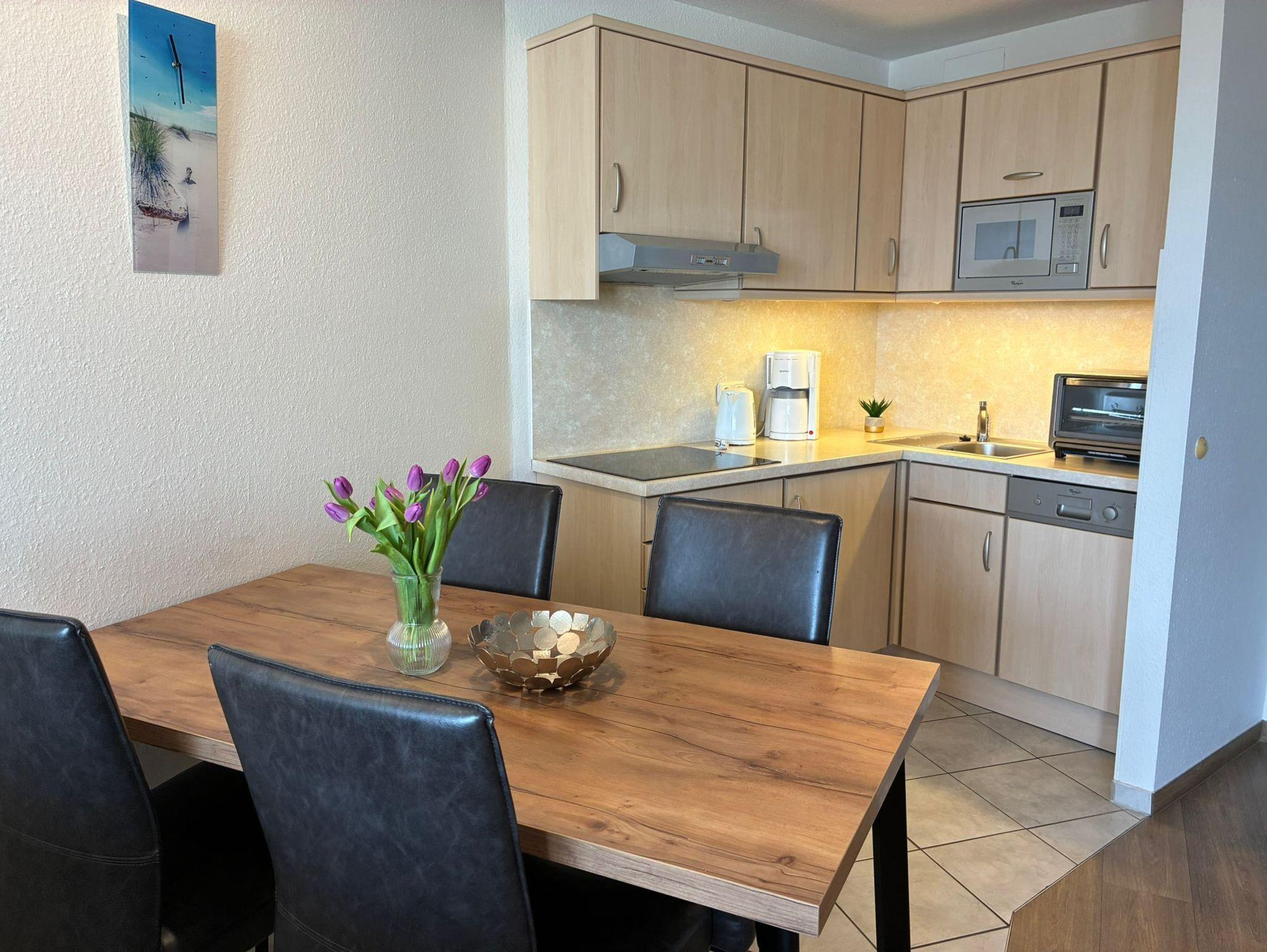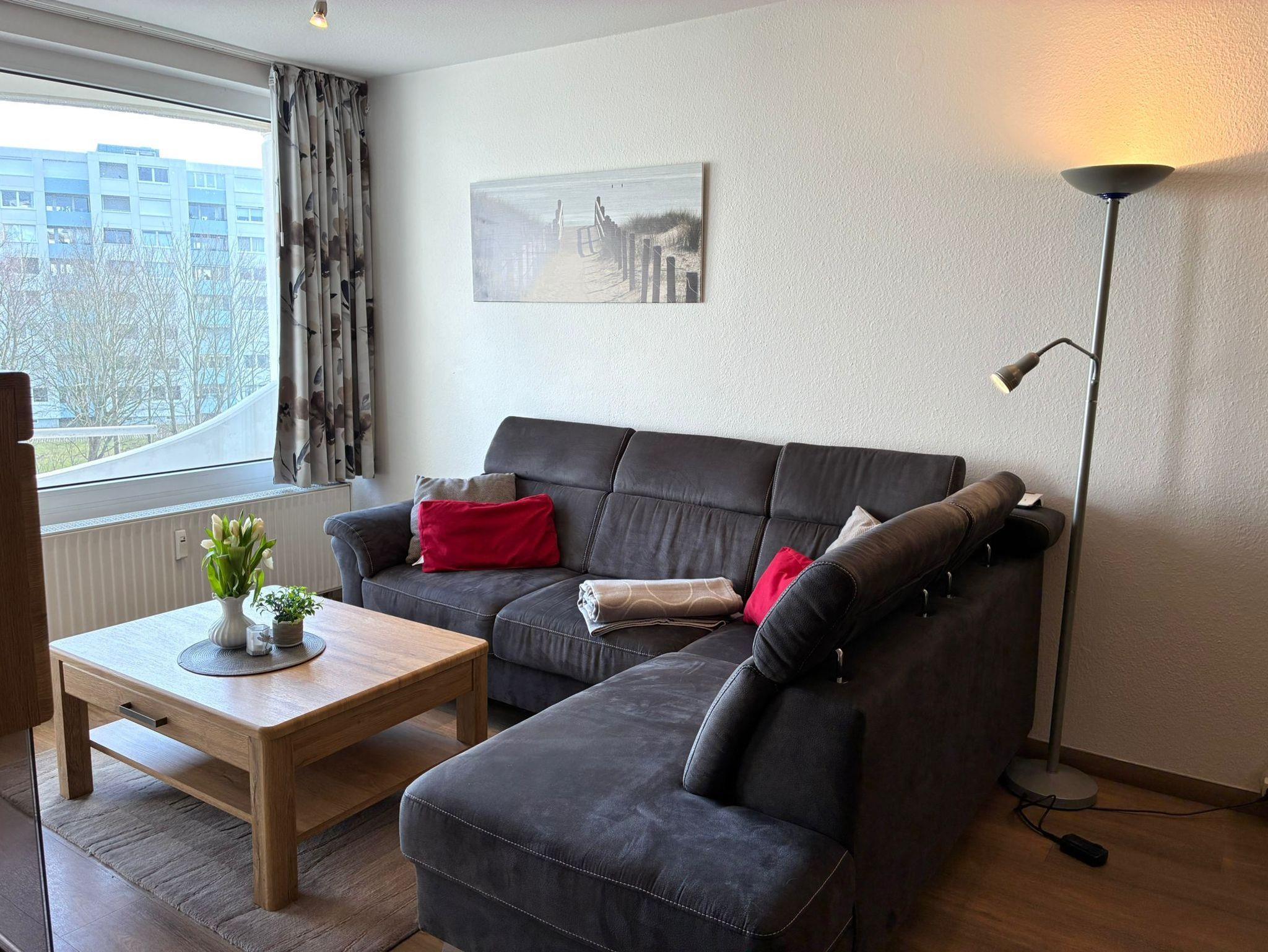 Sie wohnen in einem 1-Zimmer-Appartement für bis zu 4 Personen auf ca. 40 m² im 3. OG mit einem kleinen zusätzlichen Schlafzimmer mit Etagenbett für die 3. und 4. Person. Wohn-/Schlafzimmer mit Doppelbett, separater Essplatz, voll ausgestatteter Küchenbereich mit Geschirrspüler und Mikrowelle, Dusche/WC, möblierter Balkon mit Morgensonne und Blick auf die See, LCD-TV, Tiefgaragenplatz und Fahrradstellplatz in einem abschließbaren Raum.
