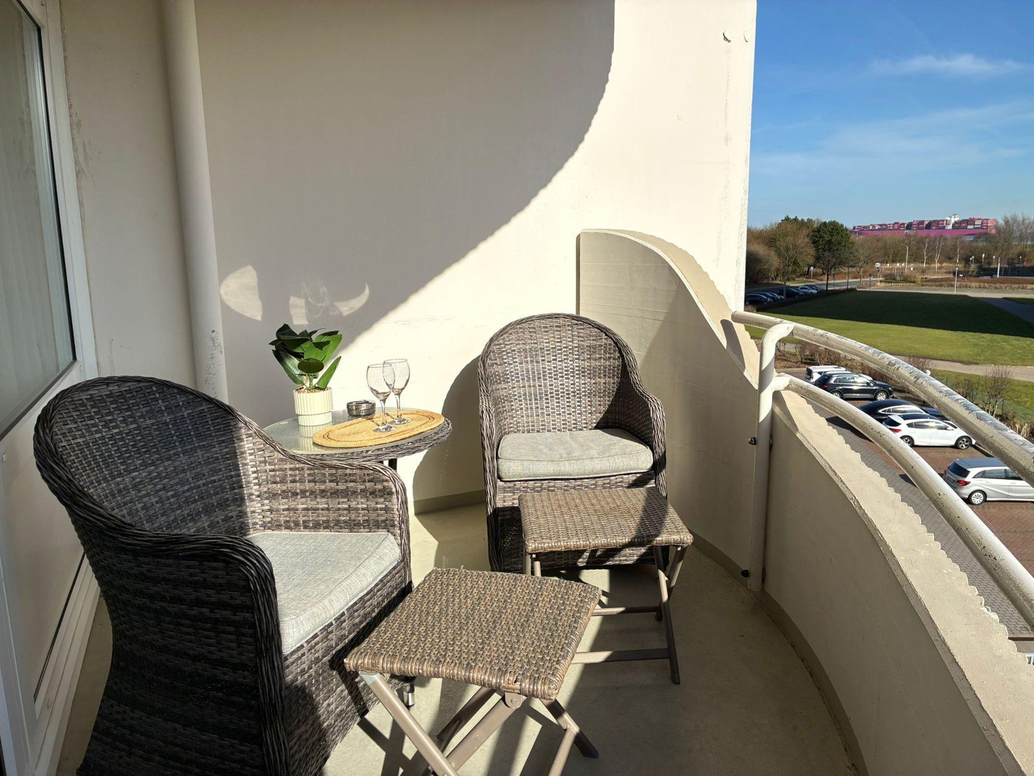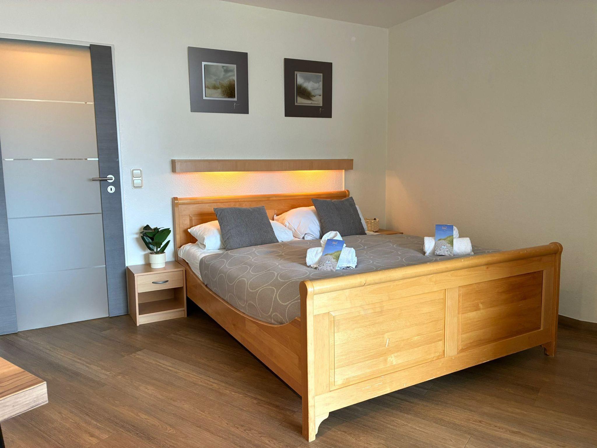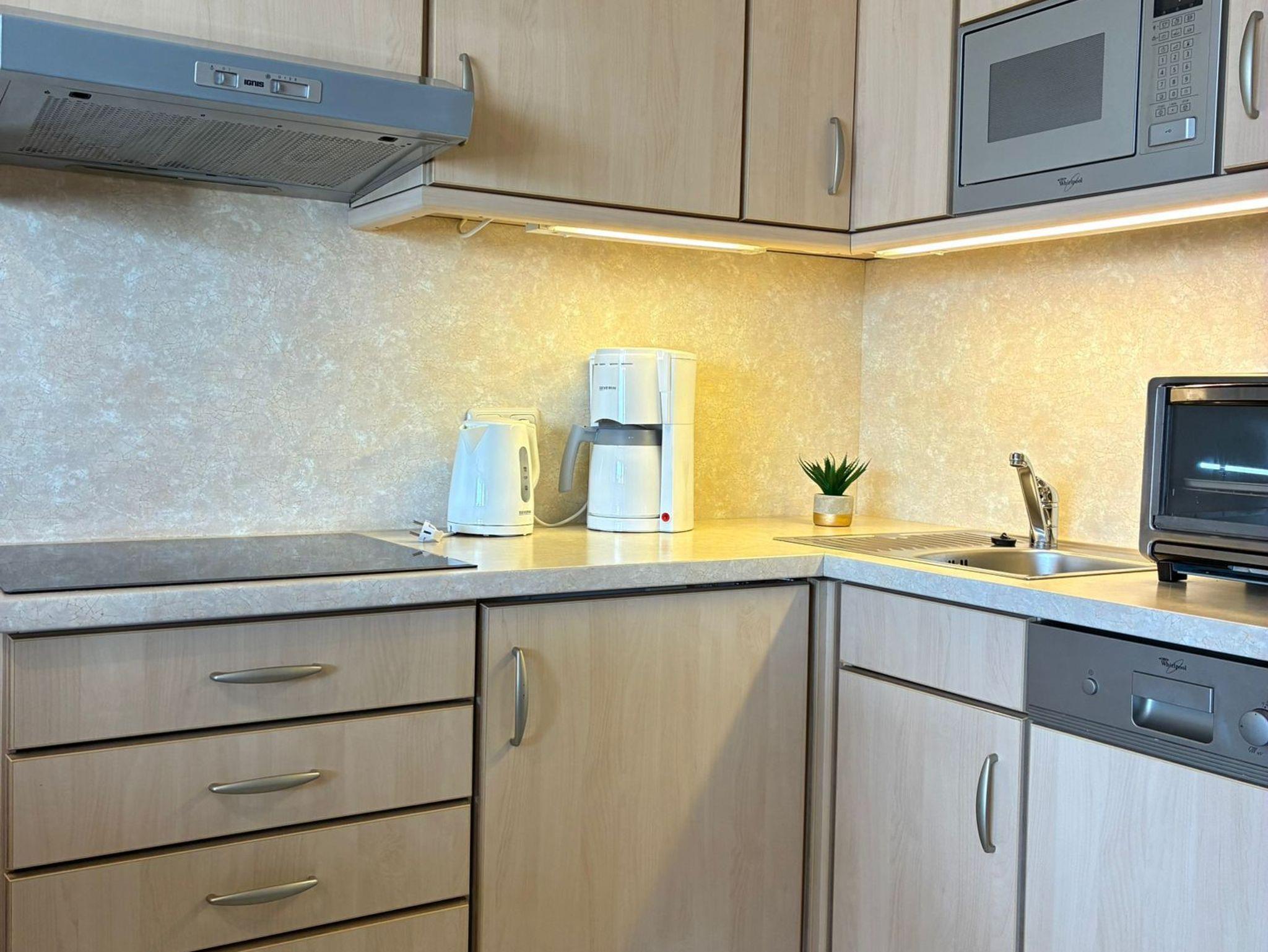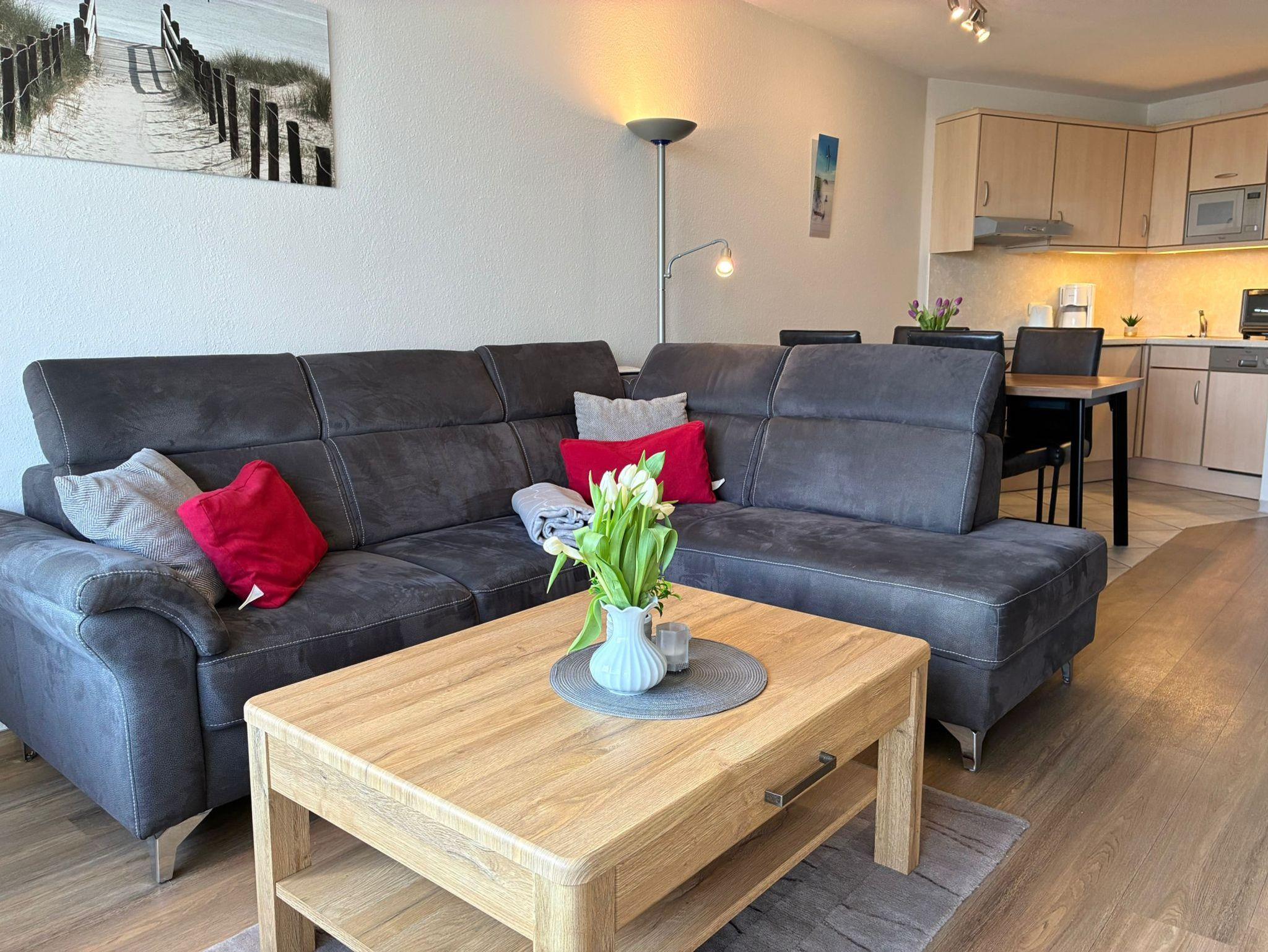 Sie wohnen in einem 1-Zimmer-Appartement für bis zu 4 Personen auf ca. 40 m² im 3. OG mit einem kleinen zusätzlichen Schlafzimmer mit Etagenbett für die 3. und 4. Person. Wohn-/Schlafzimmer mit Doppelbett, separater Essplatz, voll ausgestatteter Küchenbereich mit Geschirrspüler und Mikrowelle, Dusche/WC, möblierter Balkon mit Morgensonne und Blick auf die See, LCD-TV, Tiefgaragenplatz und Fahrradstellplatz in einem abschließbaren Raum.