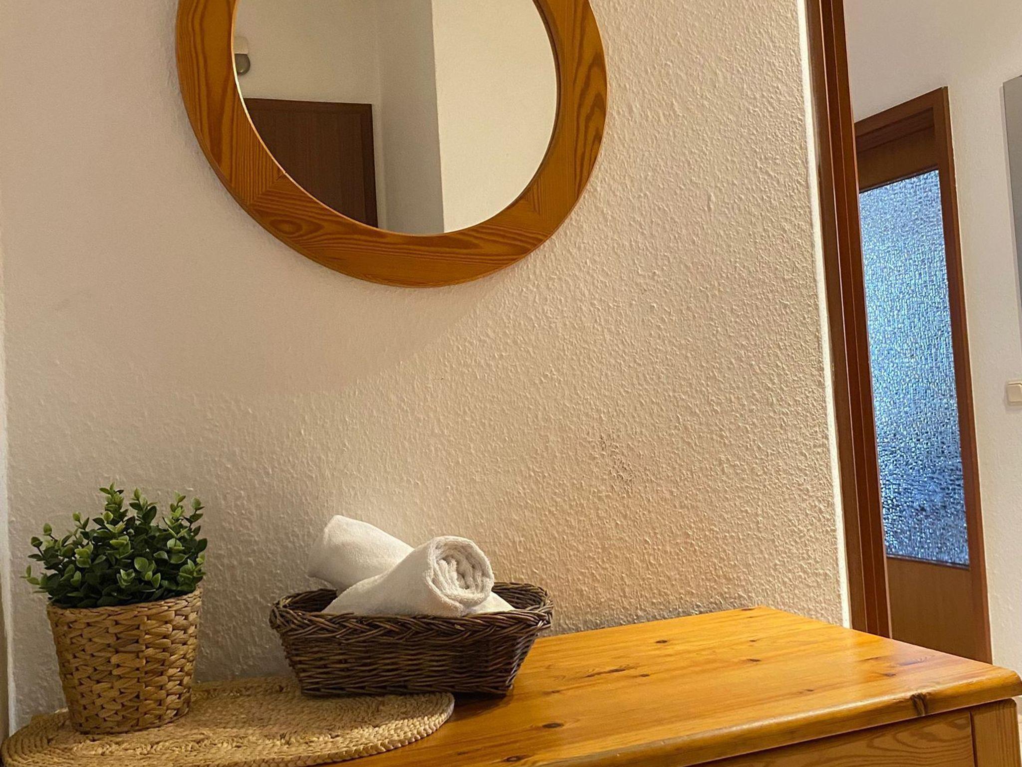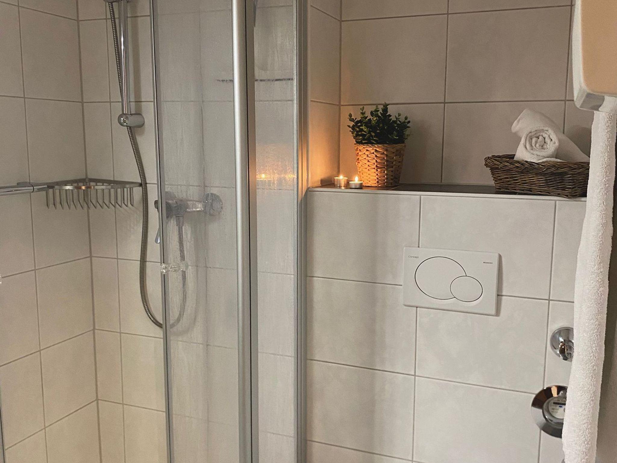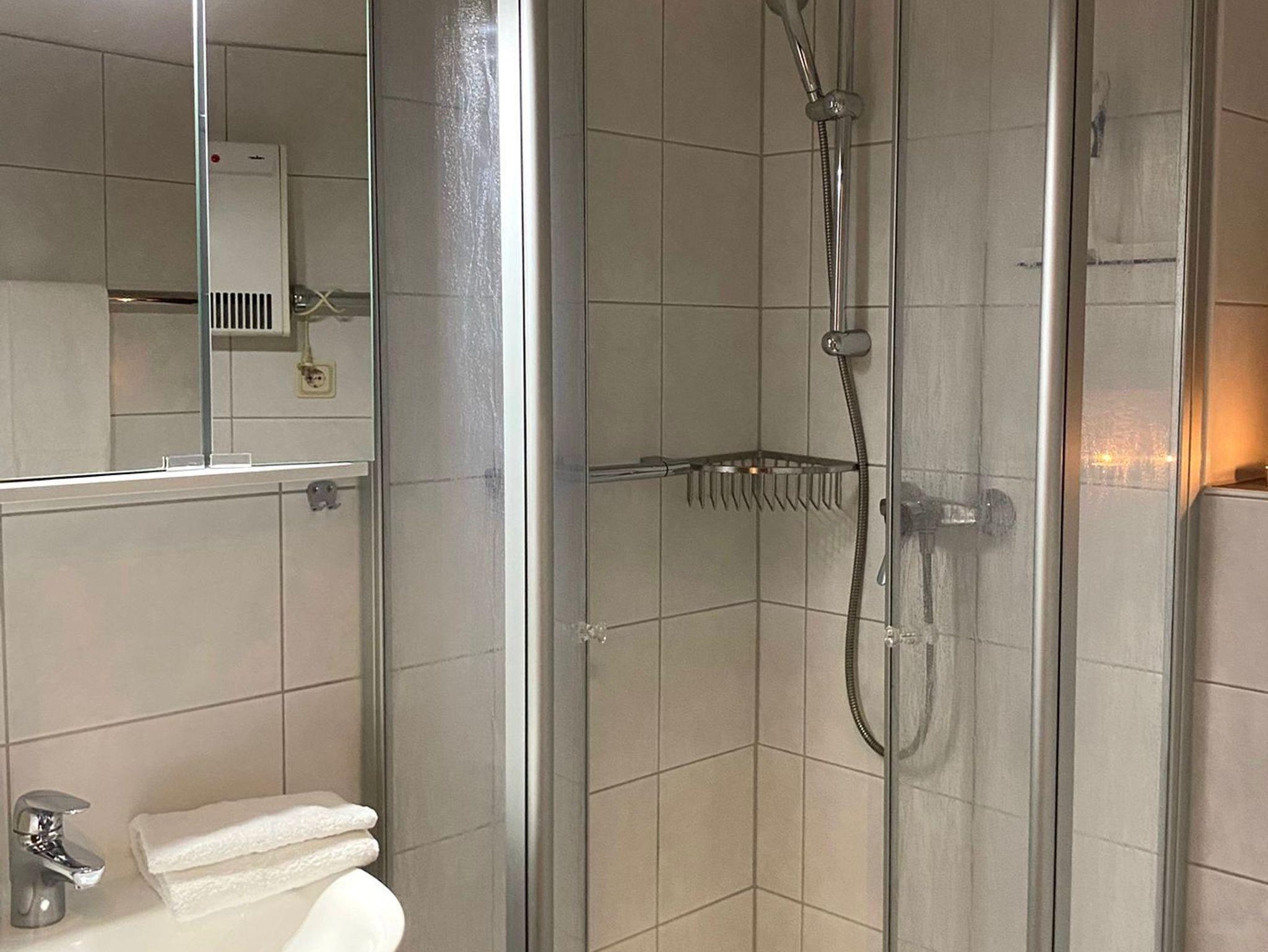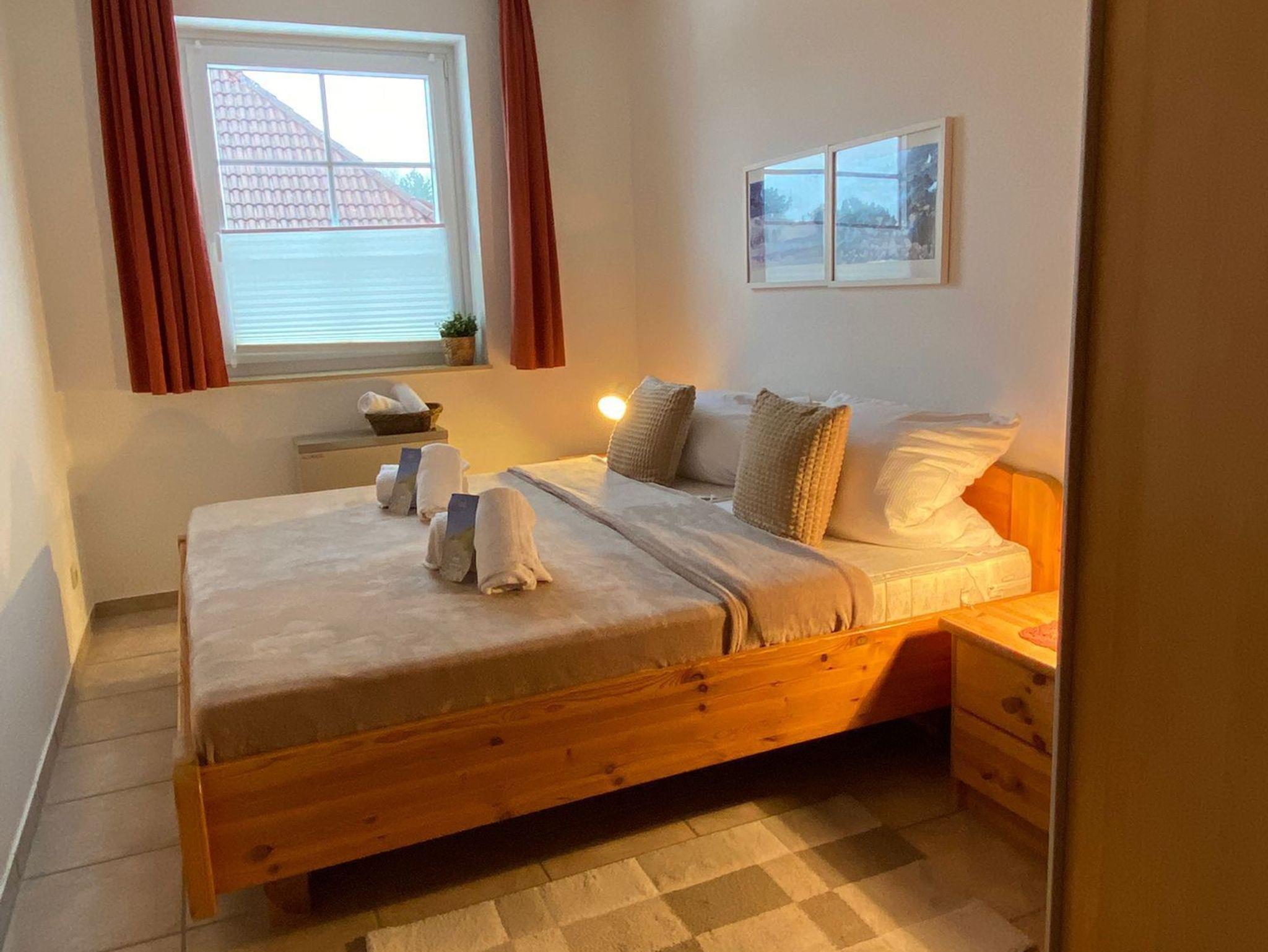 Das Kinderzimmer hat zwei getrennte große Betten, die auch für Erwachsene geeignet sind. Das funktionell eingerichtete Bad besteht aus Dusche, WC und Waschbecken. Die Wohnung ist komplett gefließt. In den Schlafräumen und unter der Sitzecke befinden sich Läufer bzw. ein Teppich.