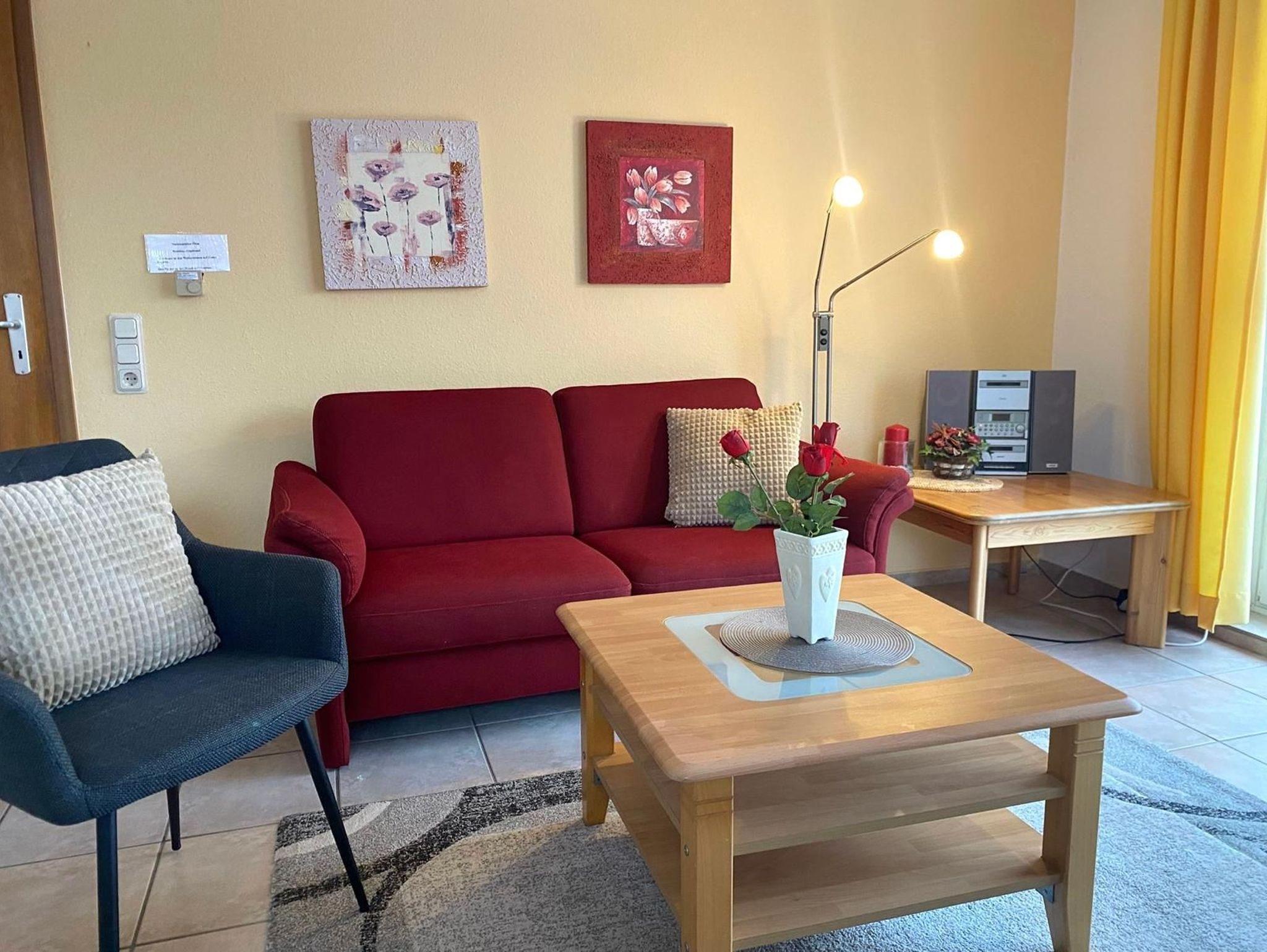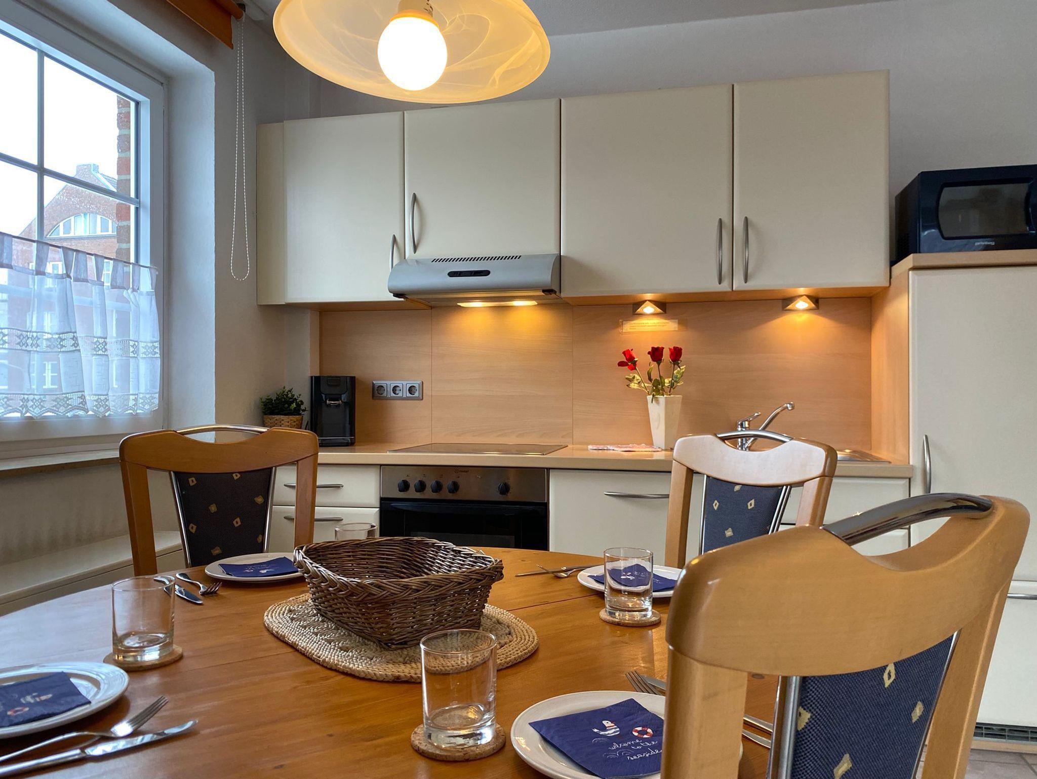 Unsere gemütlich und komplett eingerichtete Ferienwohnung befindet sich in der 1. Etage, bestehend aus drei Zimmern mit ca. 51 m² Wohnfläche und Balkon. Sie bietet Platz für bis zu 4 Personen. Die Einbauküche ist vollständig eingerichtet: 4-Platten-Ceran-Elektroherd, Backofen, Mikrowelle, Geschirrspüler, Kühlschrank, Kaffeemaschine, Geschirr, Besteck, usw. Der Wohnraum hat LCD-TV, DVD-Player, Mini-Hifi-Anlage, Essplatz und eine gemütliche Sitzecke. Für schlechtes Wetter stehen eine Spielesammlung und Bücher zur Verfügung. Im Elternschlafzimmer befindet sich ein großer Kleiderschrank und ein weiteres TV-Gerät.