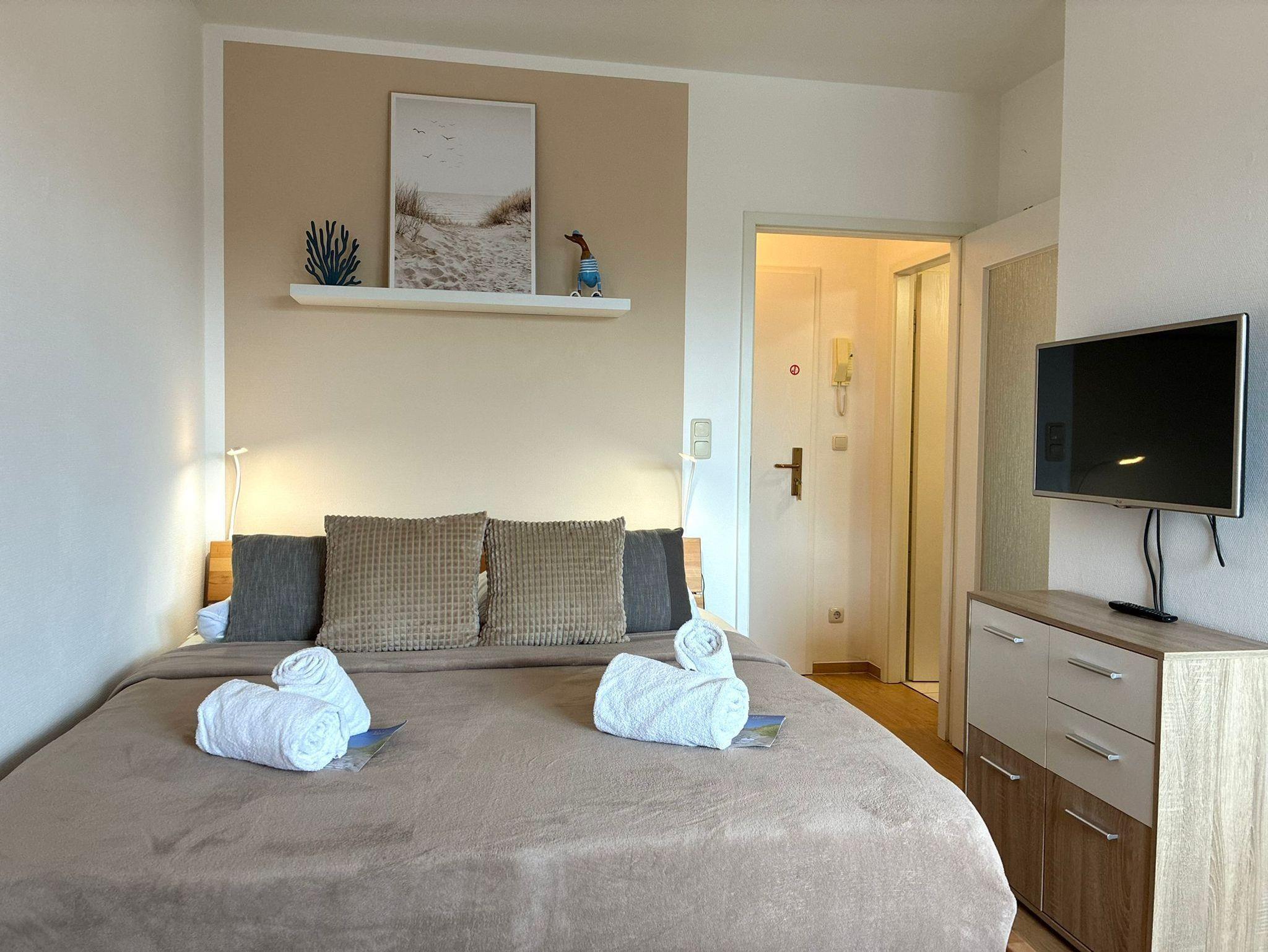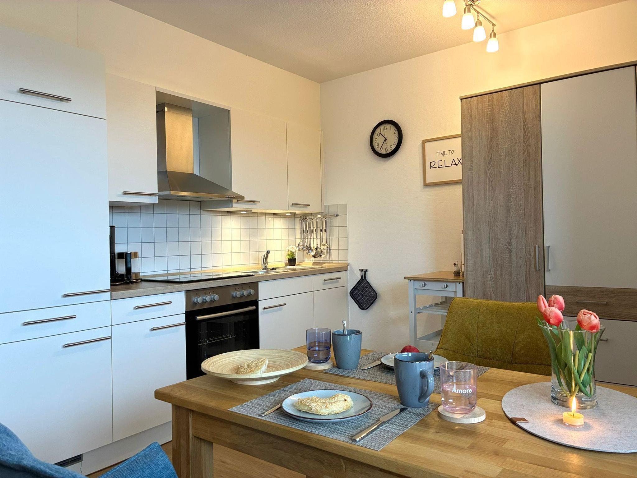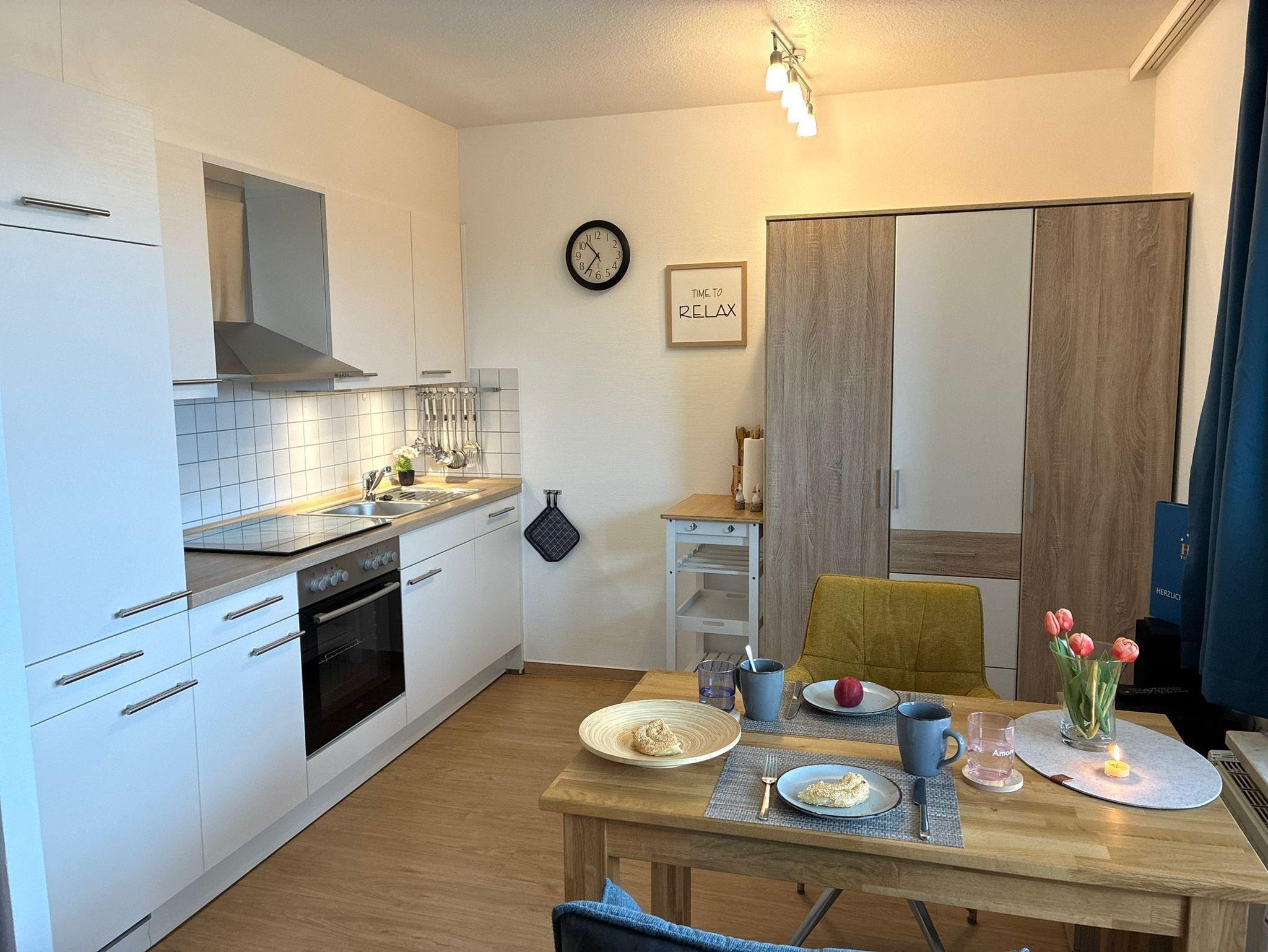 Sie wohnen in einem 1-Zimmer-Appartement für bis zu 2 Personen auf ca. 30 m² Wohnfläche. Die Ferienwohnung verfügt über einen Wohn-/Schlafraum mit hochwertiger Schlafcouch, LCD-TV, Mini-Hifi-Anlage, Internetzugang, voll ausgestattetem Küchenbereich mit Essplatz, Dusche/WC, ostseitigem Balkon (Morgensonne!) und Tiefgaragenplatz.