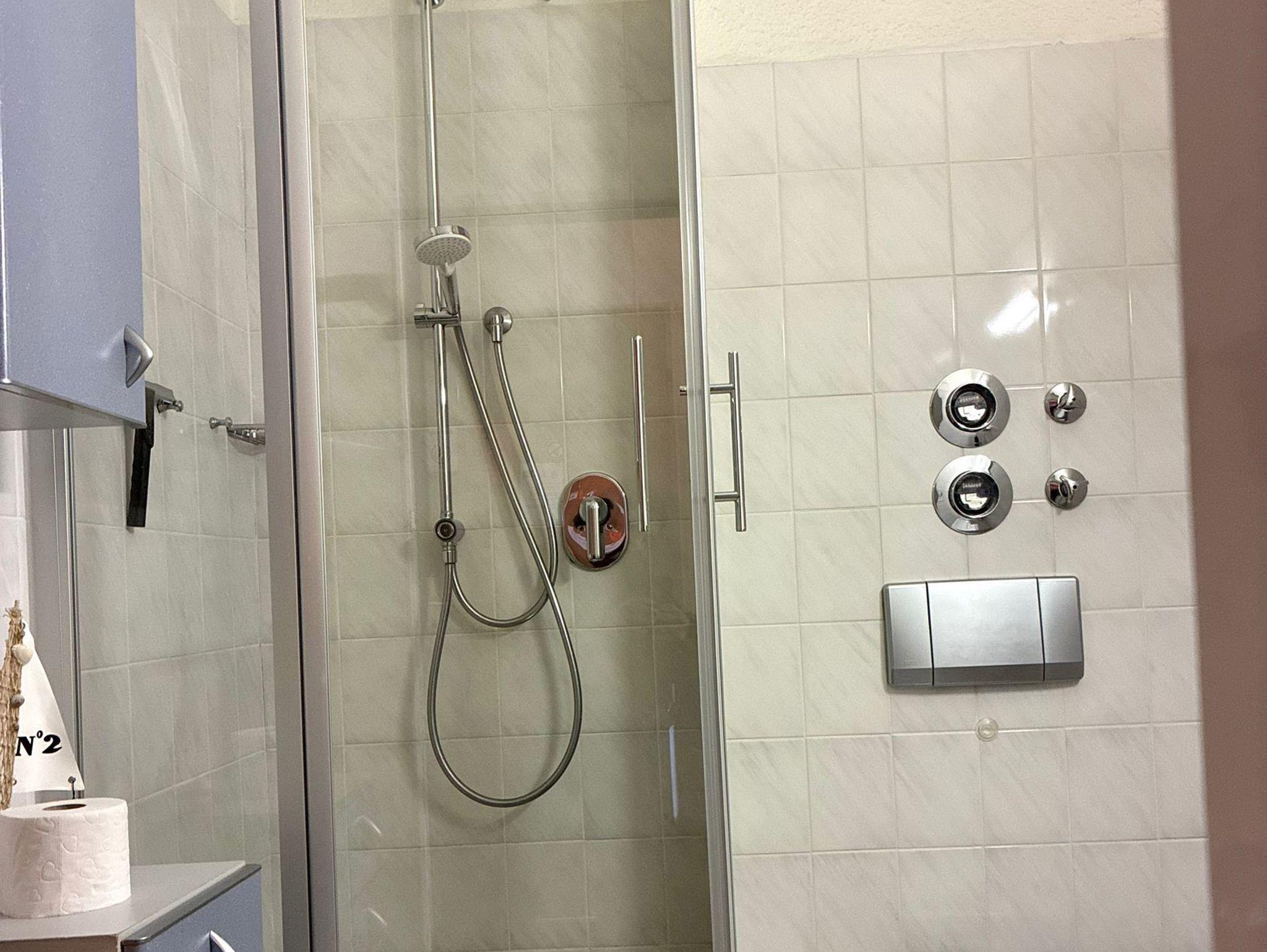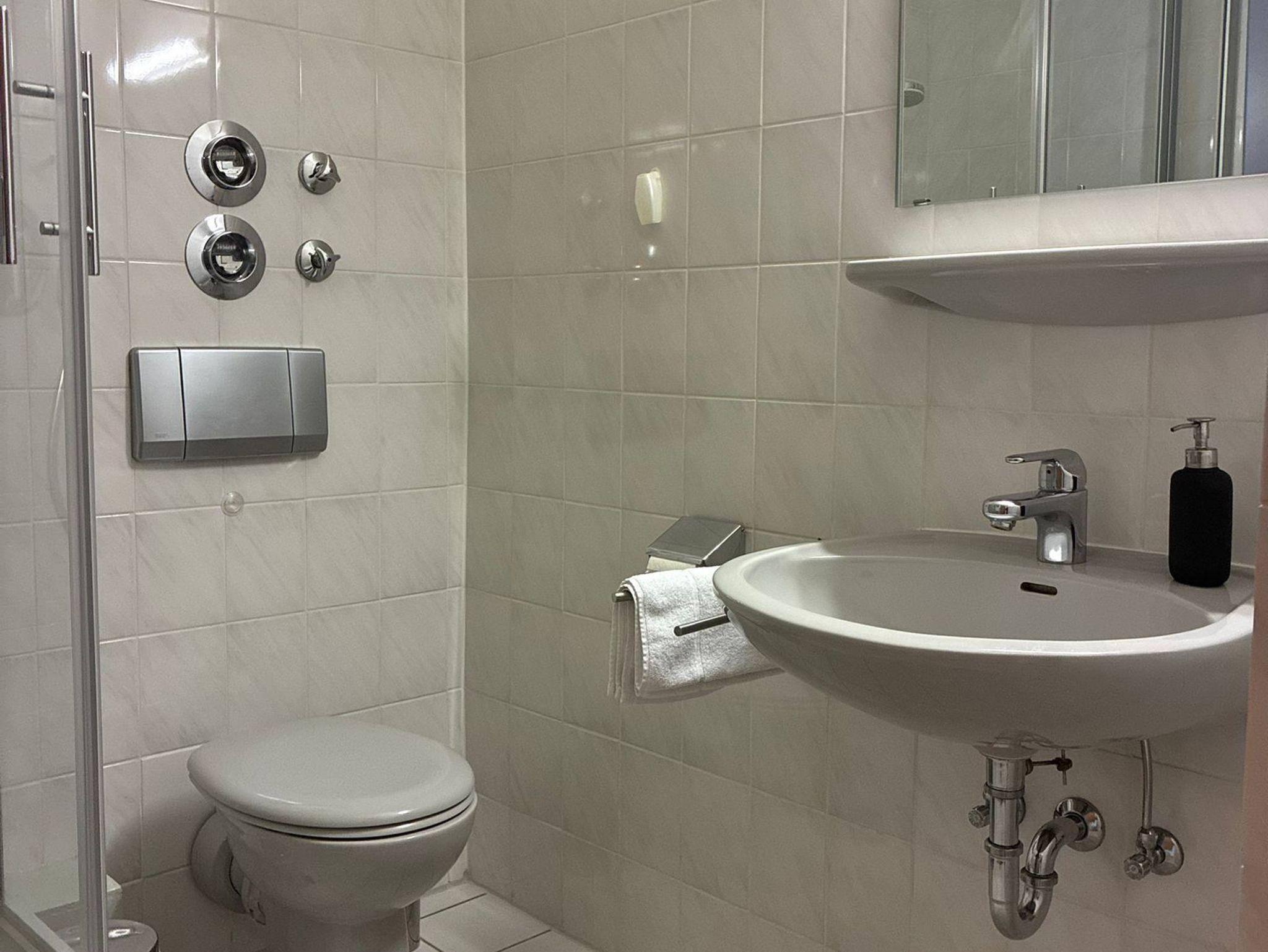 Ein Badezimmer mit Dusche/WC und Föhn gehört ebenfalls zur Wohnung. Das im Keller befindliche Schwimmbad mit Gegenstromanlage und Tageslicht sowie die finnische Sauna können Sie kostenlos nutzen.