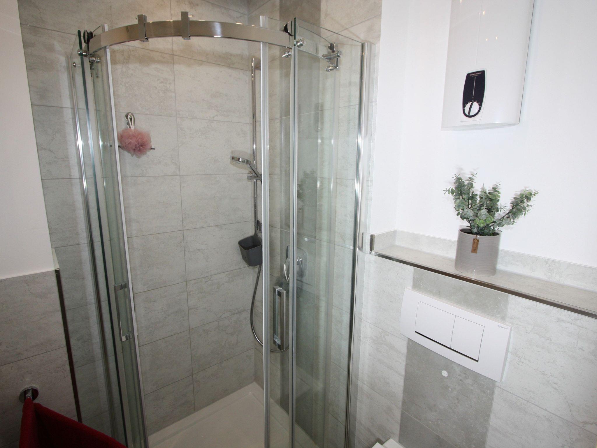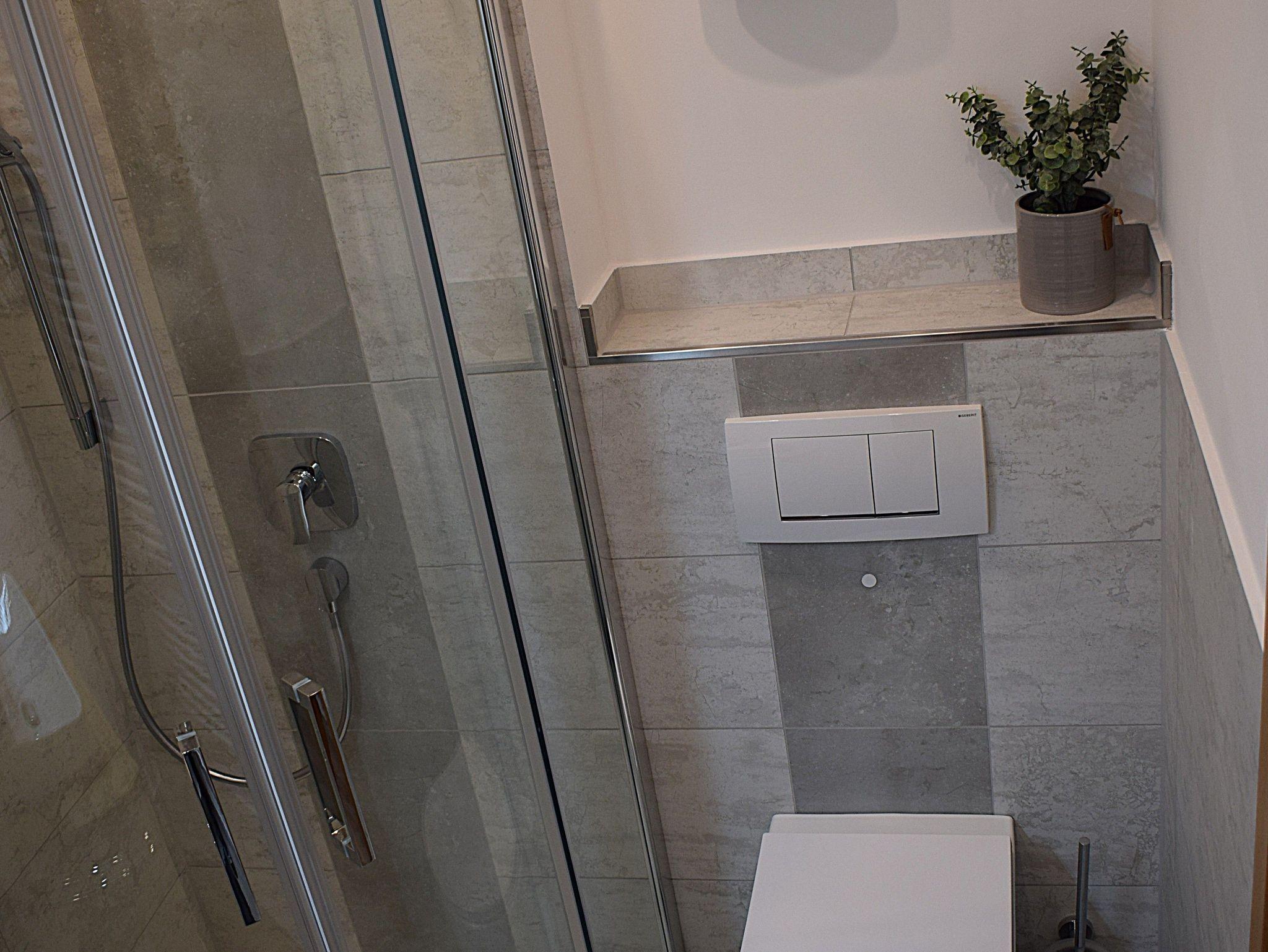 Das neue Bad ist mit bodenebener Dusche und WC ausgestattet.