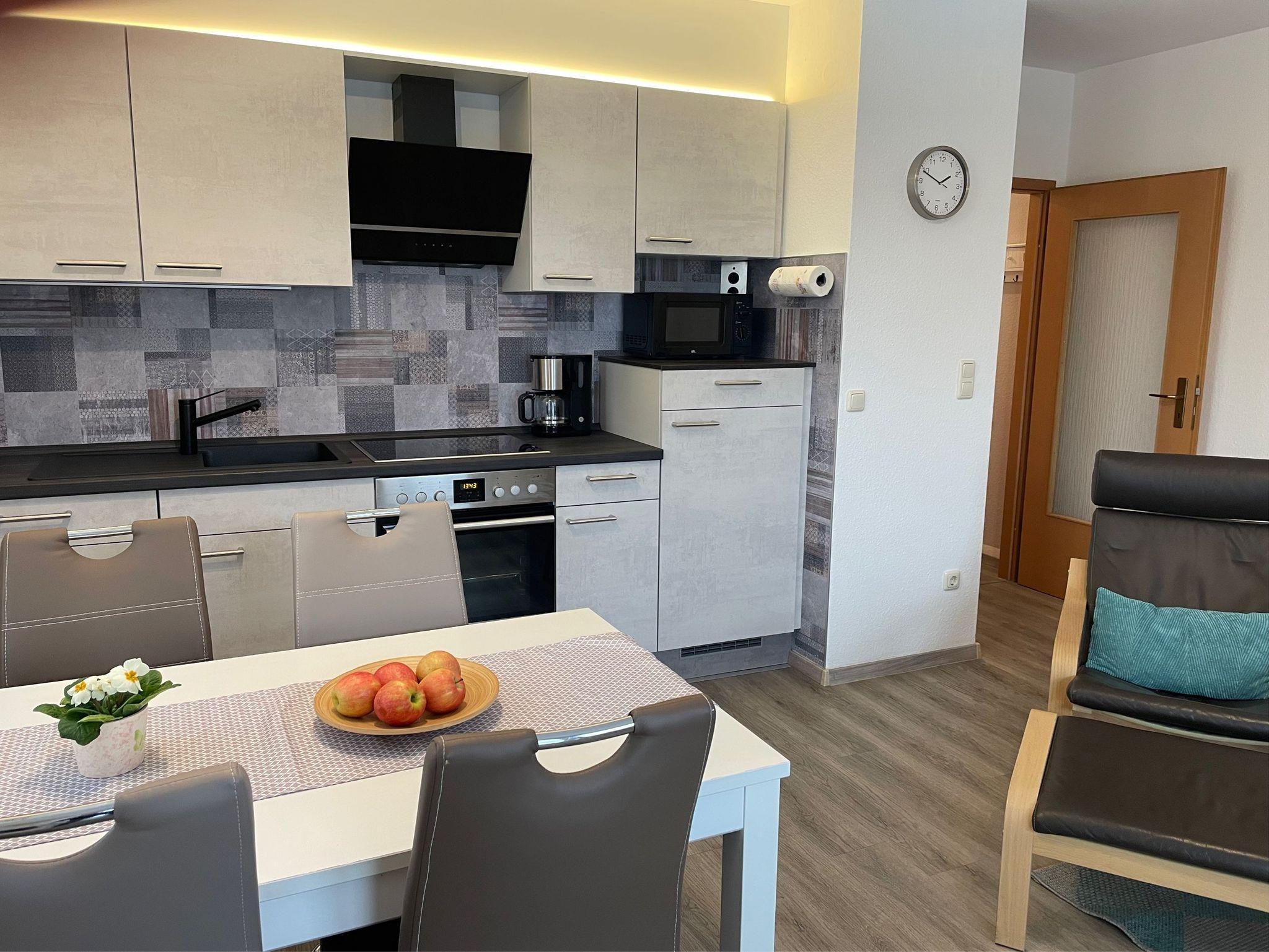 Die Ferienwohnung verfügt über einen Schlafraum mit Doppelbett und einem Wohnraum (renoviert 2020) mit gemütlicher Sitzecke, Essecke und integrierter Küchenzeile (Geschirrspüler, Mikrowelle).