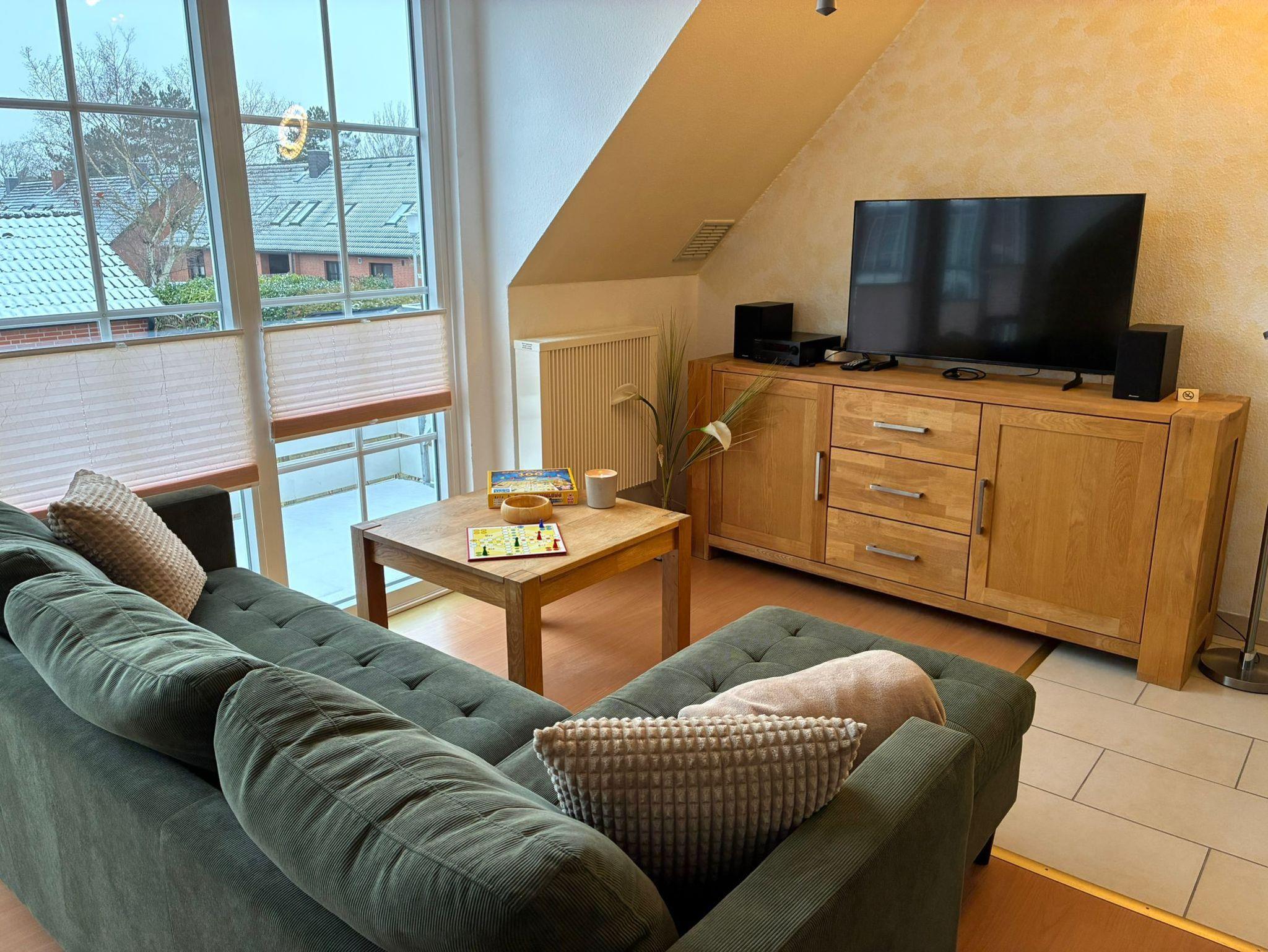 Sie verbringen Ihren Urlaub in einer liebevoll eingerichteten Ferienwohnung: heller Wohnraum mit Kaminofen, SAT-TV (Flat-TV), Stereoanlage mit CD/DVD-Player, Bluetooth, USB. Der Essbereich ist mit einer Küchenzeile ausgestattet (Spülmaschine, Herd mit Ceranfeld, Backofen mit Umluft, Mikrowelle, Kaffeemaschine, Senseo-Kaffeeautomat). Sie finden außerdem gebräuchliche Küchengeräte wie Wasser-, Eierkocher, Pürierstab, Messerblock, Küchenhelfer und Besteck in ausreichender Menge. Für gesellige Abende liegen Spiele für Groß und Klein bereit. Außerdem finden Sie eine Gästemappe mit Ausflugstipps in und rund um Cuxhaven (mit Fahrradkartenteil). Beide Schlafzimmer verfügen über jew. ein Doppelbett, ein Boxspringbett und ein franz. Bett (140 cm x 200 cm). Zusätzlich befindet sich im 2. Schlafzimmer (oder Kinderzimmer) ein weiterer Flat-TV.