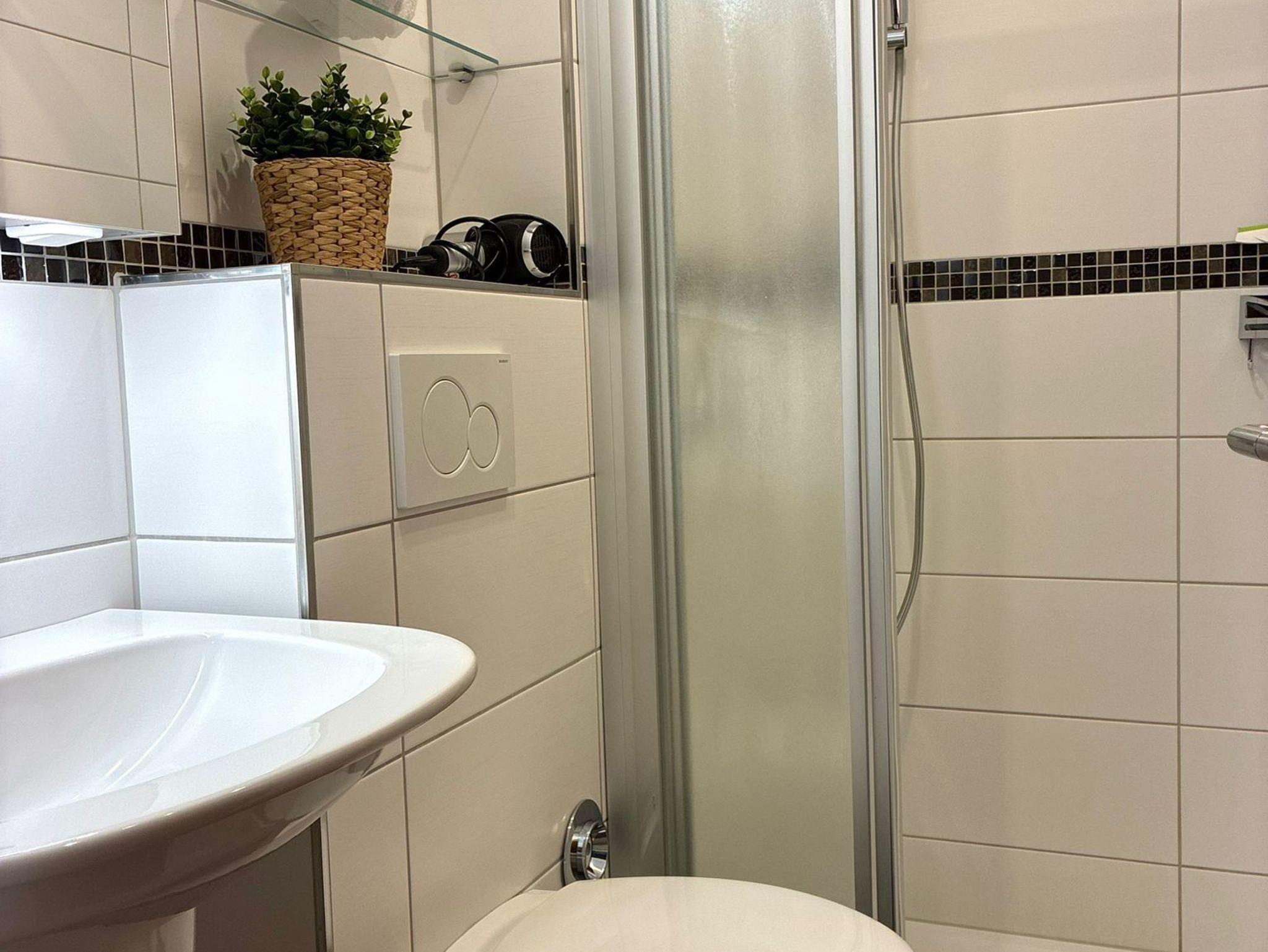 Im neuen exklusiv gestalteten Bad verwöhnt Sie eine Fußbodenheizung und Dusche mit ebenem Einstieg und Regenbrause.