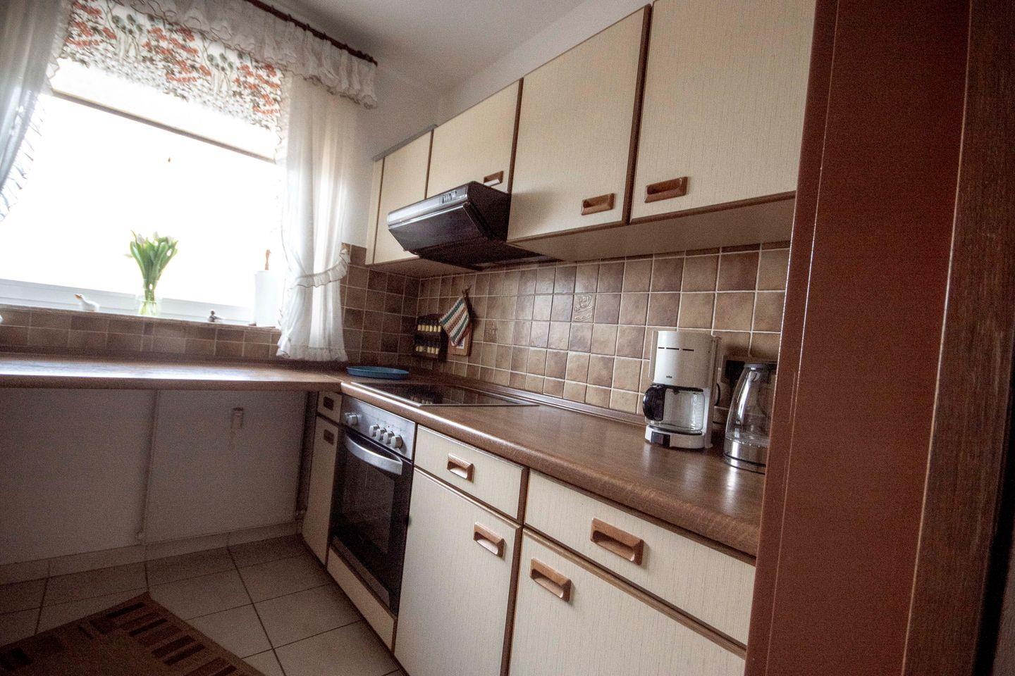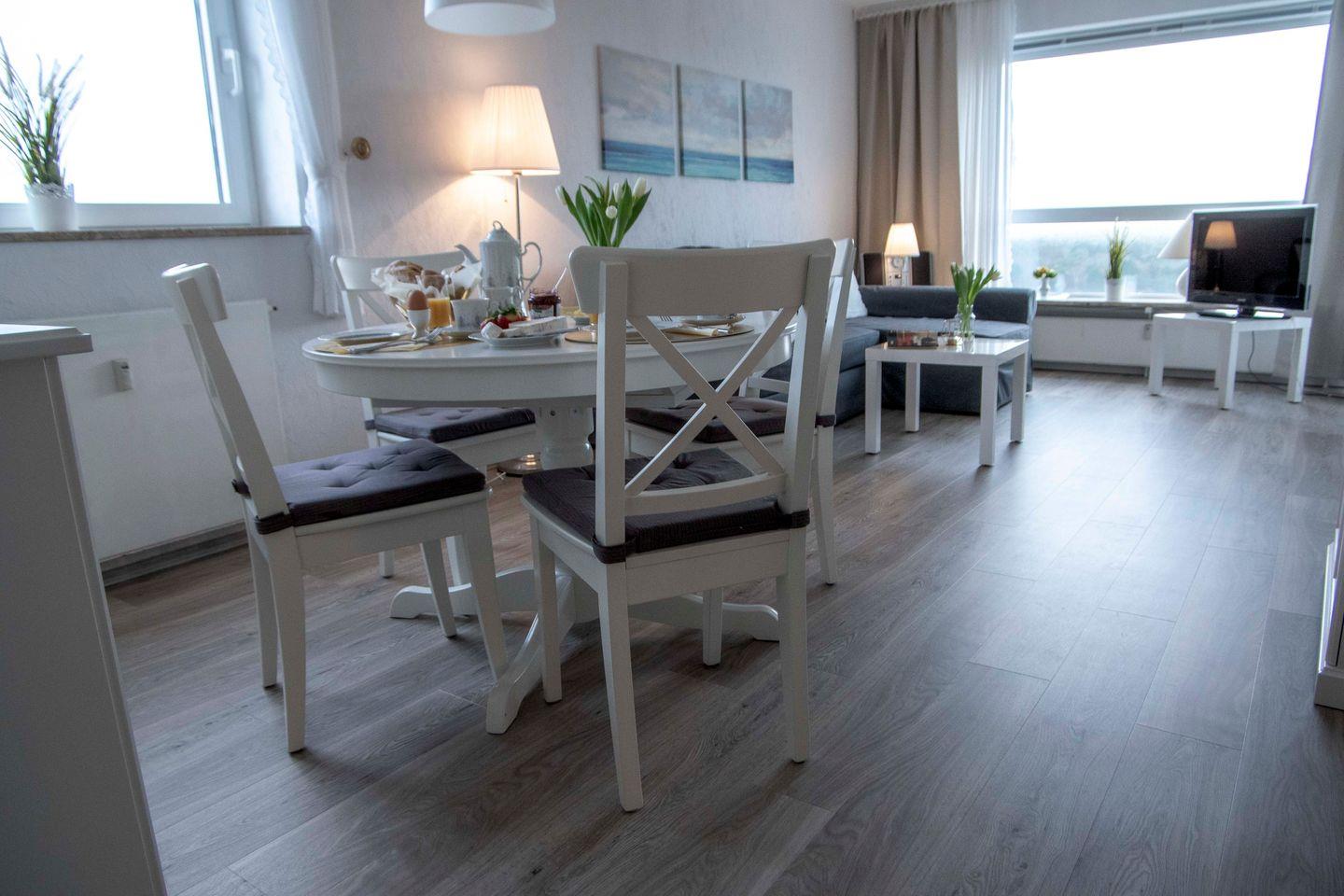 Die Ferienwohnung überzeugt durch ihre durchdachte Ausstattung und moderne Einrichtung. Sie betreten die Wohnung und finden sich in einem einladenden Wohnbereich mit gemütlicher Sofaecke und einem Essbereich wieder, der genug Platz für gemeinsame Mahlzeiten bietet. Die Küche ist vollständig ausgestattet und bietet einen 4-Platten-Herd, Backofen, Kühlschrank mit Gefrierfach, sowie alle nötigen Küchenutensilien. Hier bereiten Sie im Handumdrehen leckere Mahlzeiten zu.