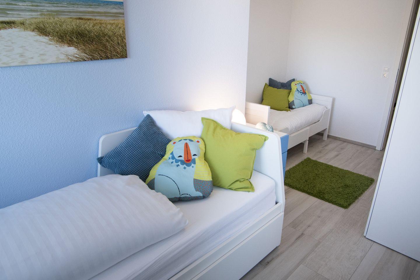 Im 1. Schlafzimmer befindet sich ein großes, gemütliches Kingsize Bett mit durchgehender Matratze. Das 2. Schlafzimmer ist mit 2 Einzelbetten ausgestattet, eines davon ist ein Kinderbett( ca. 70x140). Auf dem bequemen Schlafsofa im Wohnbereich finden 2 weitere Personen Platz.