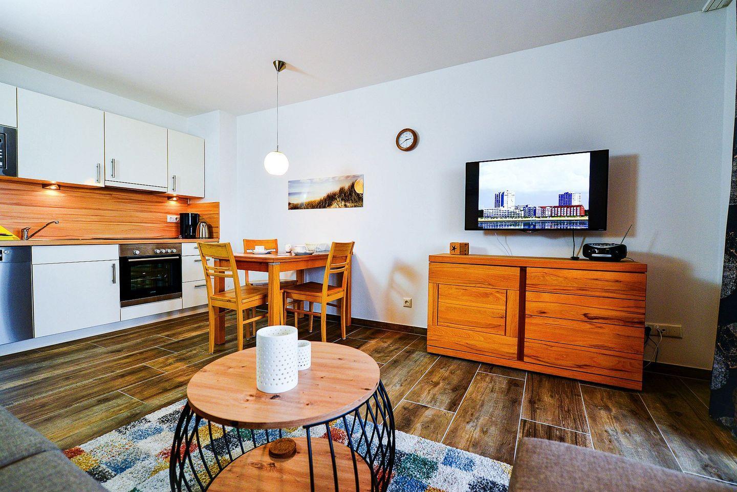 Die Wohnung verfügt über ein separates Schlafzimmer mit Doppelbett sowie ein Schlafsofa im Wohnbereich. Die Küche ist voll ausgestattet mit Herd, Backofen, Kühlschrank und Kaffeemaschine. WLAN, Flatscreen-TV, Fußbodenheizung und ein neues und modernes Duschbad sorgen für Komfort.