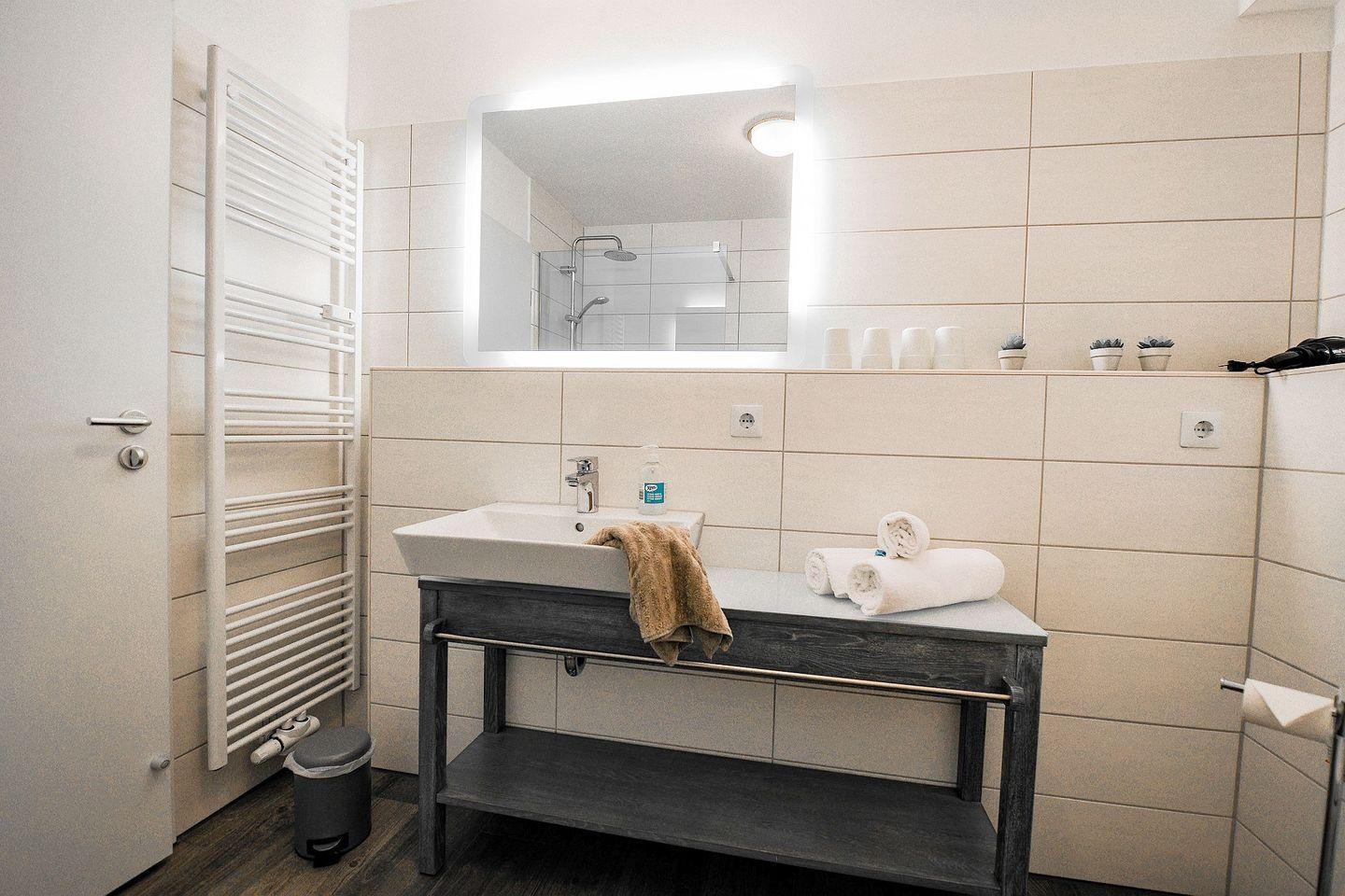 Die Wohnung verfügt über eine voll ausgestattete Küchenzeile, WLAN, zwei Fernseher sowie kostenfreie Parkplätze direkt am Haus. Das neue, großzügige Bad ist mit einer ebenerdigen Dusche ausgestattet.