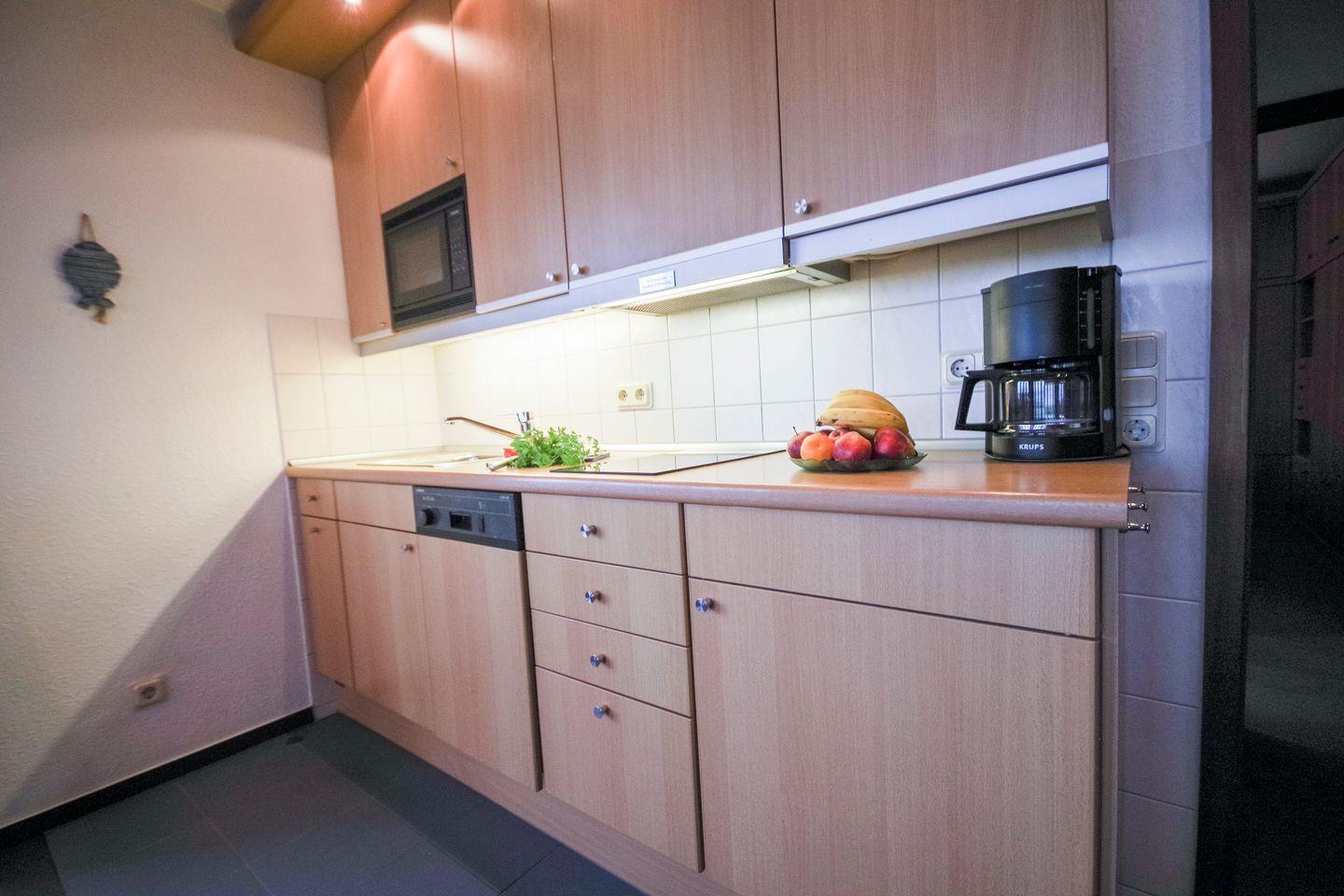 Die moderne Küchenzeile ist gut ausgestattet und bietet u. a. Geschirrspüler, Mirkowelle und Cerankochfeld, perfekt für gemütliche Mahlzeiten in eigener Regie.