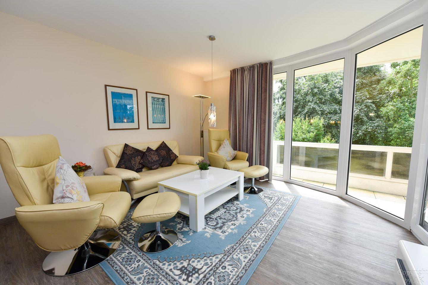Hochwertig eingerichtetes Ferienwohnung im Haus Trafalger mit Süd-Balkon, separatem Schlafzimmer, moderner Küche, komfortablem Wohnbereich und umfassender Unterhaltungstechnik.