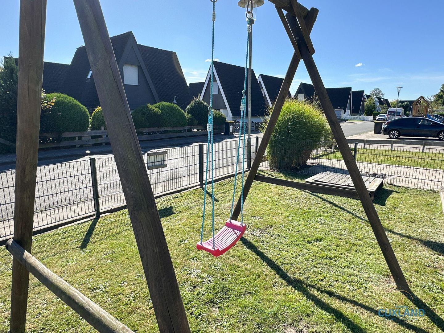 kleiner Garten mit Terrasse, Sandkiste und Schaukel für die Kids. Hinter dem