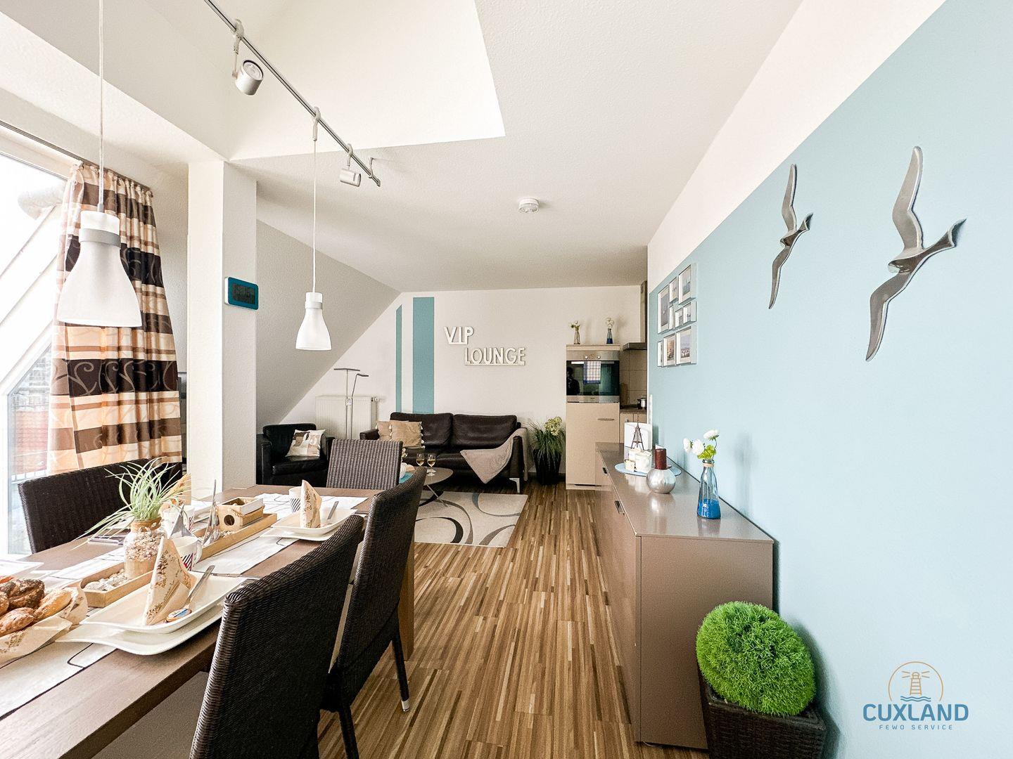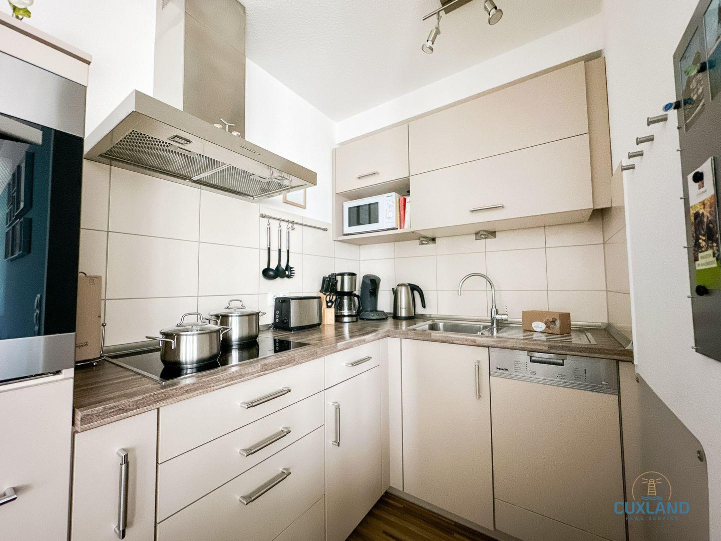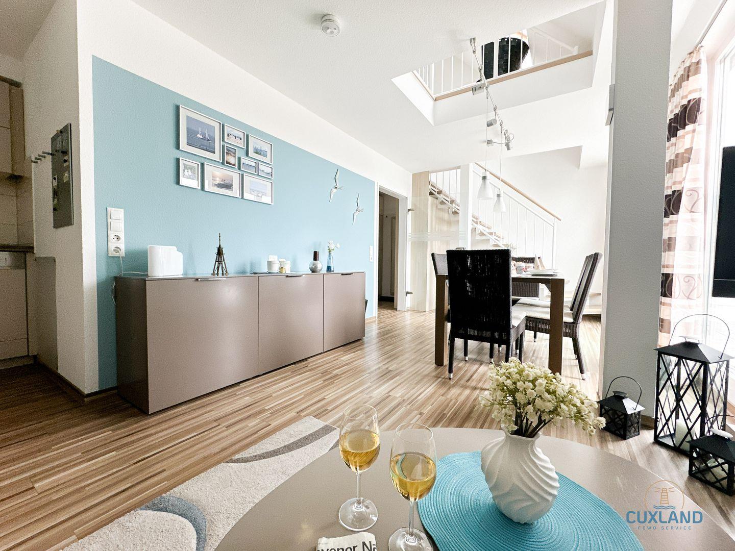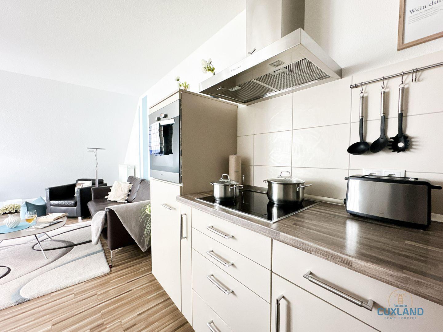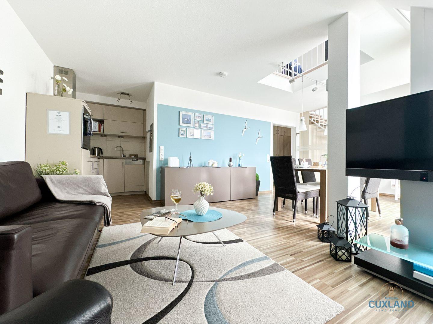 Hochwertige Ferienwohnung direkt am Strand! In der 3. Etage der Residenz Hohe Lith: Moderne Küche, Wohnraum mit TV und Stereoanlage, Essbereich für die Familie, Balkon. Über Treppe: 2 Schlafzimmer, zusätzliches Bad. 2. Schlafzimmer: Wahl zwischen Doppelbett oder zwei Einzelbetten. Kostenloses WLAN, reservierter PKW-Stellplatz.