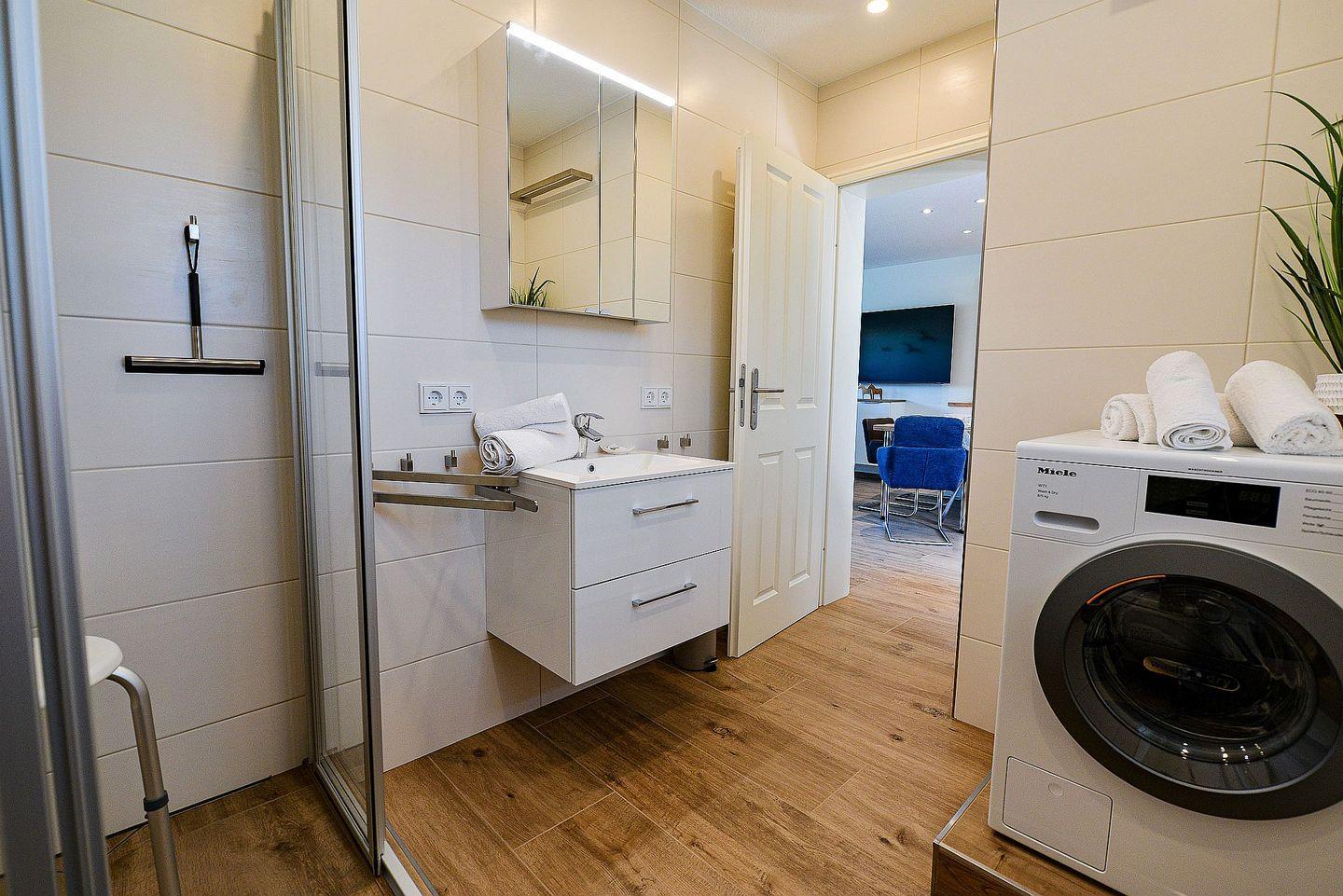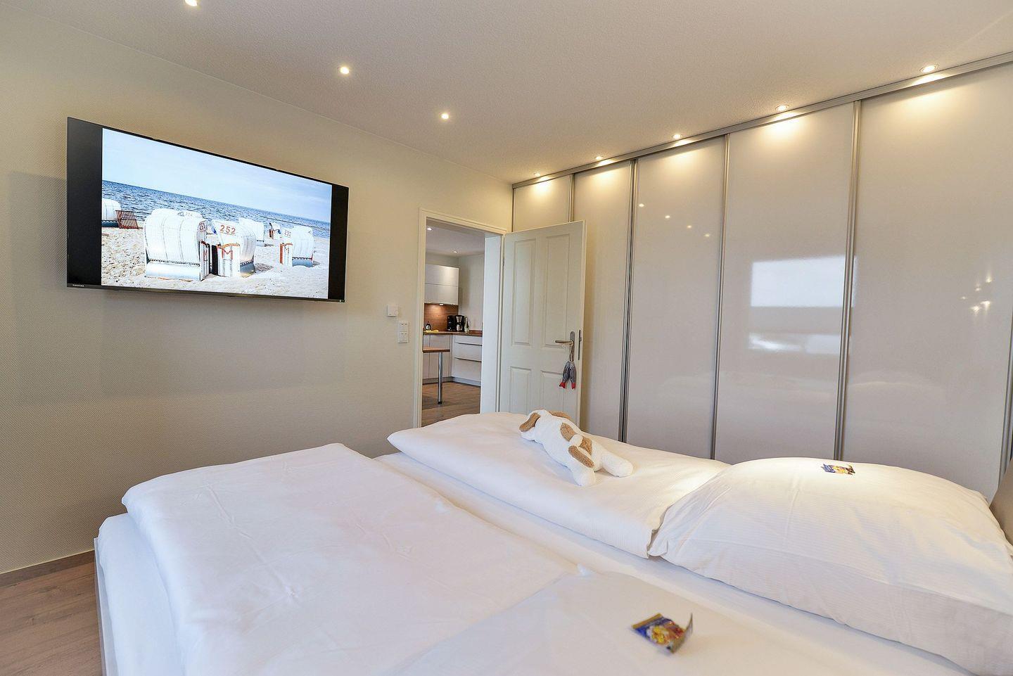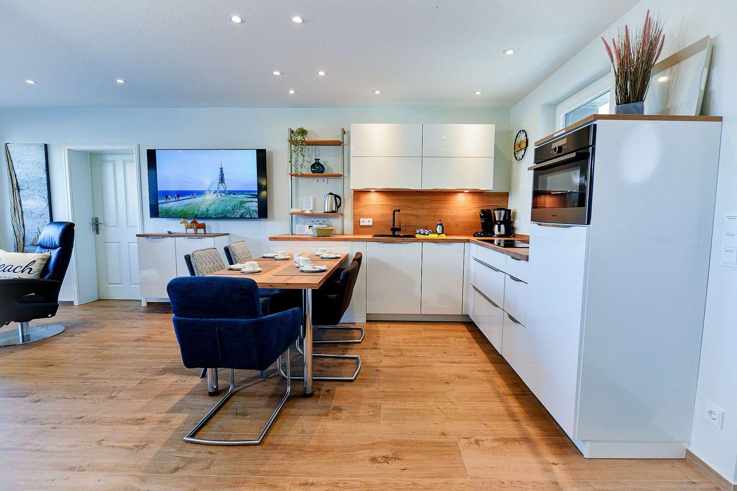 Die moderne Erdgeschosswohnung bietet zwei geschmackvoll eingerichtete Schlafzimmer (Doppel- und Einzelbett) sowie ein elegantes Schlafsofa im Wohnbereich. Eine offene, voll ausgestattete Küche, Fußbodenheizung, ein helles Tageslichtbad mit Miele-Waschtrockner, kostenfreies WLAN und drei Fernseher sorgen für höchsten Komfort.