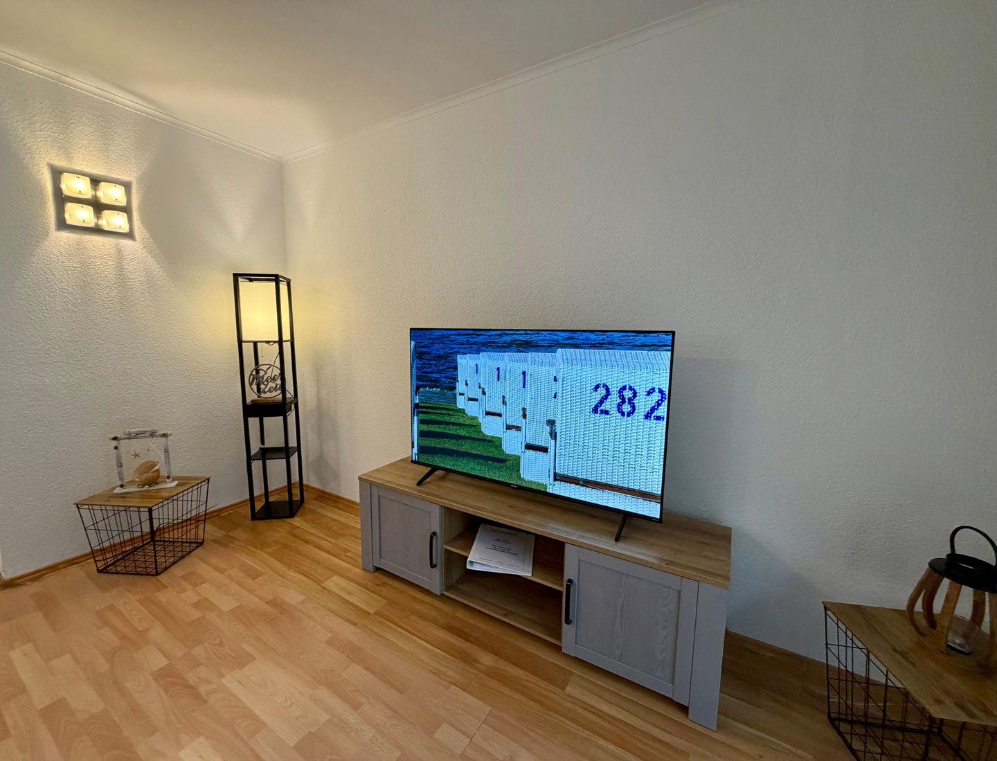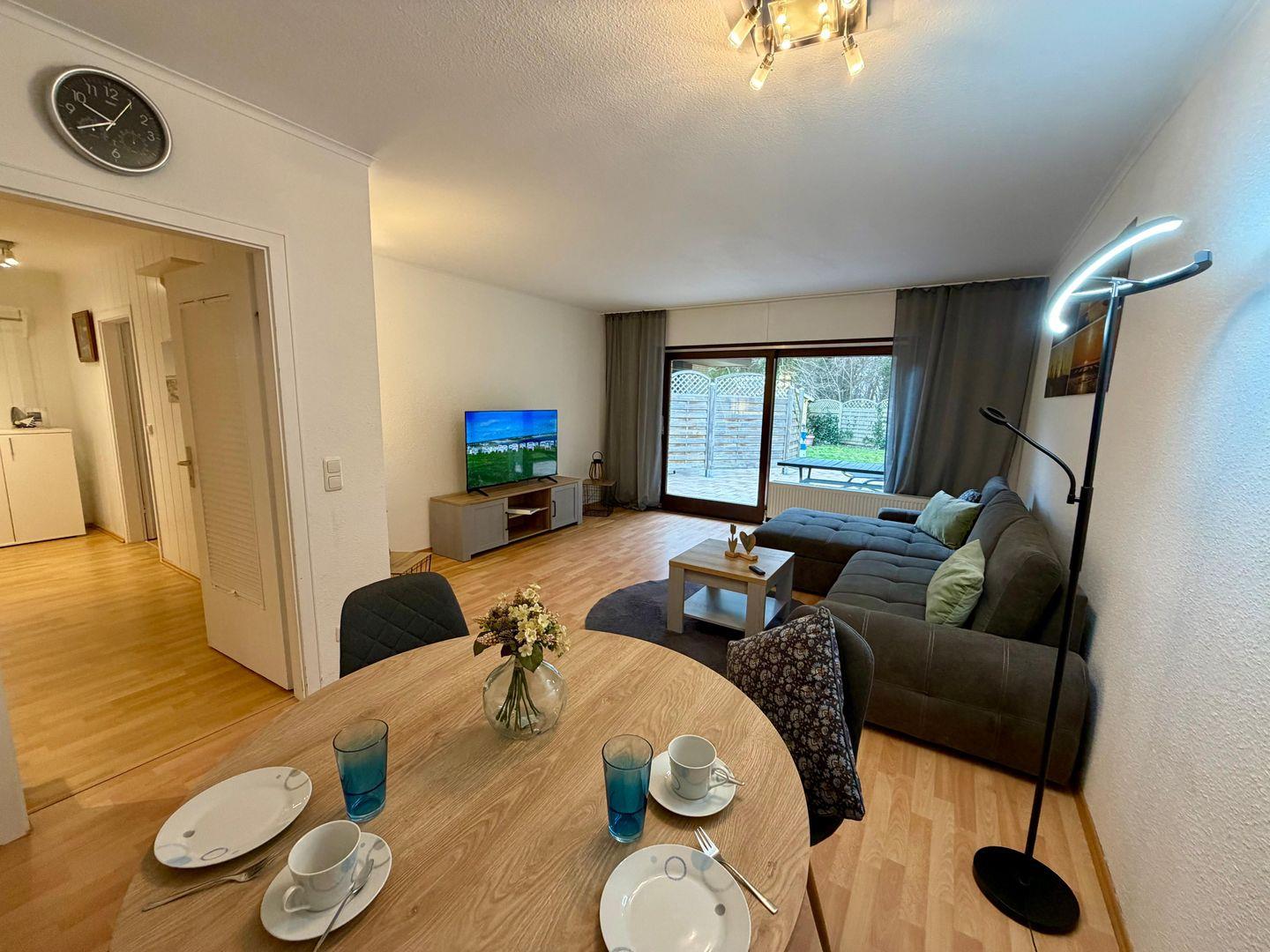 Ferienwohnung „StrandGlück“ in Cuxhaven-Duhnen – zentral und nur 10 Minuten vom Sandstrand entfernt. Wohnbereich mit Schlafsofa, separates Schlafzimmer, moderne Küche mit Spülmaschine, Terrasse mit Gartenmöbeln. WLAN & Kabel-TV inklusive. Ideal für Paare oder Familienurlaub an der Nordsee.