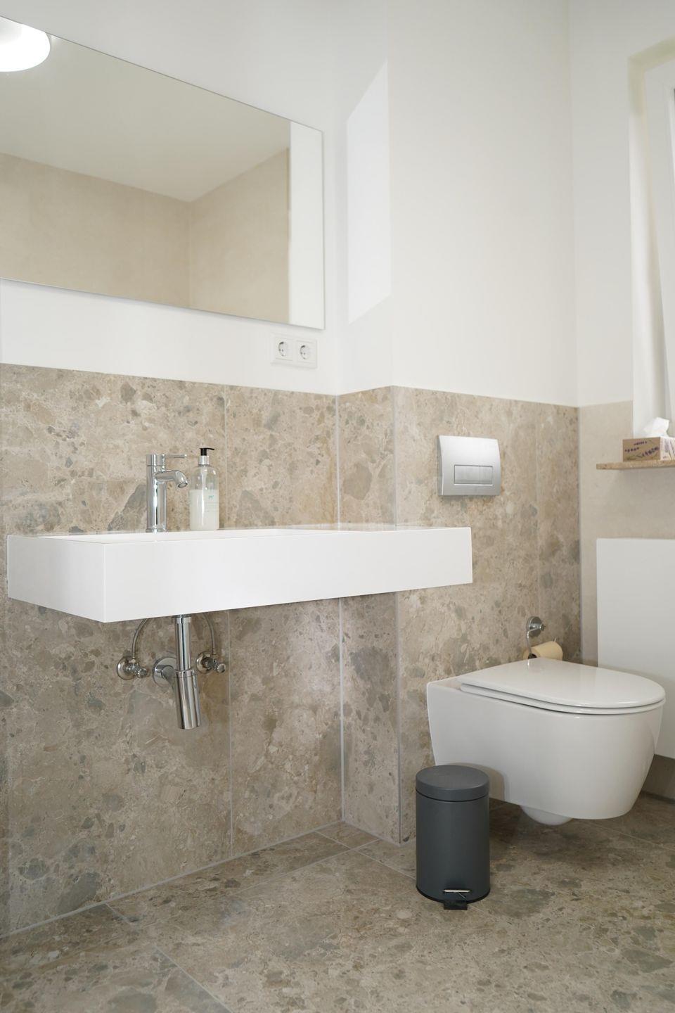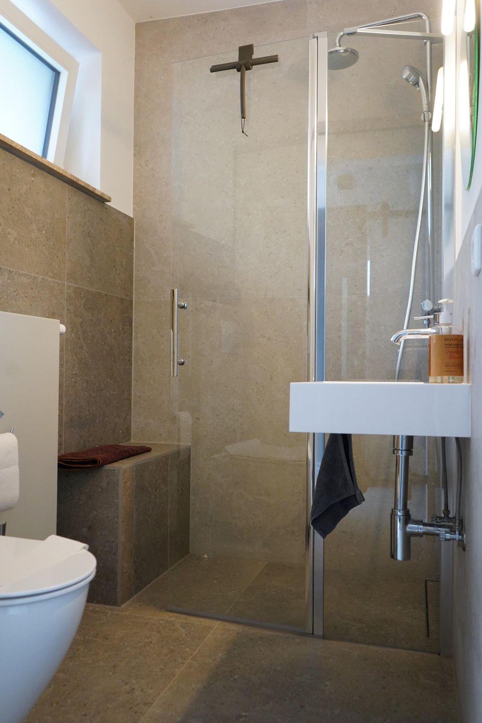Das stilvolle Badezimmer ist mit einer freistehenden Badewanne, einer Dusche, WC und Haartrockner ausgestattet. Ein zusätzliches kleines Bad vor der Wohnung mit Dusche & WC steht exklusiv den Gästen der Wohnung zur Verfügung – ideal nach einem entspannten Tag am Strand.