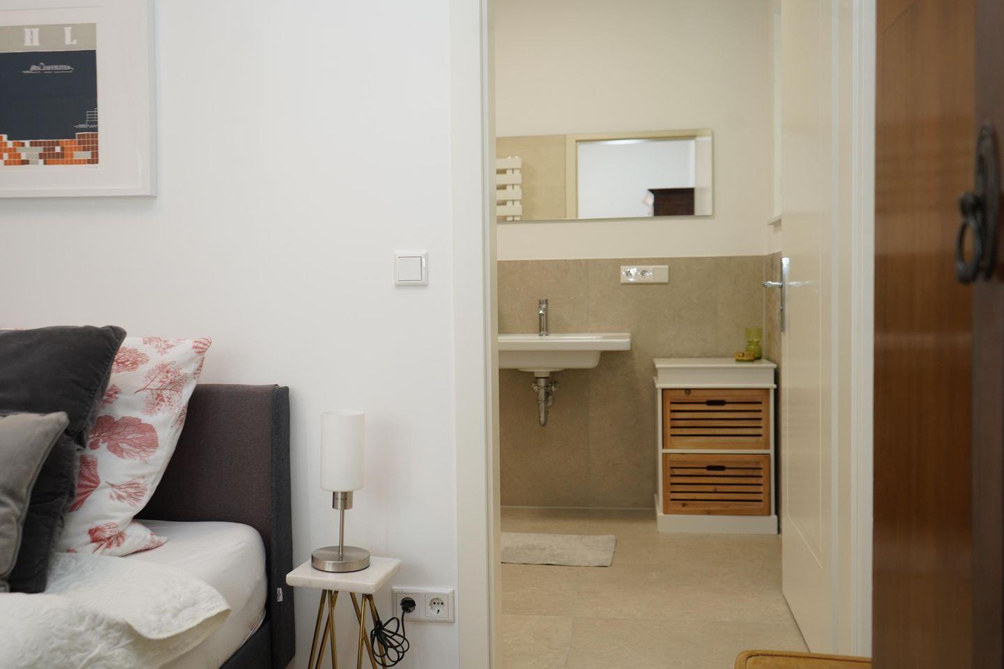 Im Schlafzimmer erwartet dich ein komfortables Boxspring-Doppelbett, in dem du jede Nacht entspannt schlafen wirst. Das moderne Badezimmer ist mit einer ebenerdigen Dusche und einem WC ausgestattet und verfügt außerdem über einen Haartrockner.