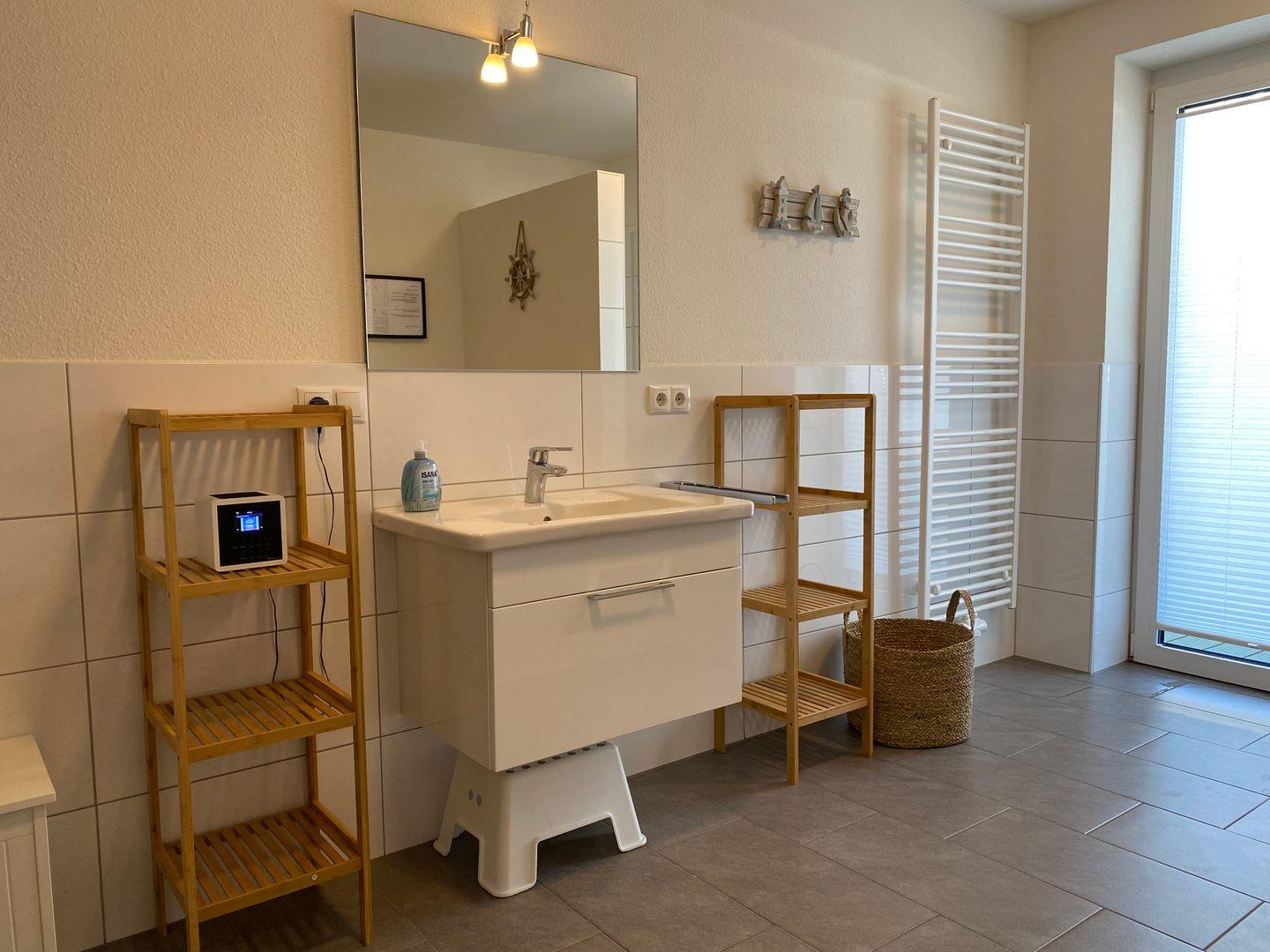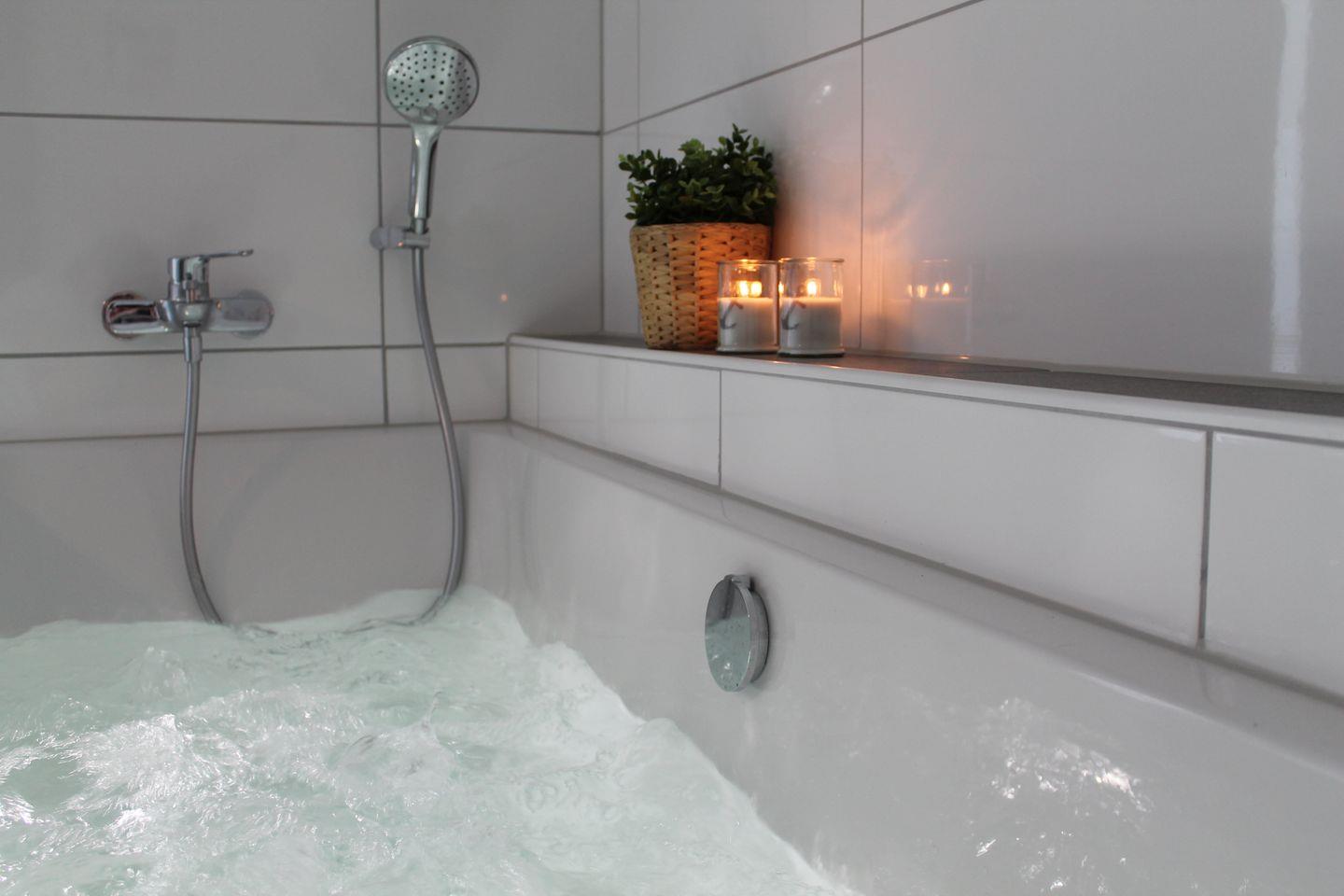 Das Badezimmer bietet Wellness auf Knopfdruck: Genieße eine Auszeit in der privaten Sauna, eine entspannende Whirlpool-Badewanne oder eine erfrischende Dusche. Hier kannst du Körper und Geist verwöhnen – perfekt auch an stürmischen Nordseetagen.
