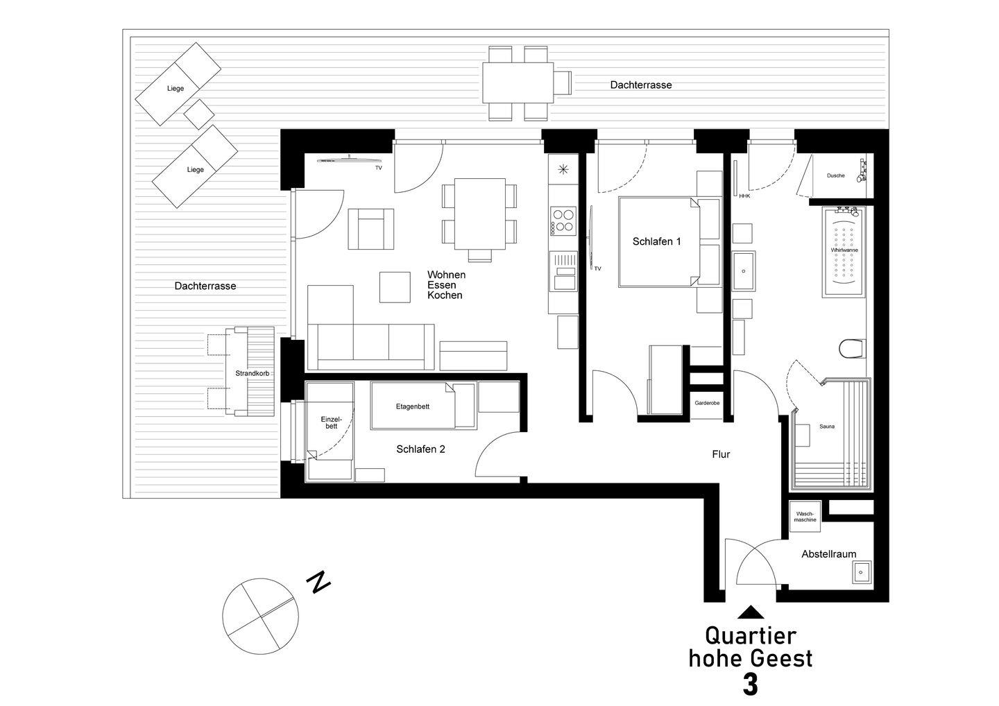 Erholung für die Großen, Abenteuer für die Kleinen – in der familienfreundlichen Ferienwohnung „Quartier Hohe Geest 3“ erwartet dich ein Urlaub voller Komfort und Entspannung. Auf 86?m², nur 300?m vom Strand entfernt, findest du eine exklusive Ausstattung mit Wellnessbad, großer Terrasse, zwei Schlafzimmern und zahlreichen Spiel- und Serviceextras für die ganze Familie.
