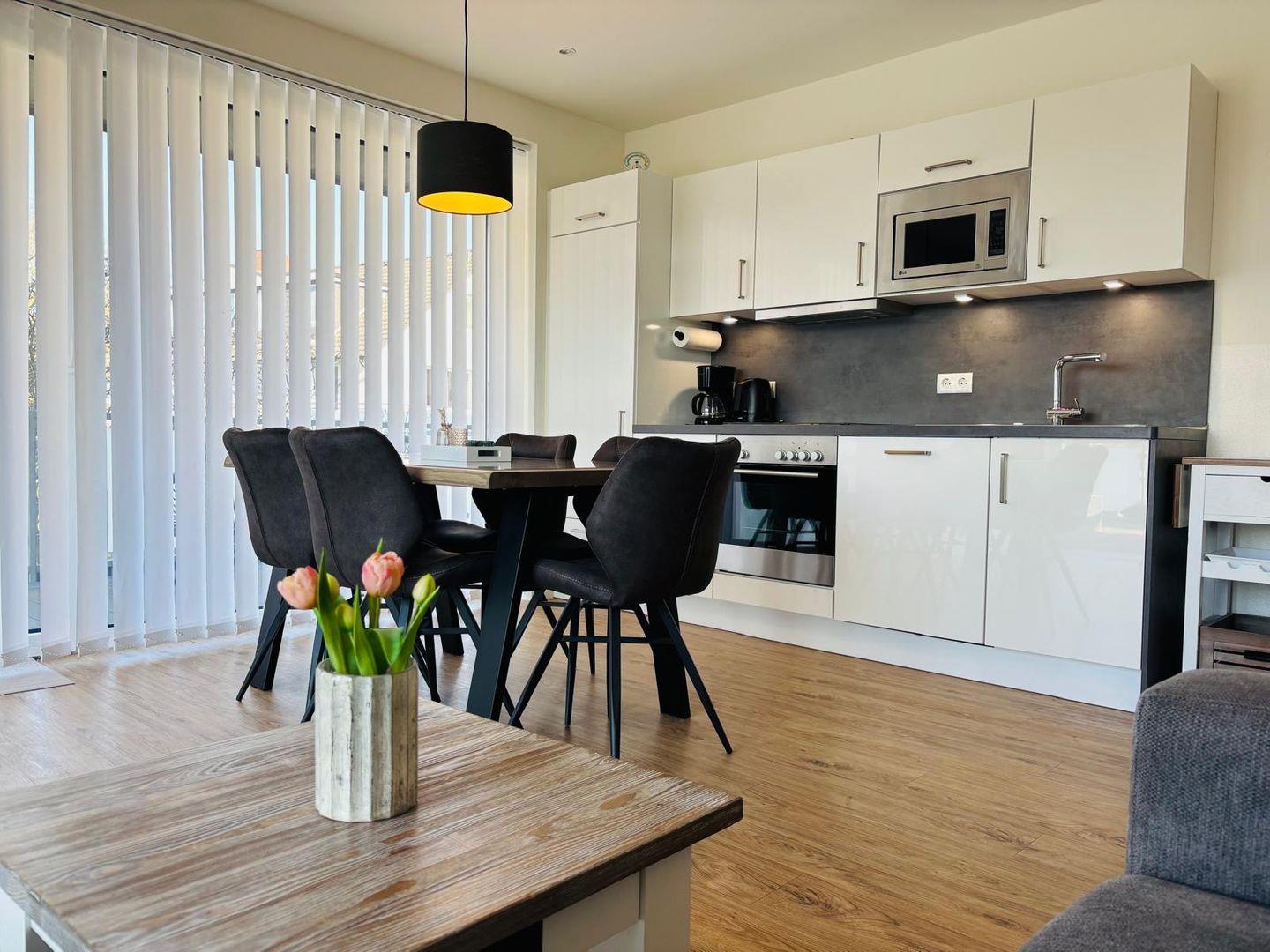 Im großzügigen Wohnbereich mit gemütlicher Sofaecke, Spielekonsole und Unterhaltungselektronik kannst du dich rundum wohlfühlen – sei es beim gemeinsamen Filmabend oder beim Lesen und Spielen. Die offene Küche ist vollständig ausgestattet – vom Milchaufschäumer bis zum Toaster – und lädt zum gemeinsamen Kochen ein. Der angrenzende Essbereich ist perfekt für gesellige Mahlzeiten oder Spieleabende.