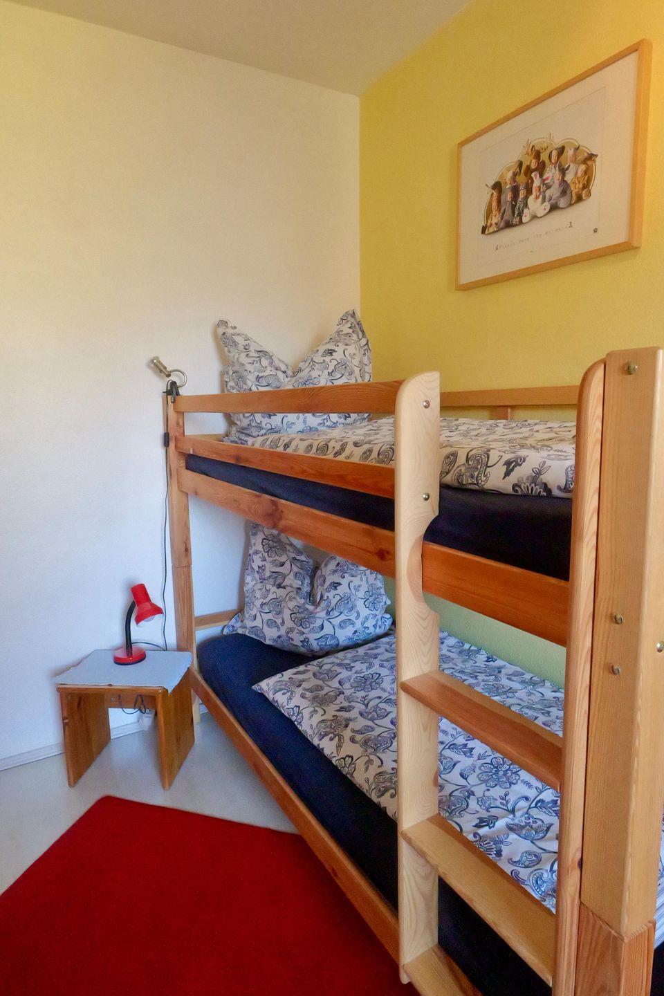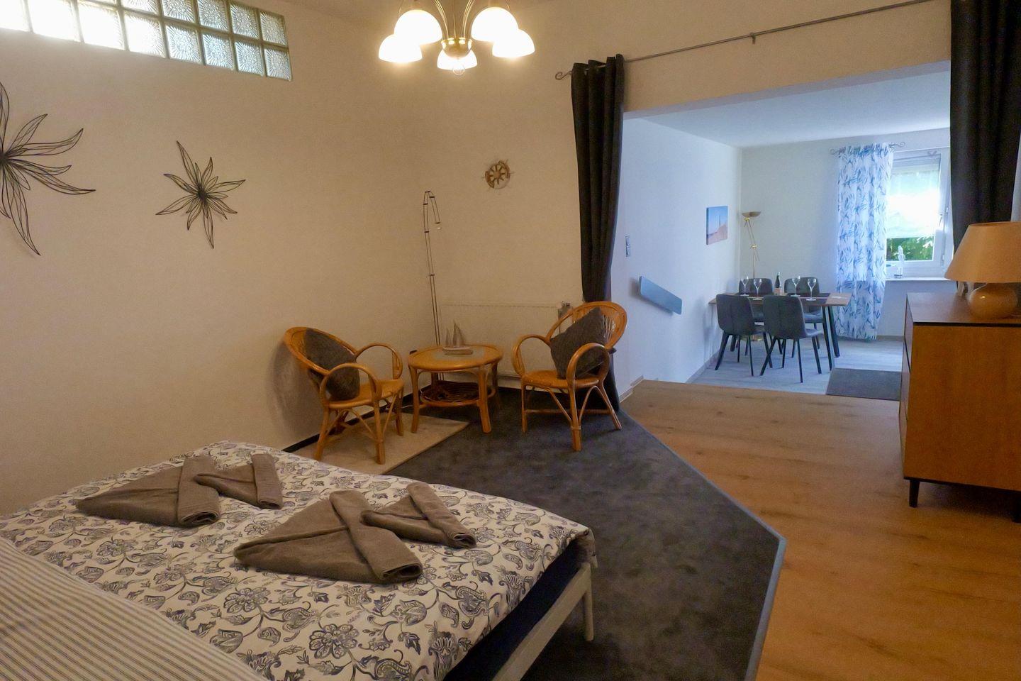 Die Ferienwohnung verfügt über zwei liebevoll eingerichtete Schlafzimmer. Eines der Schlafzimmer ist als Durchgangszimmer zum großzügigen Wohn- und Essbereich gestaltet – ideal für Familien oder vertraute Reisegruppen.