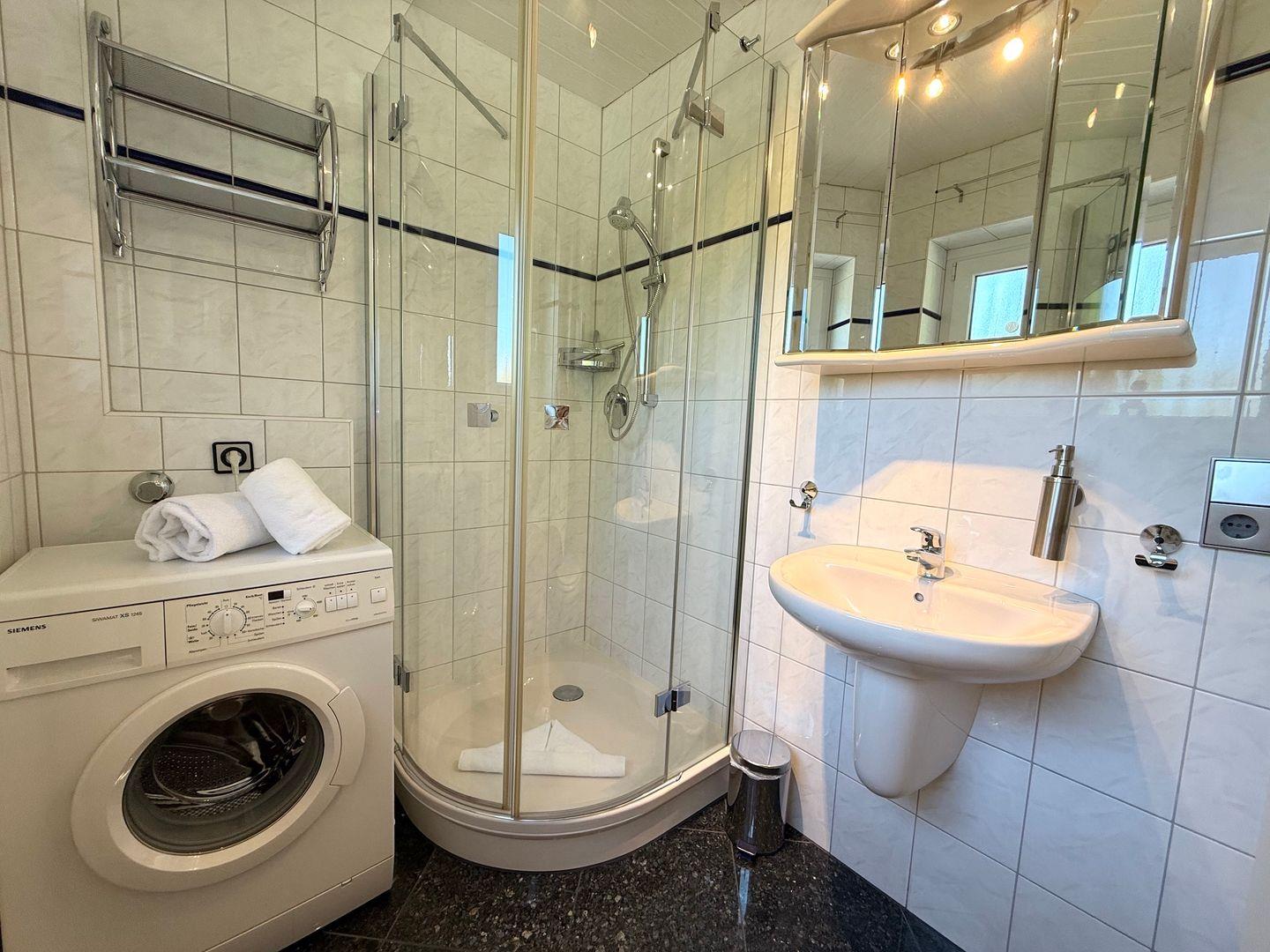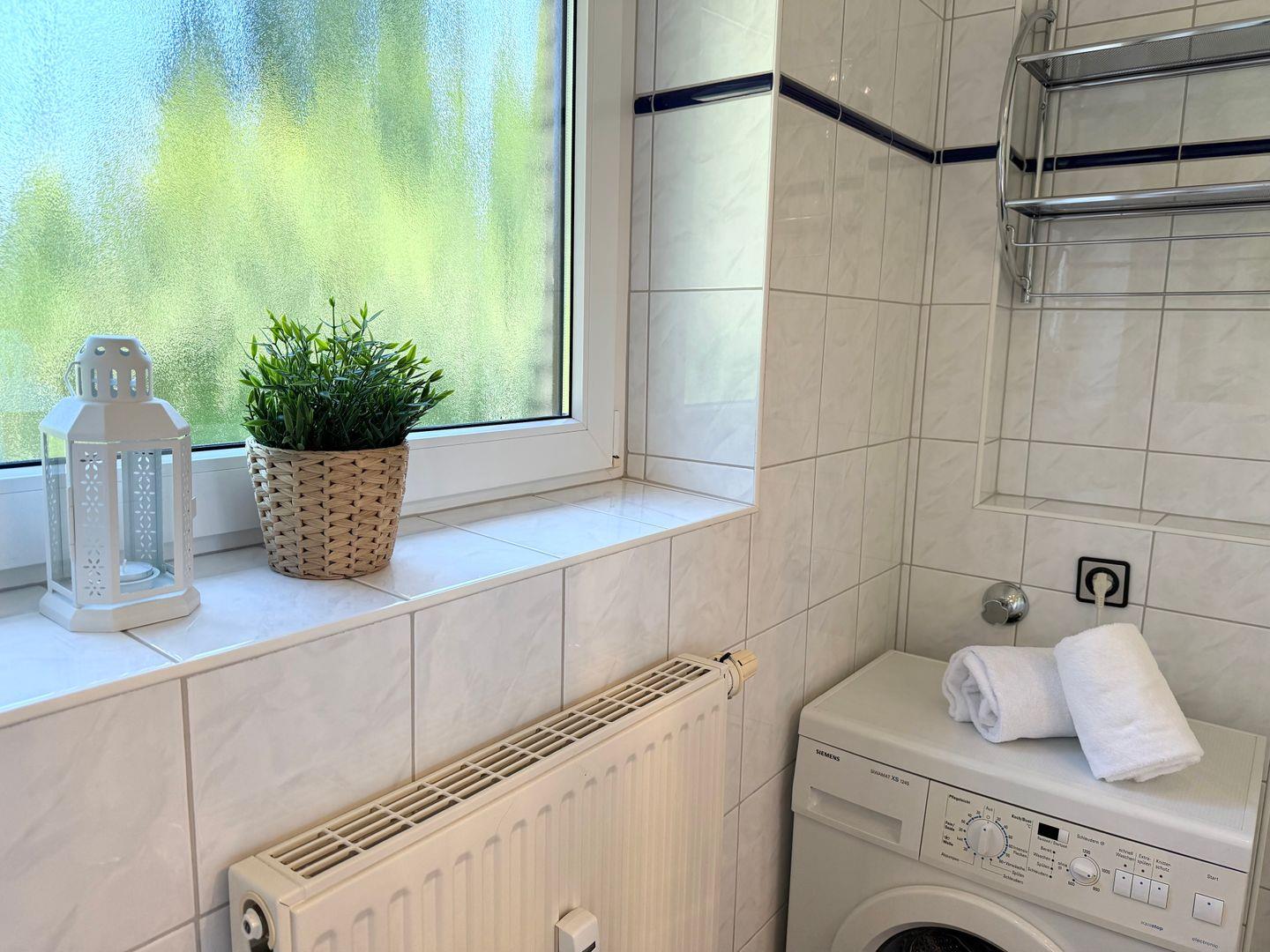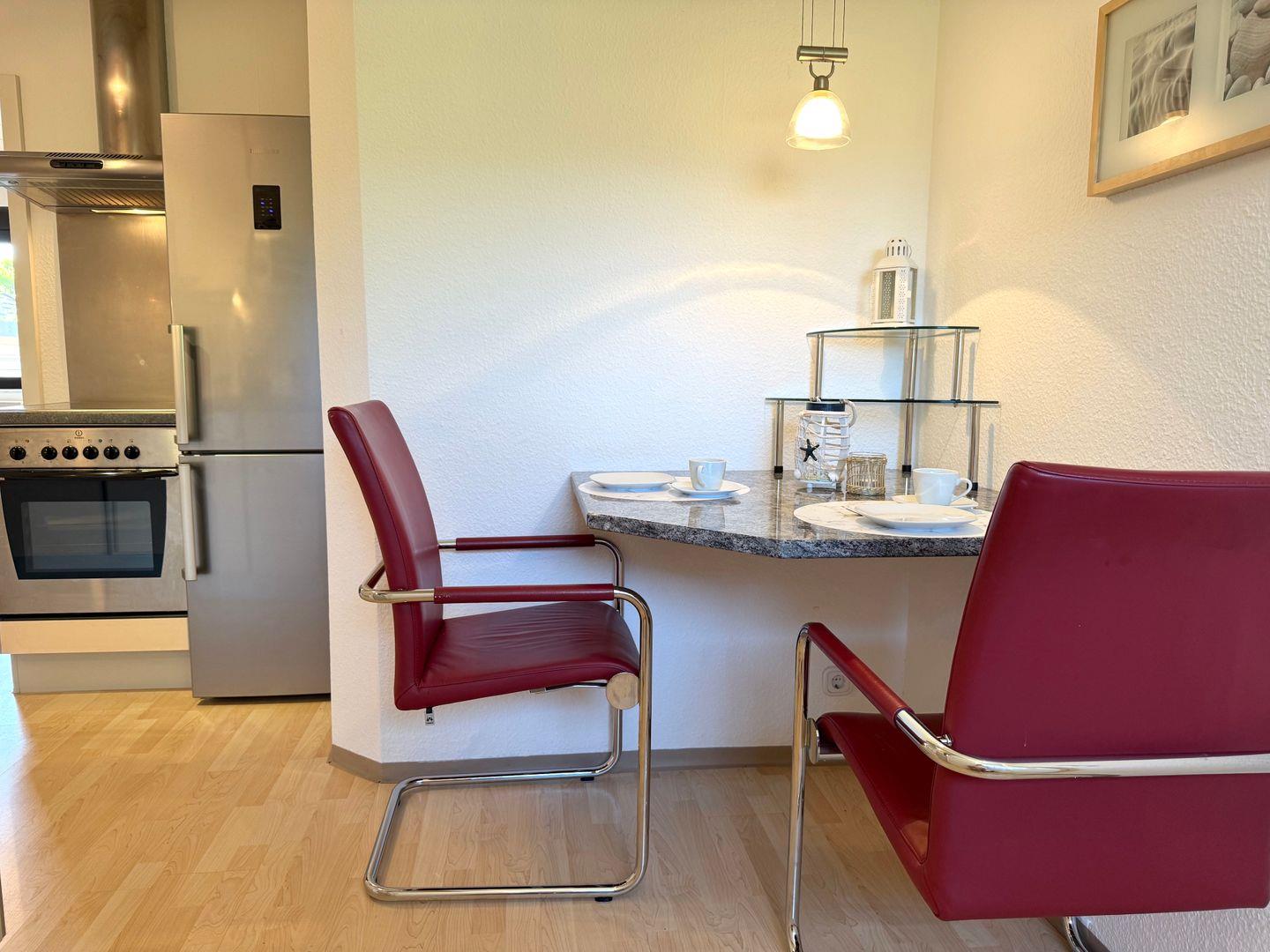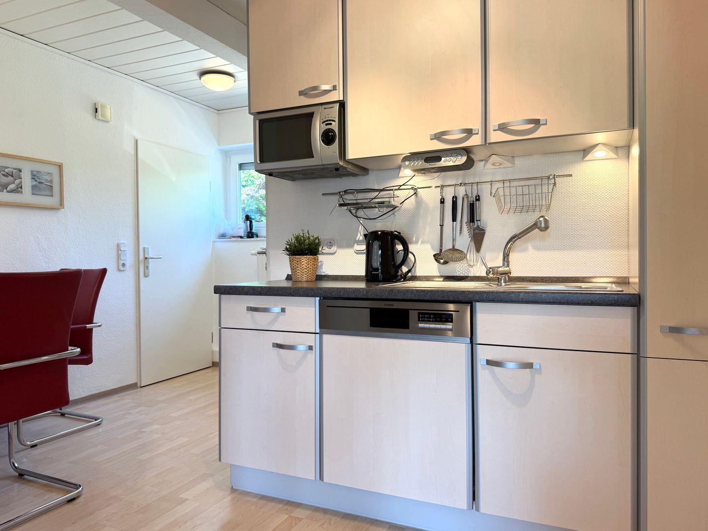 Die Küche der Wohnung ist vollständig eingerichtet: Zur Ausstattung gehören ein Herd, Backofen, Mikrowelle, Kühlschrank, Kaffeemaschine, Wasserkocher, Toaster sowie Geschirr und Besteck. Umfangreiche Küchengeräte ermöglichen es Ihnen, auch im Urlaub flexibel und komfortabel zu kochen. Durch die Eigennutzung einer Waschmaschine gestalten Sie Ihren Aufenthalt auch für längere Zeiträume unabhängig und praktisch.