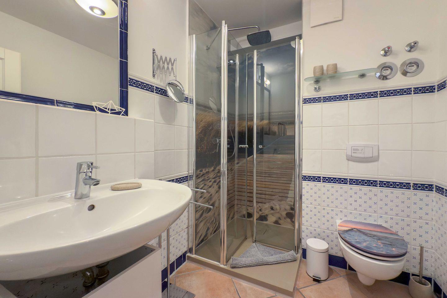 Das Badezimmer ist mit einer komfortablen Dusche, WC, Haartrockner, Spiegel und einem zusätzlichen Kosmetikspiegel ausgestattet. Neben Waschmaschine und Trockner – gemeinschaftlich gegen Gebühr nutzbar – steht Ihnen auch ein eigener Wäscheständer zur Verfügung.