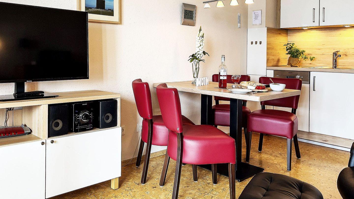 Die Wohnung im 3. Obergeschoss ist hochwertig ausgestattet und verfügt über ein separates Schlafzimmer mit Doppelbett und TV, einen Wohnbereich mit voll eingerichteter Küche, zweitem Fernseher, kostenfreiem WLAN sowie durchgehender Fußbodenheizung. Ein neues Bad mit Dusche und WC sorgt für zusätzlichen Komfort.
