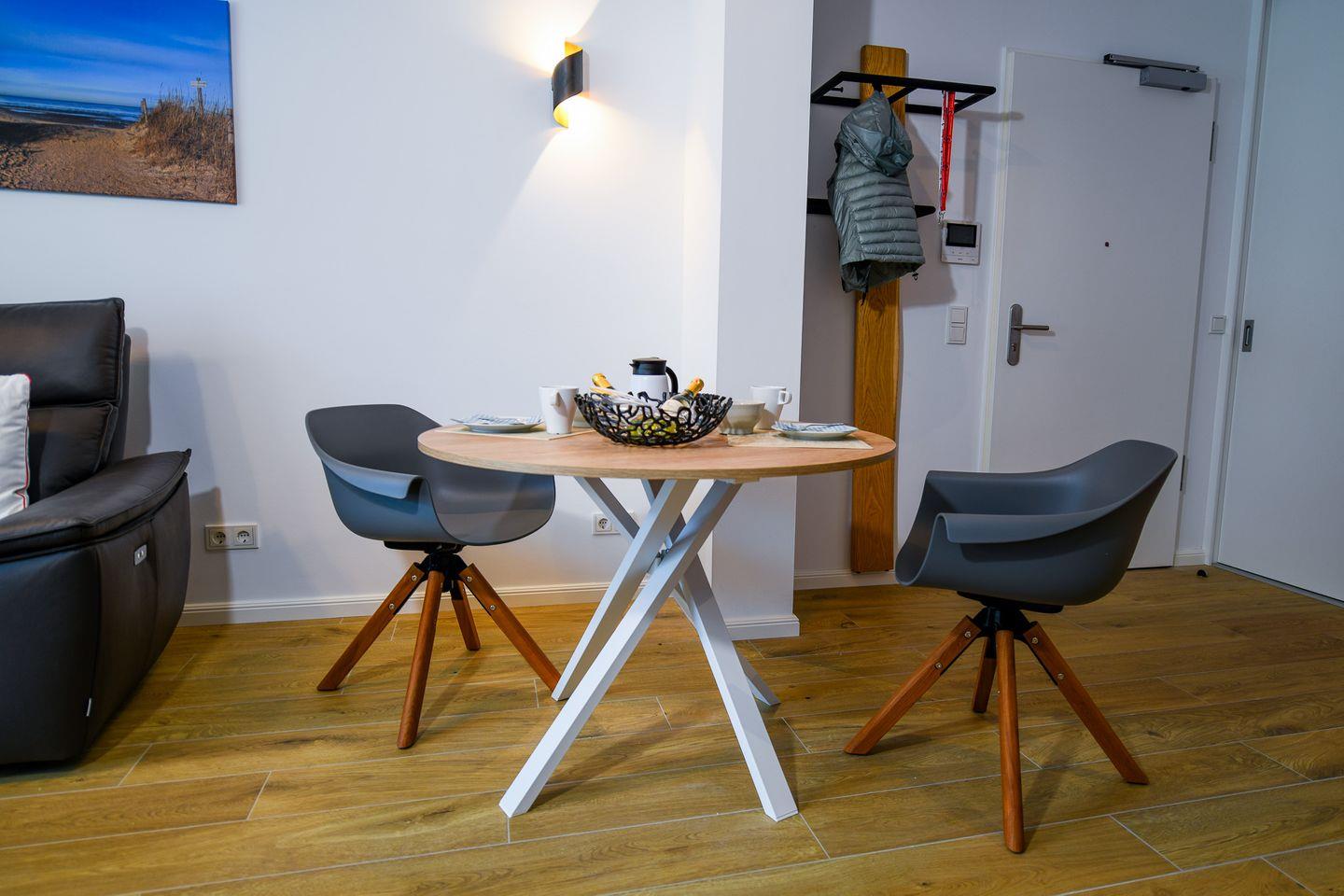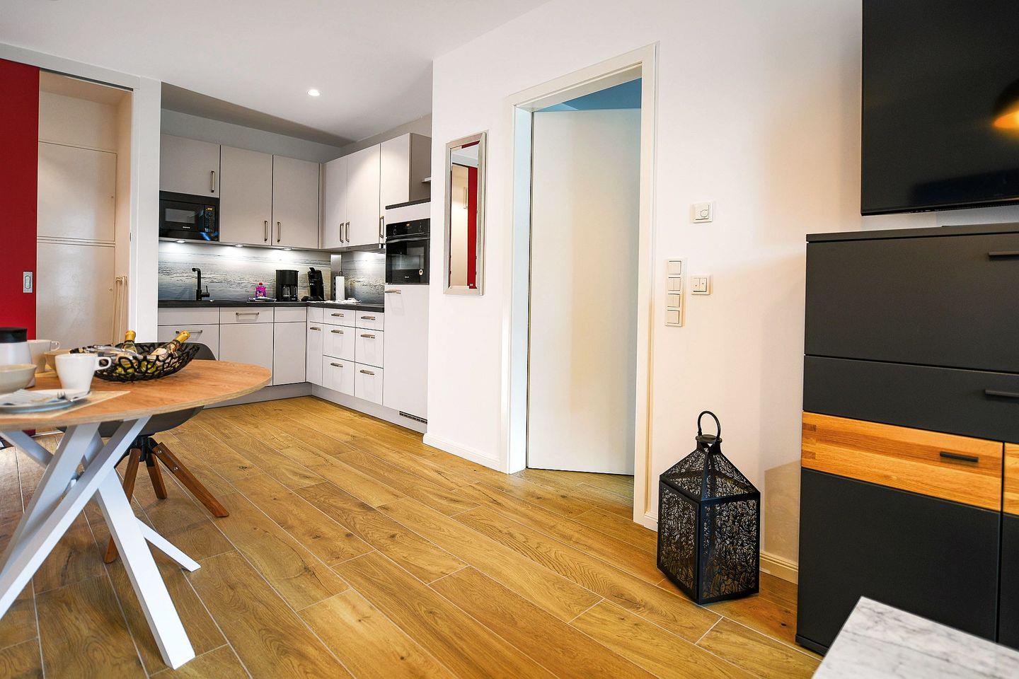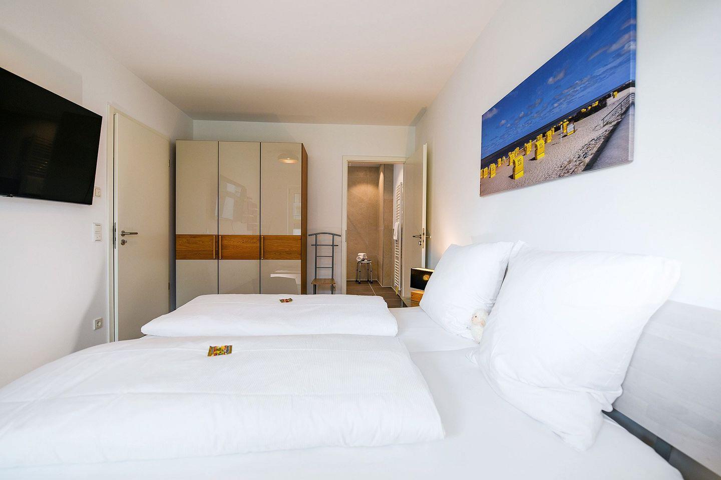 Die helle Zwei-Raum-Wohnung für 2 Personen bietet ein stilvolles Schlafzimmer mit hochwertigem Doppelbett und TV, einen offenen Wohn- und Essbereich mit Smart-TV sowie eine voll ausgestattete Küchenzeile. Das großzügige Bad verfügt über eine bodengleiche Dusche mit Duschhocker, Fußbodenheizung und modernen Komfort. Auf der möblierten Terrasse können Sie wunderbar entspannen, die Sonne genießen und die frische Nordseeluft spüren. Ein kostenfreier Tiefgaragenstellplatz (Nr. 126) und ein Fahrradabstellplatz stehen ebenfalls zur Verfügung.