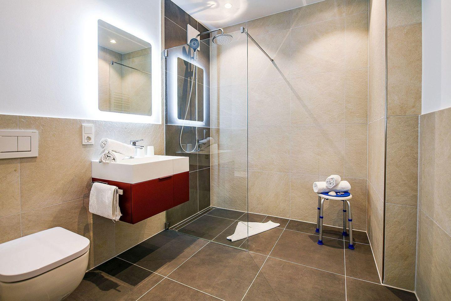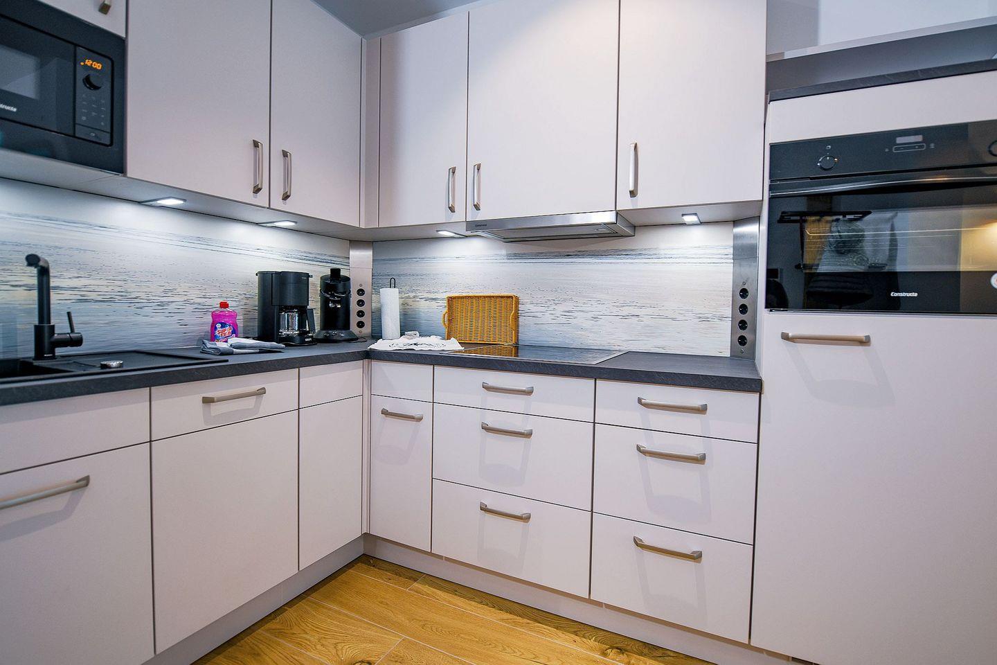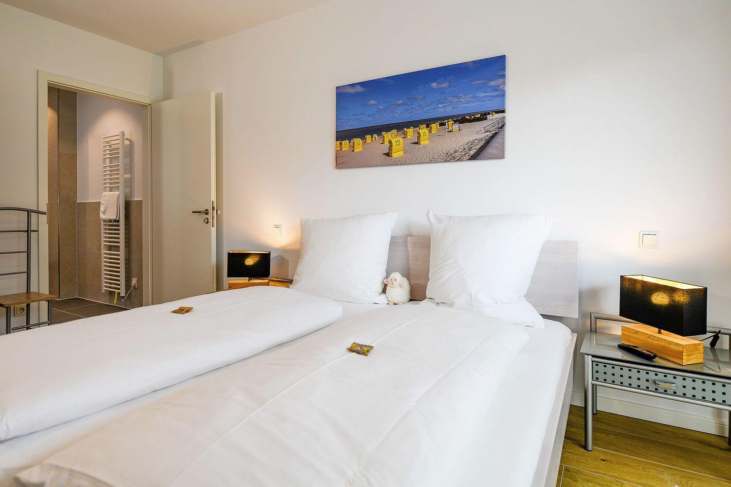 Die helle Zwei-Raum-Wohnung für 2 Personen bietet ein stilvolles Schlafzimmer mit hochwertigem Doppelbett und TV, einen offenen Wohn- und Essbereich mit Smart-TV sowie eine voll ausgestattete Küchenzeile. Das großzügige Bad verfügt über eine bodengleiche Dusche mit Duschhocker, Fußbodenheizung und modernen Komfort. Auf der möblierten Terrasse können Sie wunderbar entspannen, die Sonne genießen und die frische Nordseeluft spüren. Ein kostenfreier Tiefgaragenstellplatz (Nr. 126) und ein Fahrradabstellplatz stehen ebenfalls zur Verfügung.