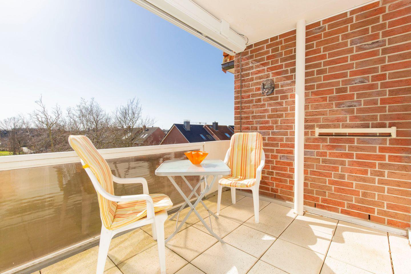 Der nach Süden ausgerichtete Balkon lädt mit bequemen Balkonmöbeln zu Sonnenbädern an der salzigen Nordseeluft ein. Zu jeder Tageszeit können unsere Gäste hier entspannen und ihren Urlaub in Ruhe genießen.