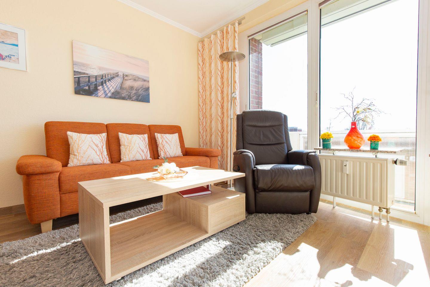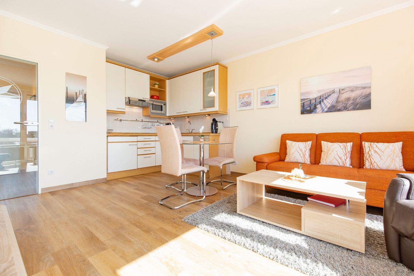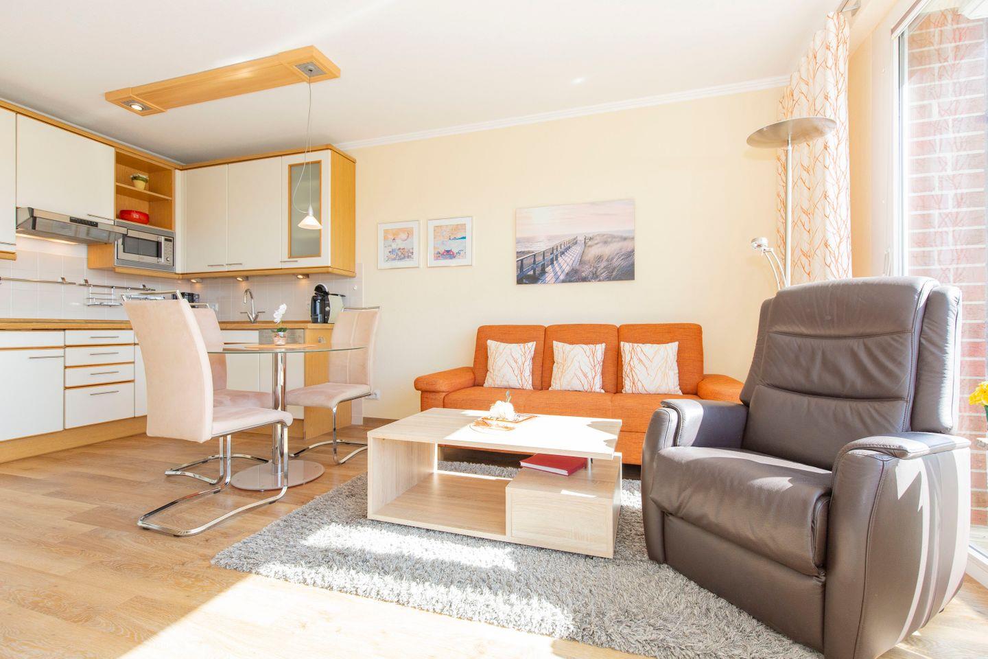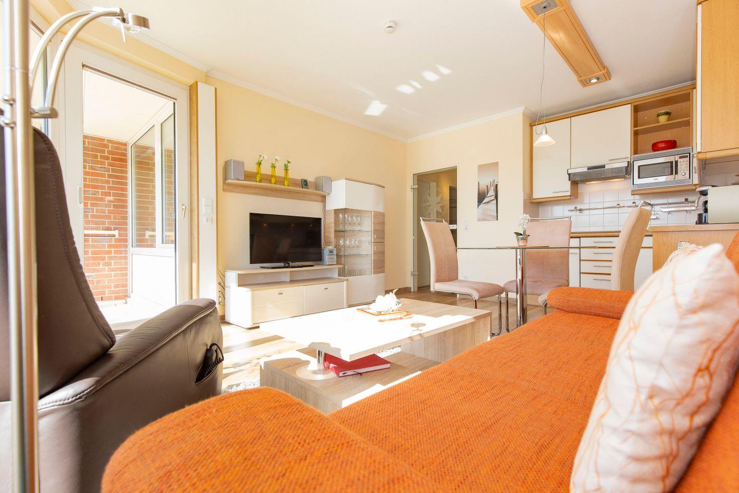Haus "Trafalgar", Typ B, Appartement-Nr. 244, bis 2 Pers., 2.Etage, ca. 46 qm, Südseite (ohne Seesicht), Schlafzimmer mit Doppelbett, Wohnbereich mit Sofa und Relax-Sessel, Küchenzeile mit 4-Platten-Ceranfeld, Geschirrspüler und Mikrowelle, Dusche/WC, Fön, Balkon, Kabel-TV, kostenloser W-Lan Zugang im App. Tiefgaragenstellplatz, Nichtraucherwohnung, Strandkorb in den Sommermonaten 2026.