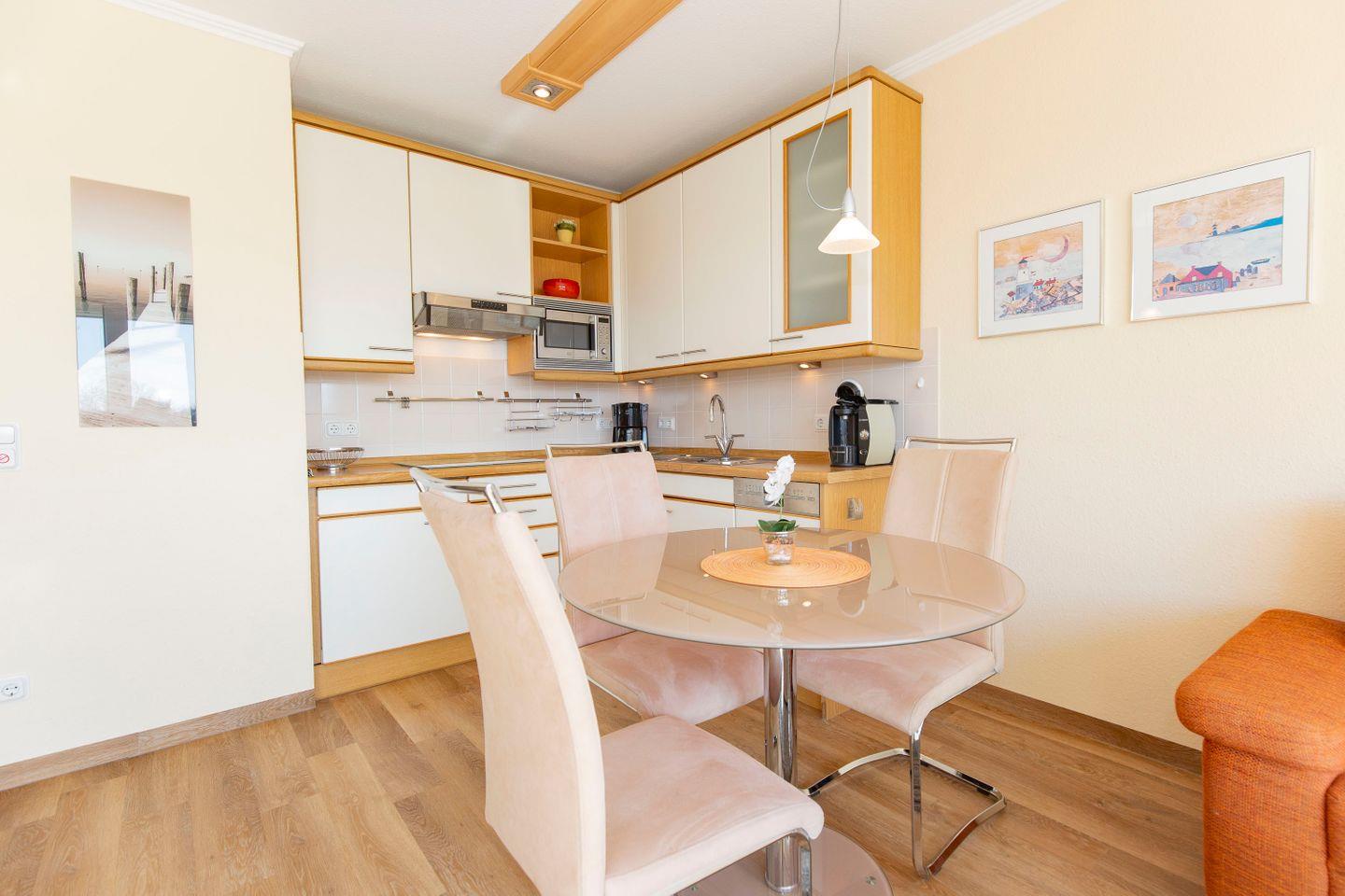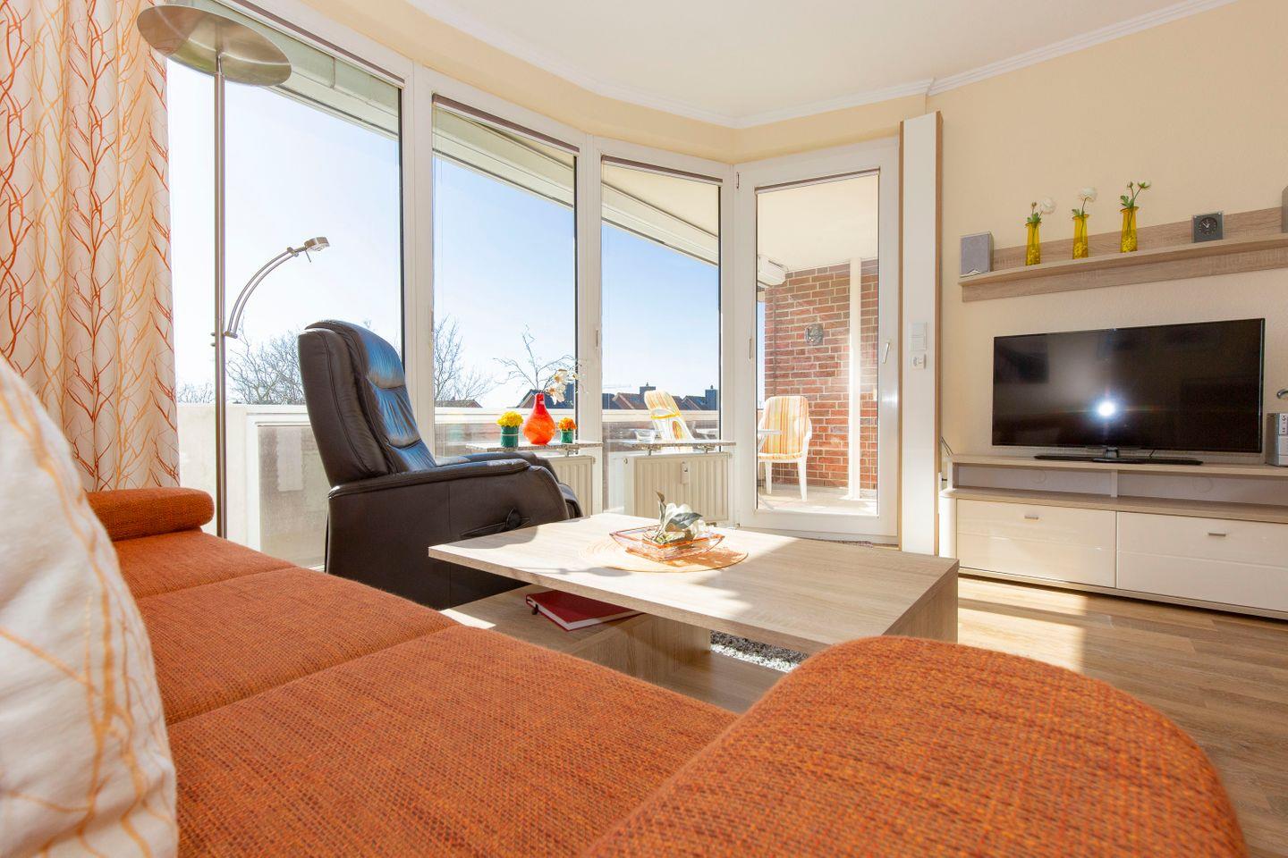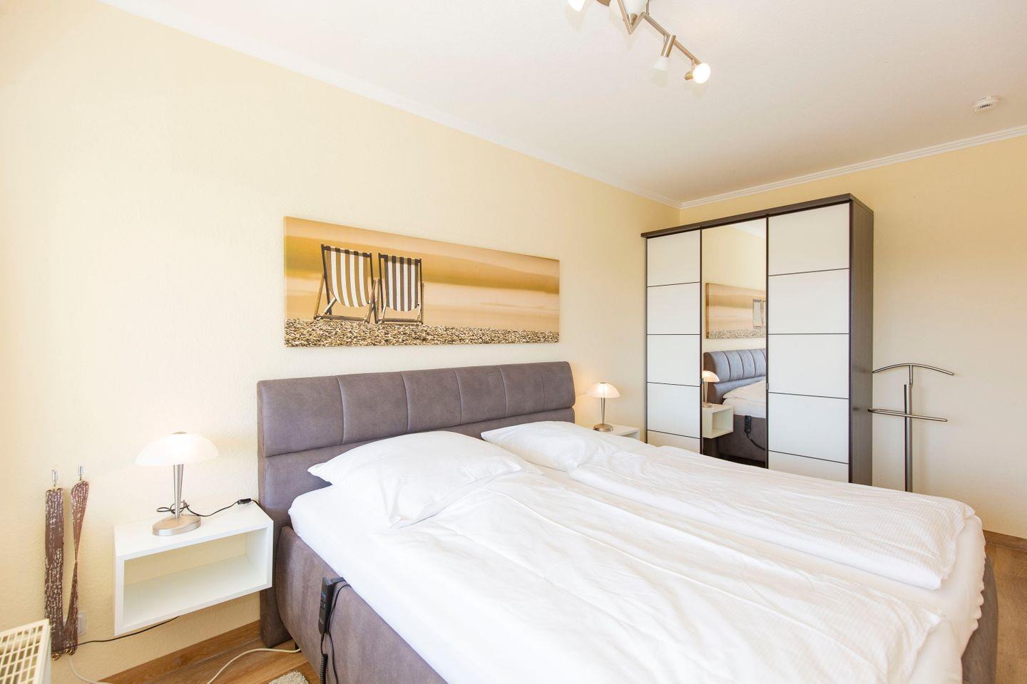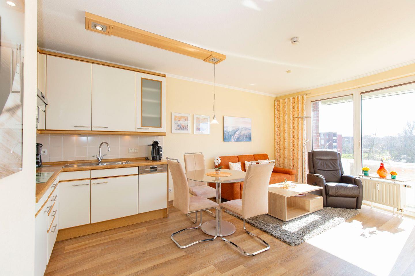 Haus "Trafalgar", Typ B, Appartement-Nr. 244, bis 2 Pers., 2.Etage, ca. 46 qm, Südseite (ohne Seesicht), Schlafzimmer mit Doppelbett, Wohnbereich mit Sofa und Relax-Sessel, Küchenzeile mit 4-Platten-Ceranfeld, Geschirrspüler und Mikrowelle, Dusche/WC, Fön, Balkon, Kabel-TV, kostenloser W-Lan Zugang im App. Tiefgaragenstellplatz, Nichtraucherwohnung, Strandkorb in den Sommermonaten 2026.